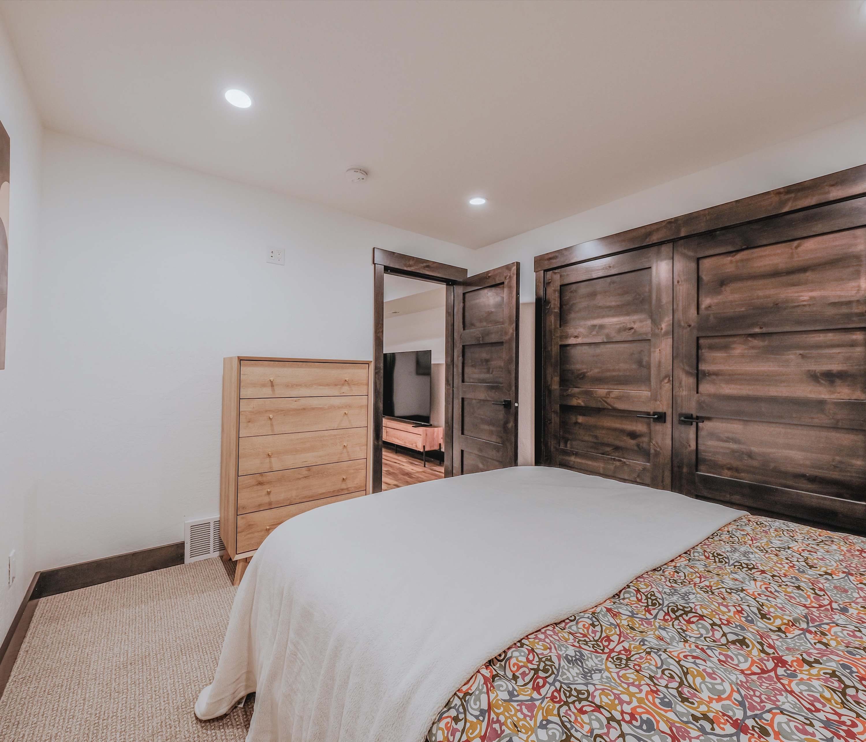 Bedroom #2 includes a queen size bed, a smart TV, and an ensuite bathroom with a single vanity and a walk-in shower.