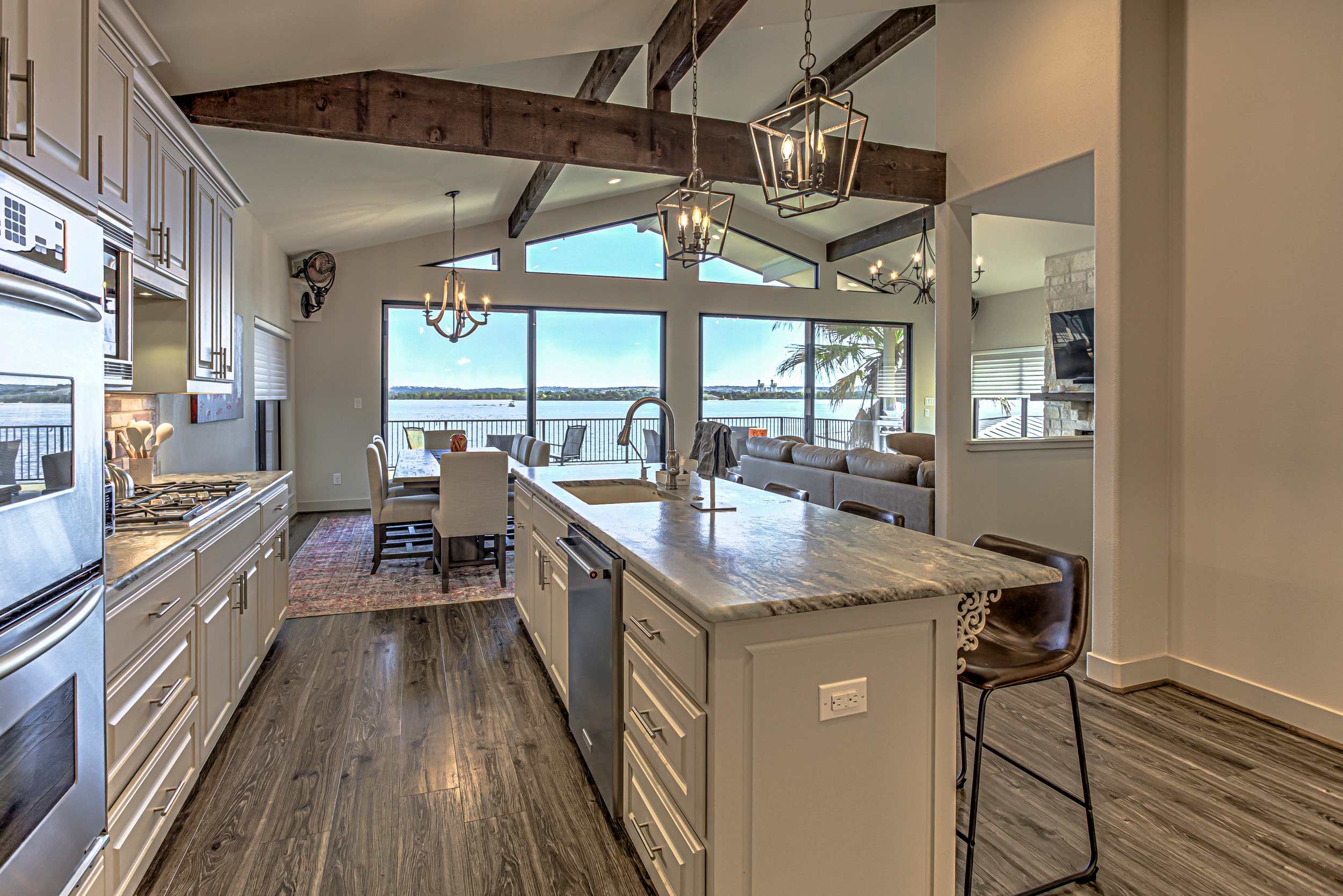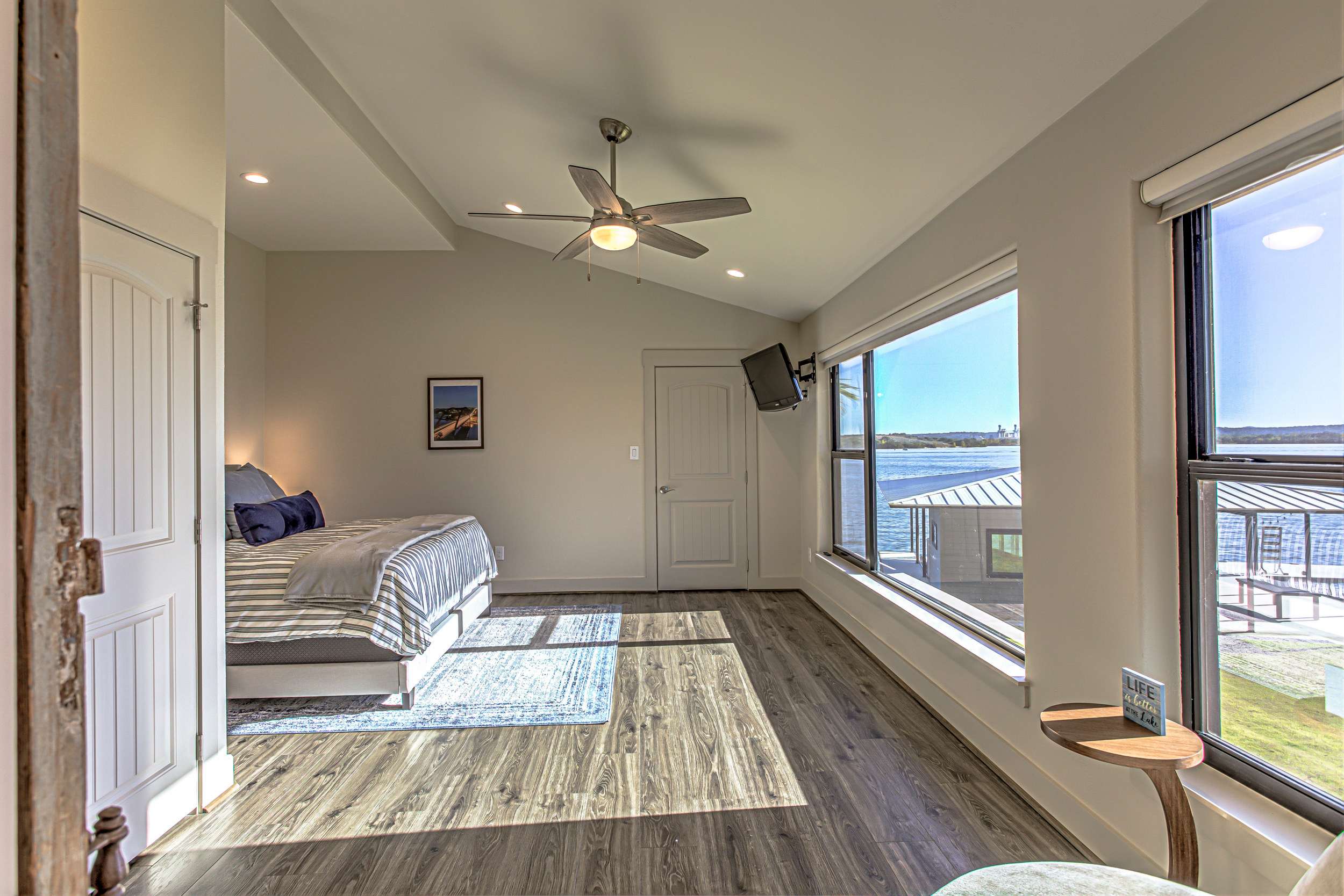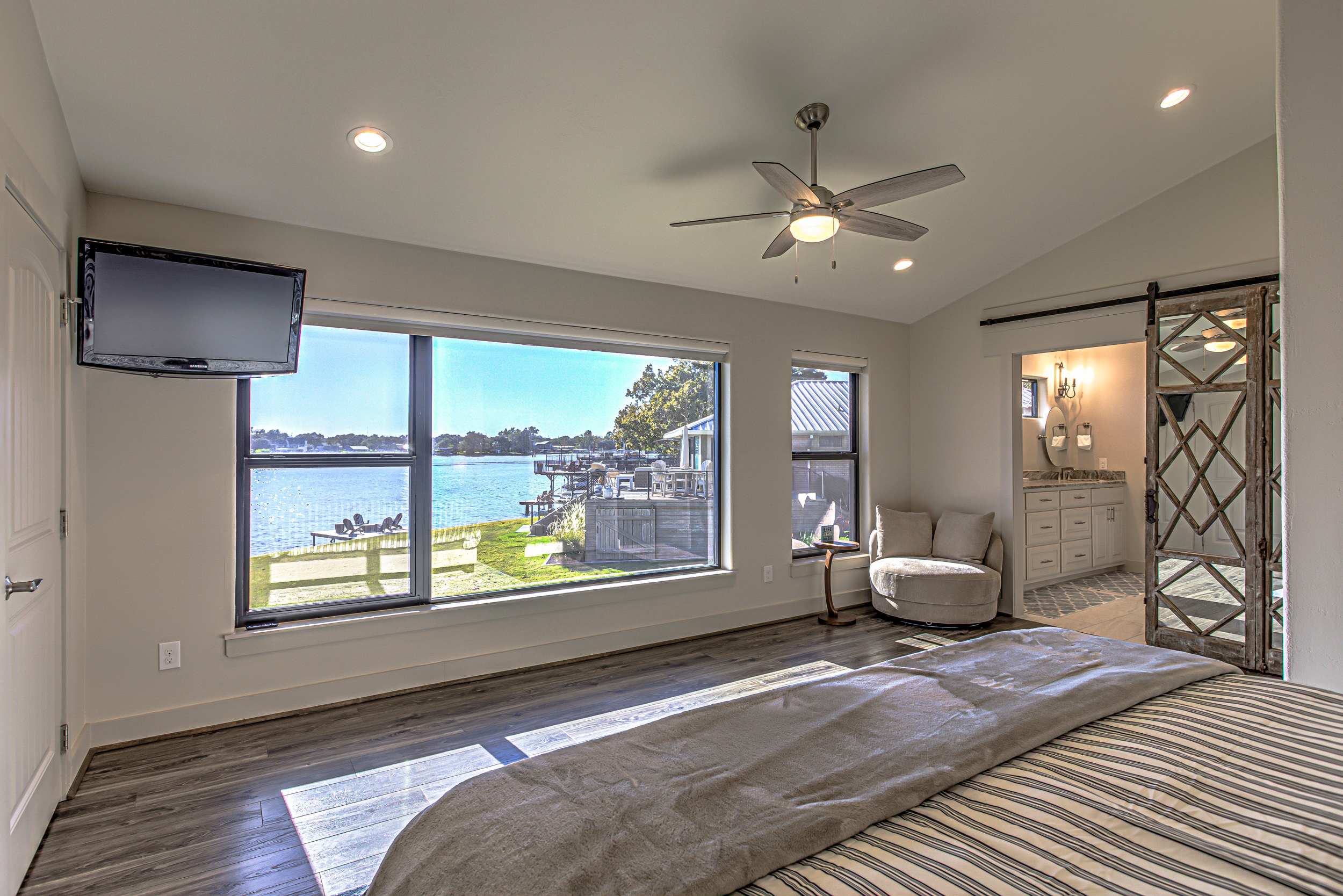 • Bedroom 2 (1st floor): King bed, smart TV, view of Lake LBJ, ensuite bathroom with double vanity and walk-in shower
