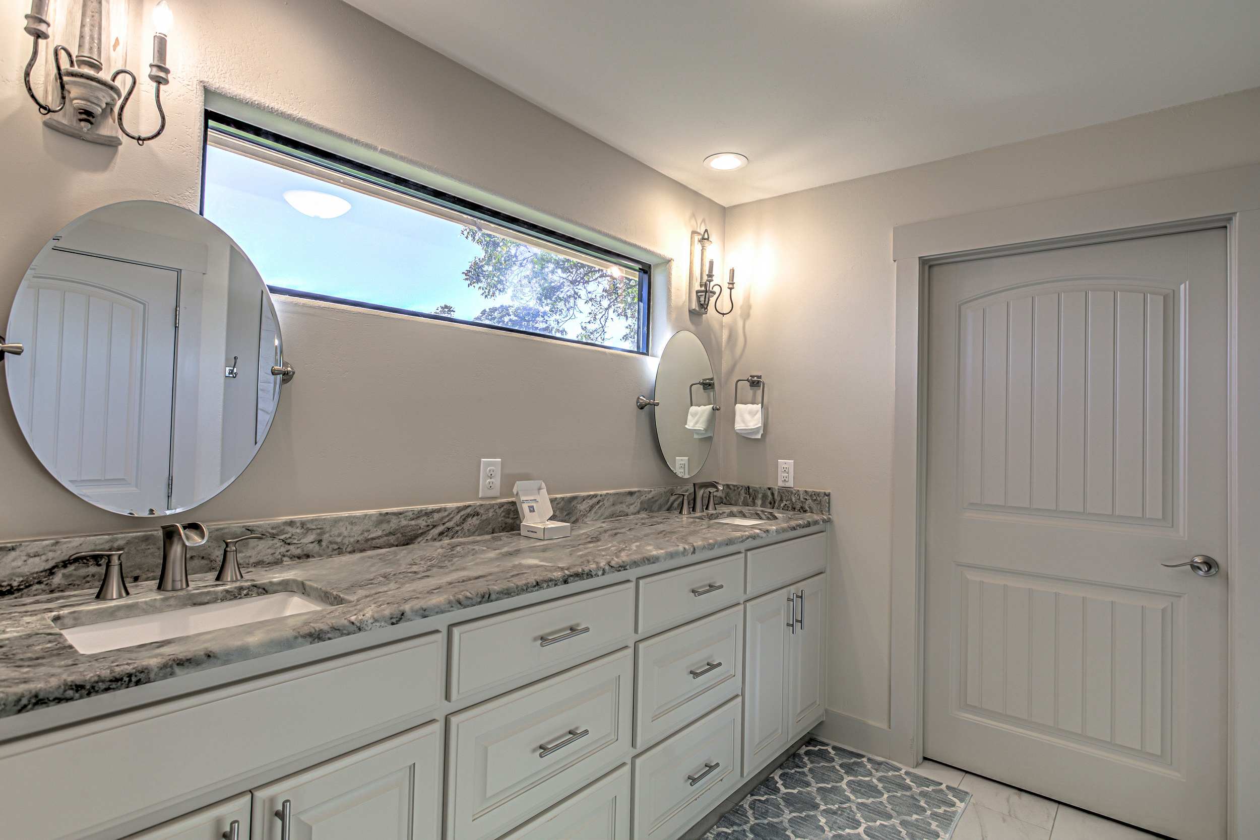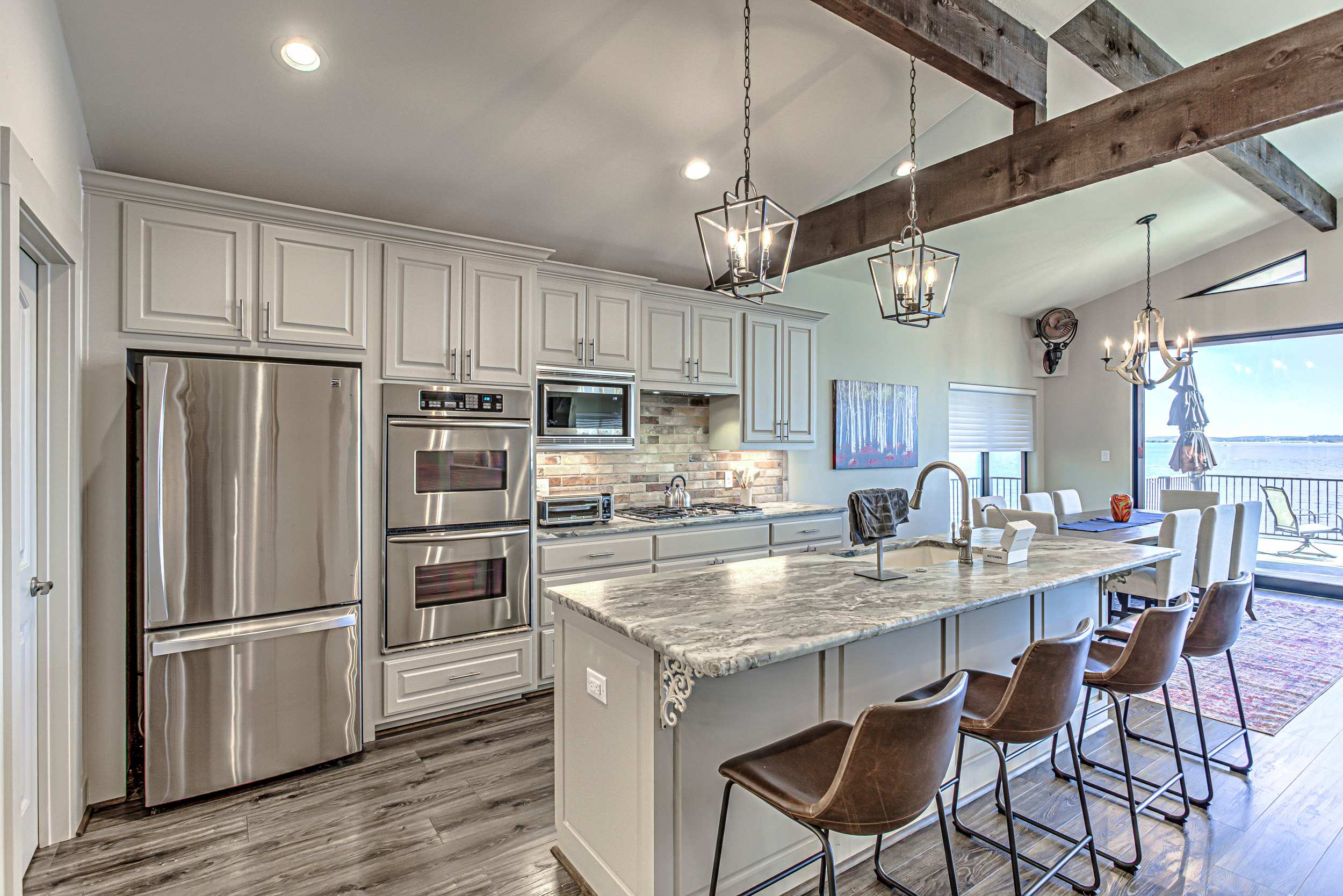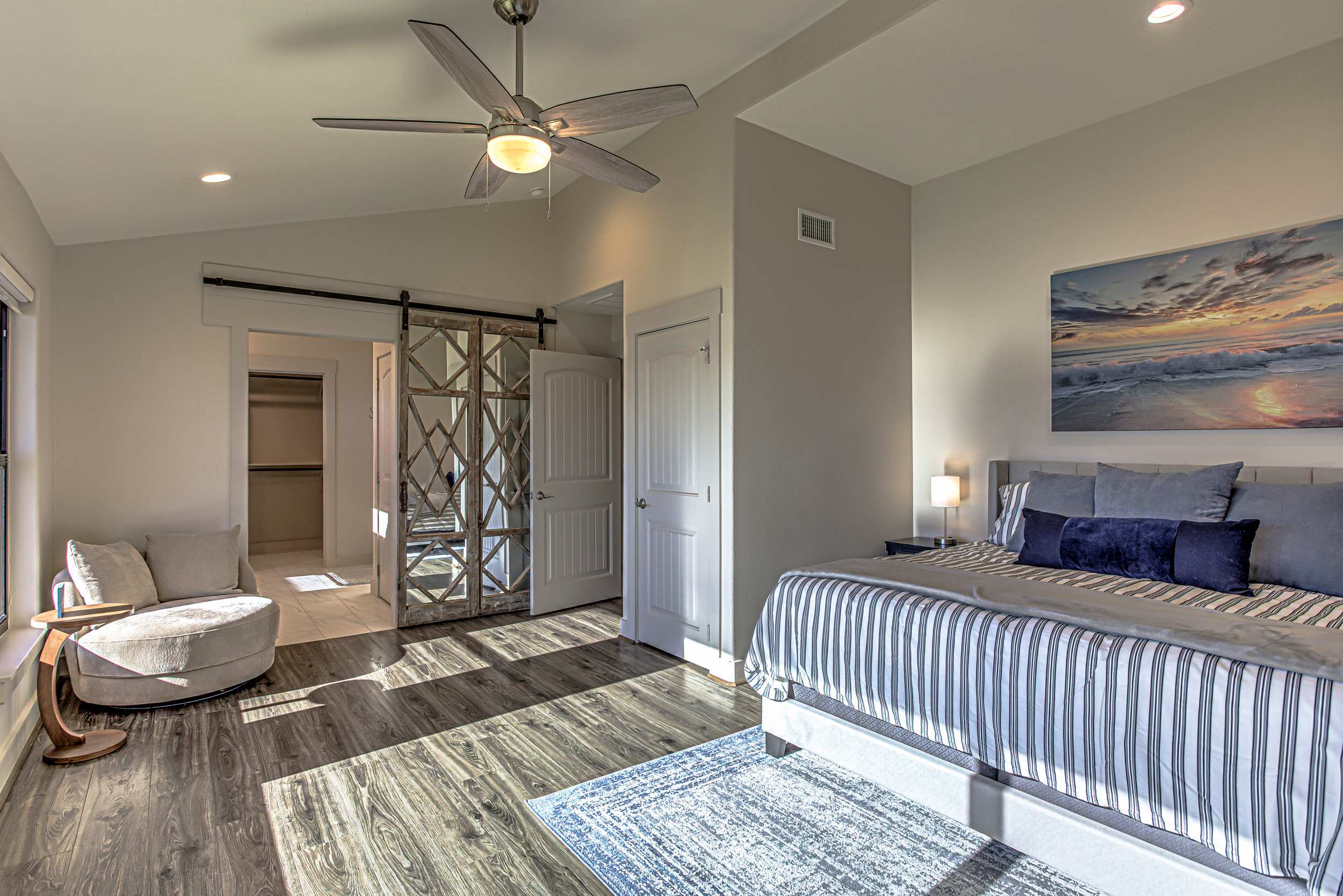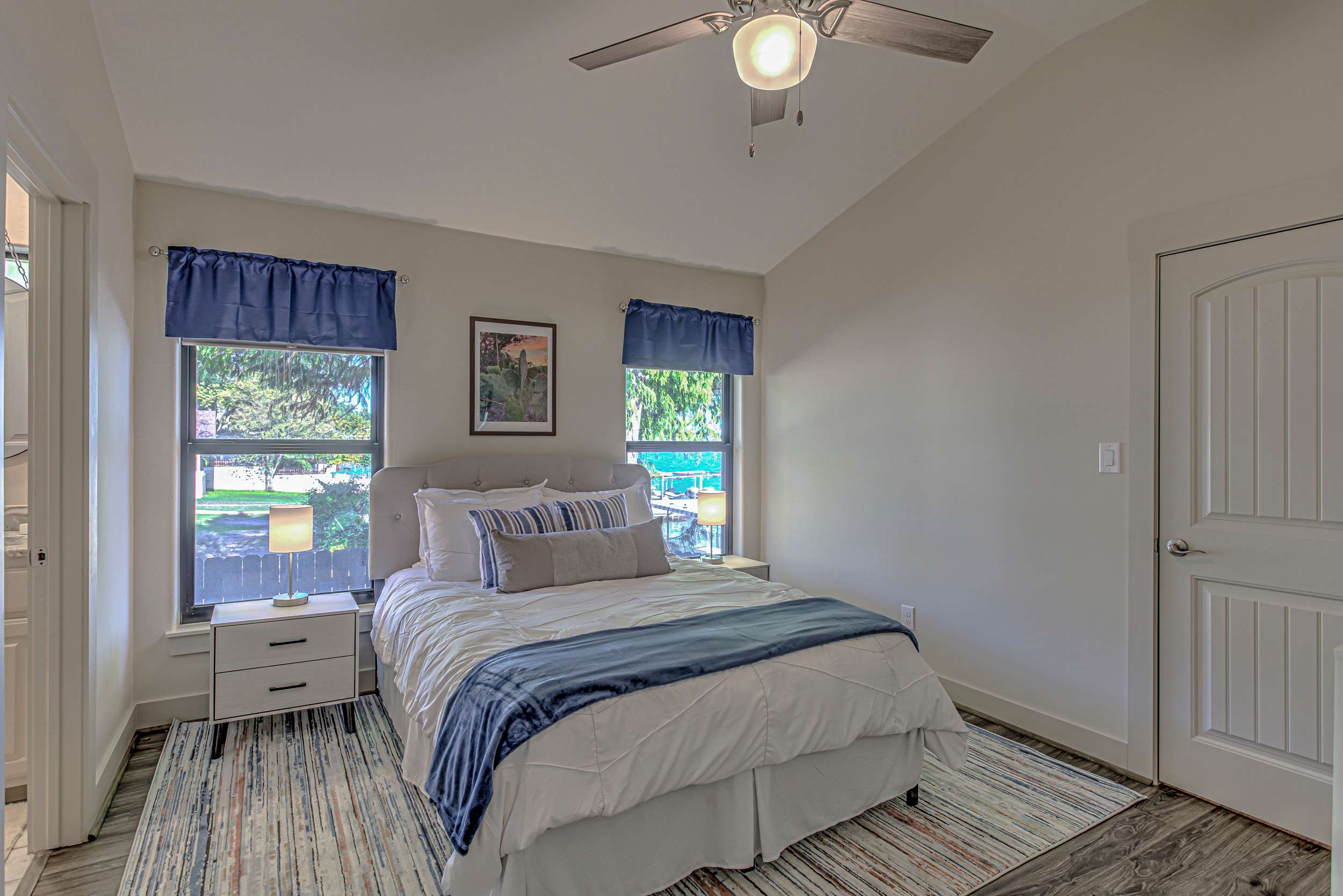 • Bedroom 2 (1st floor): King bed, smart TV, view of Lake LBJ, ensuite bathroom with double vanity and walk-in shower