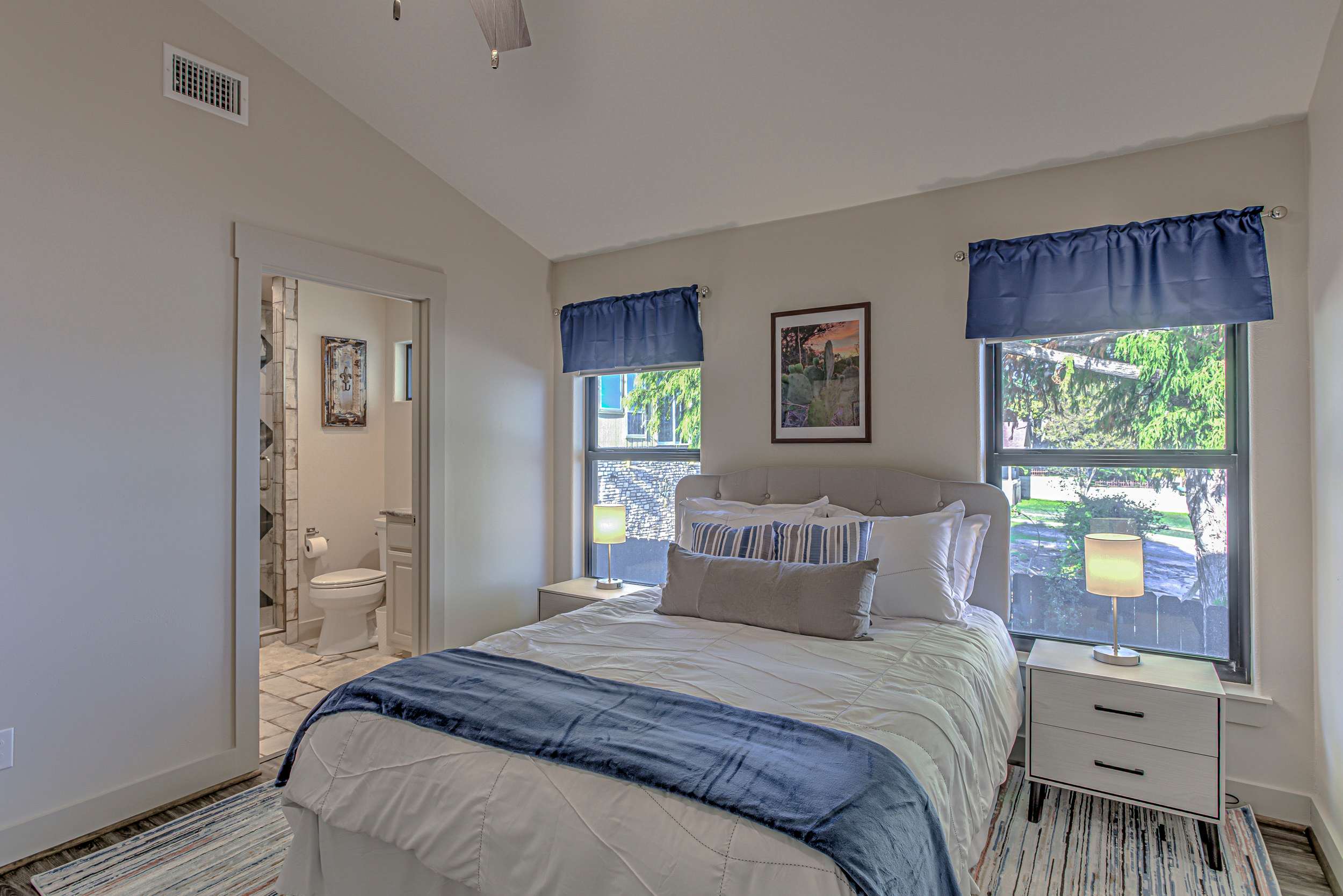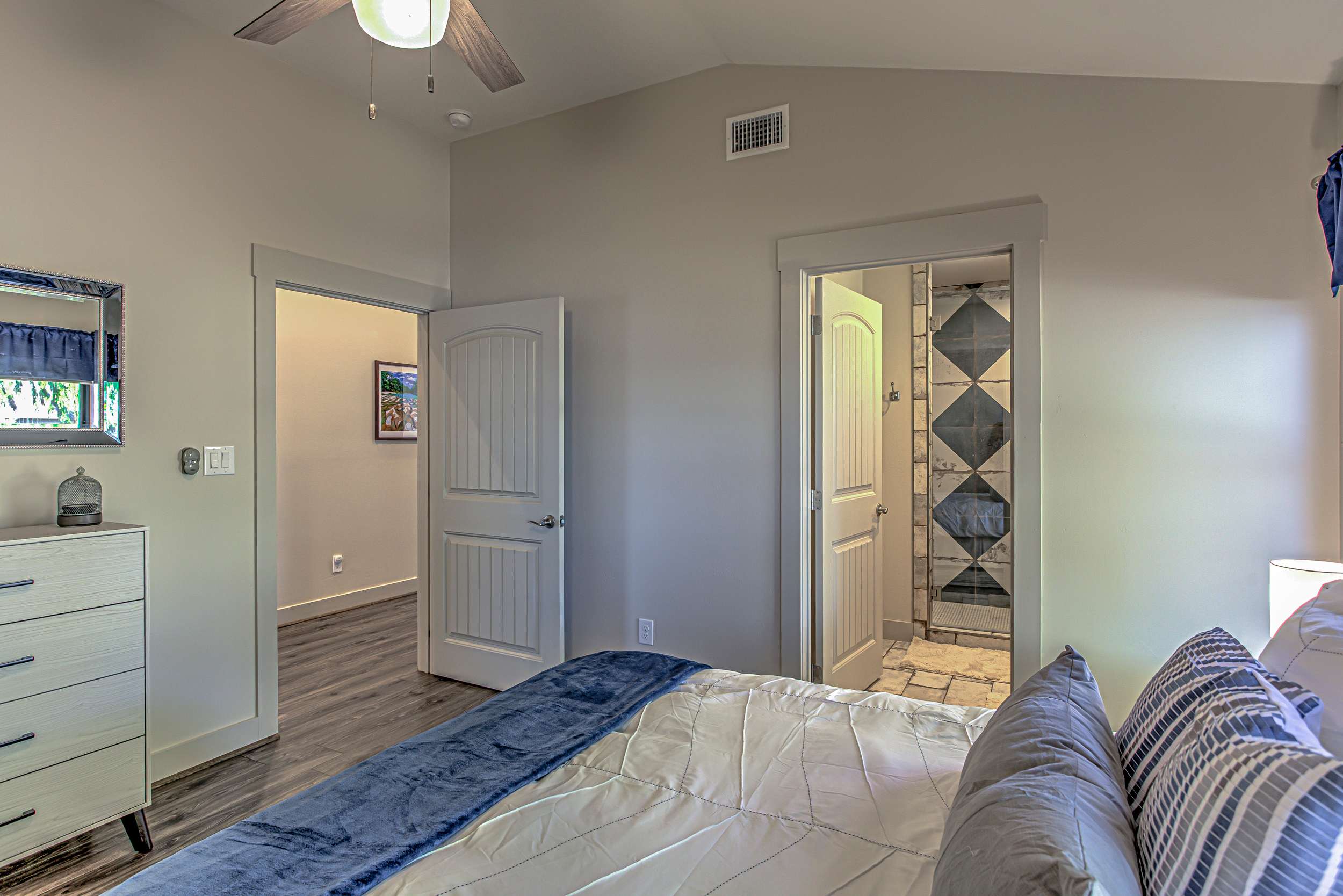• Bedroom 1 (1st floor): Queen bed, ensuite bathroom with single vanity and walk-in shower