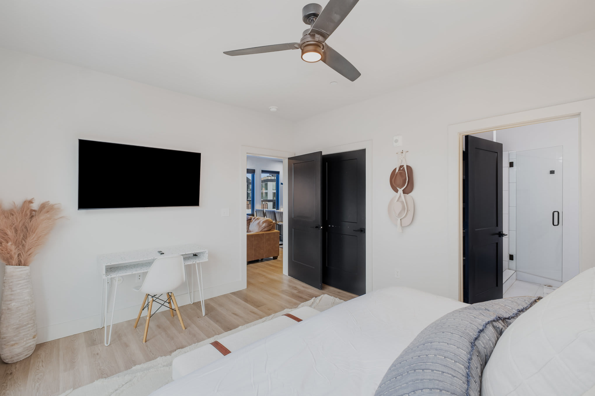• Bedroom 1: King bed, smart TV, and ensuite bathroom with double vanity and walk-in shower