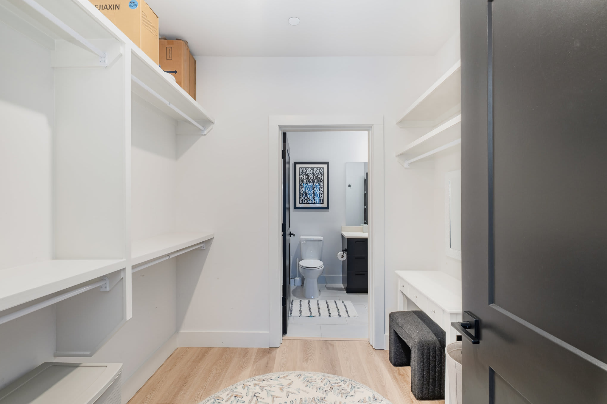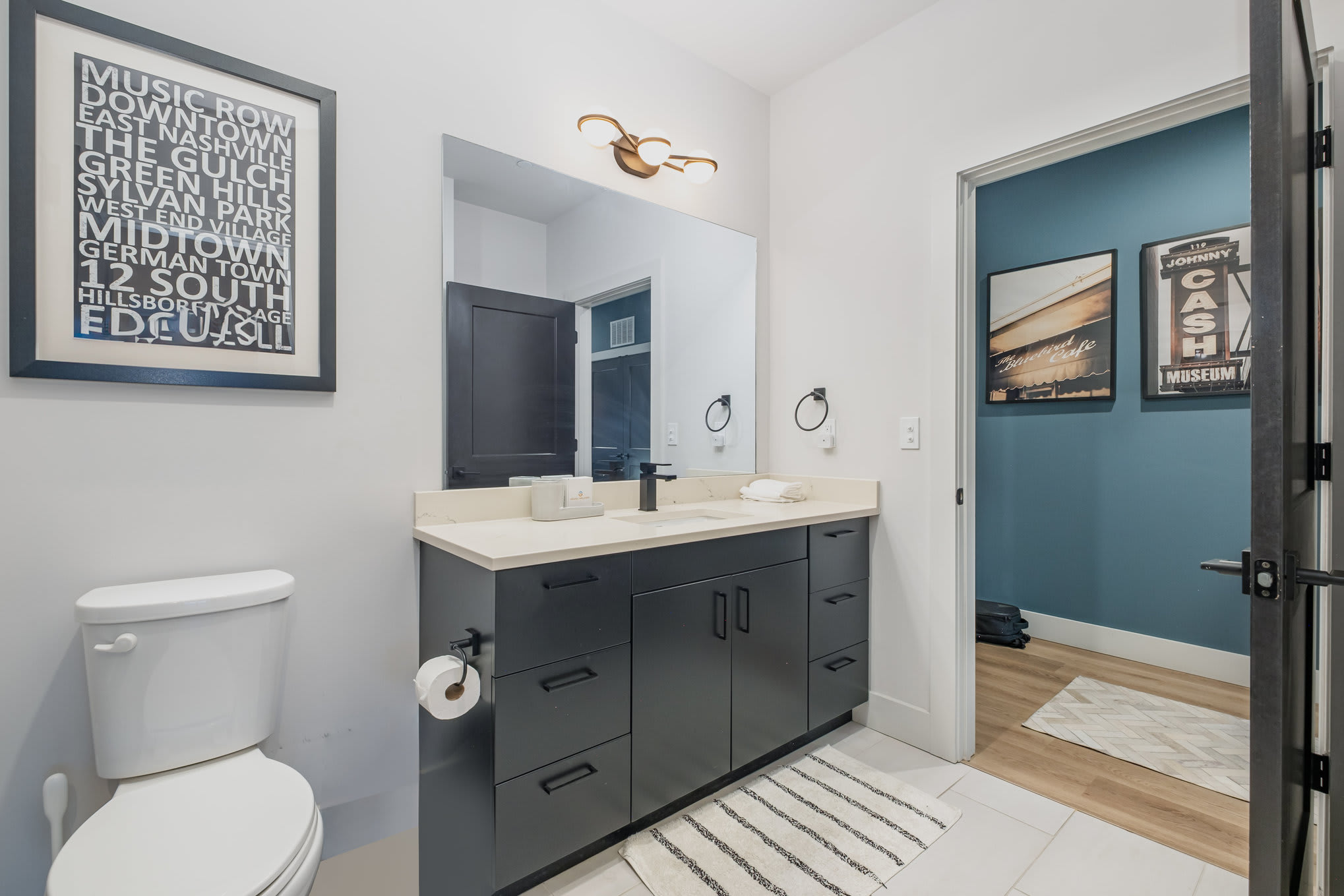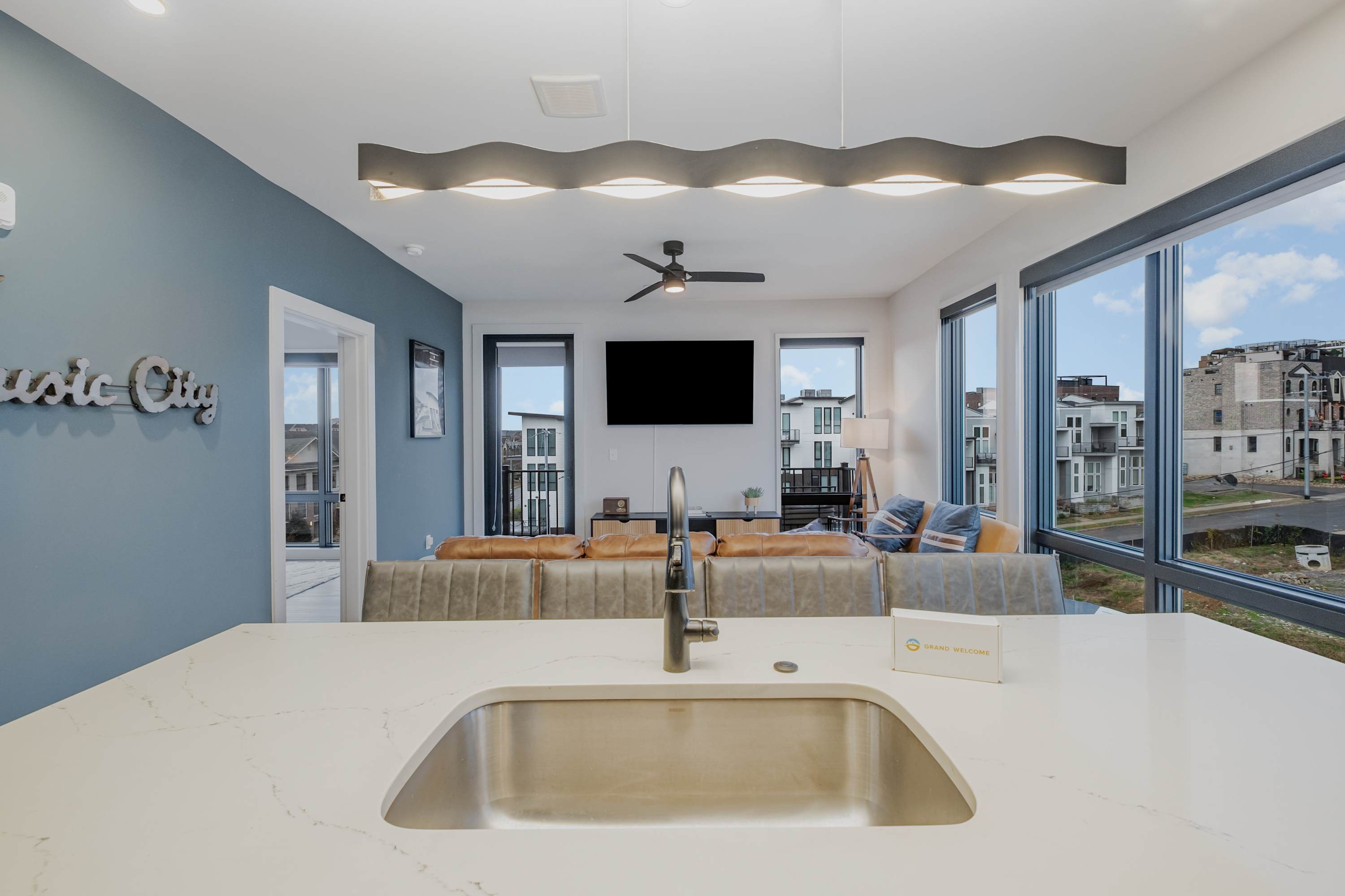 Both bedrooms feature smart TVs so everyone can wind down their way. The primary suite offers extra privacy with an ensuite bathroom, while a second full bathroom serves the guest bedroom and common areas. An in-unit washer and dryer make longer stays and concert-weekend wardrobes a breeze.