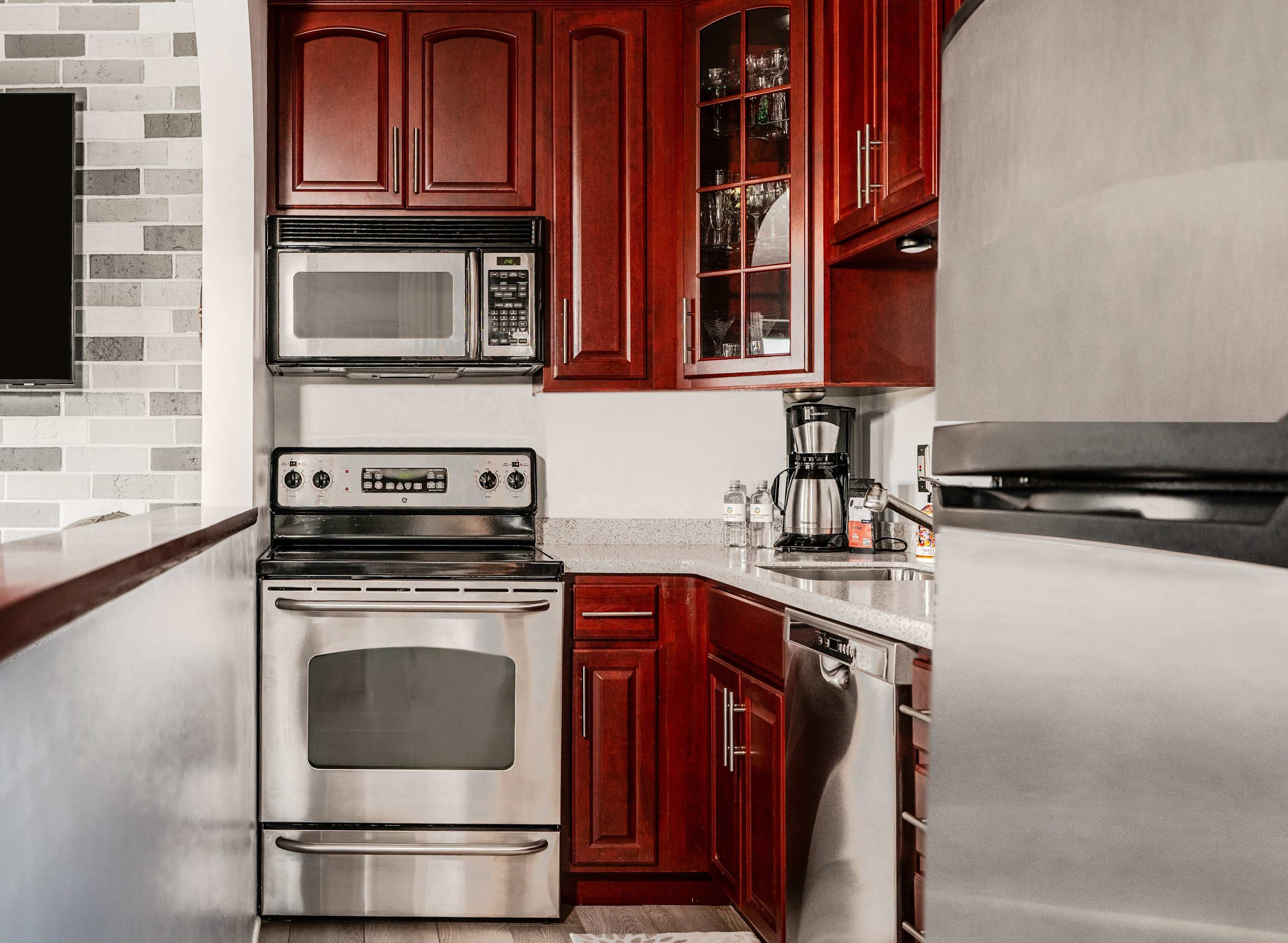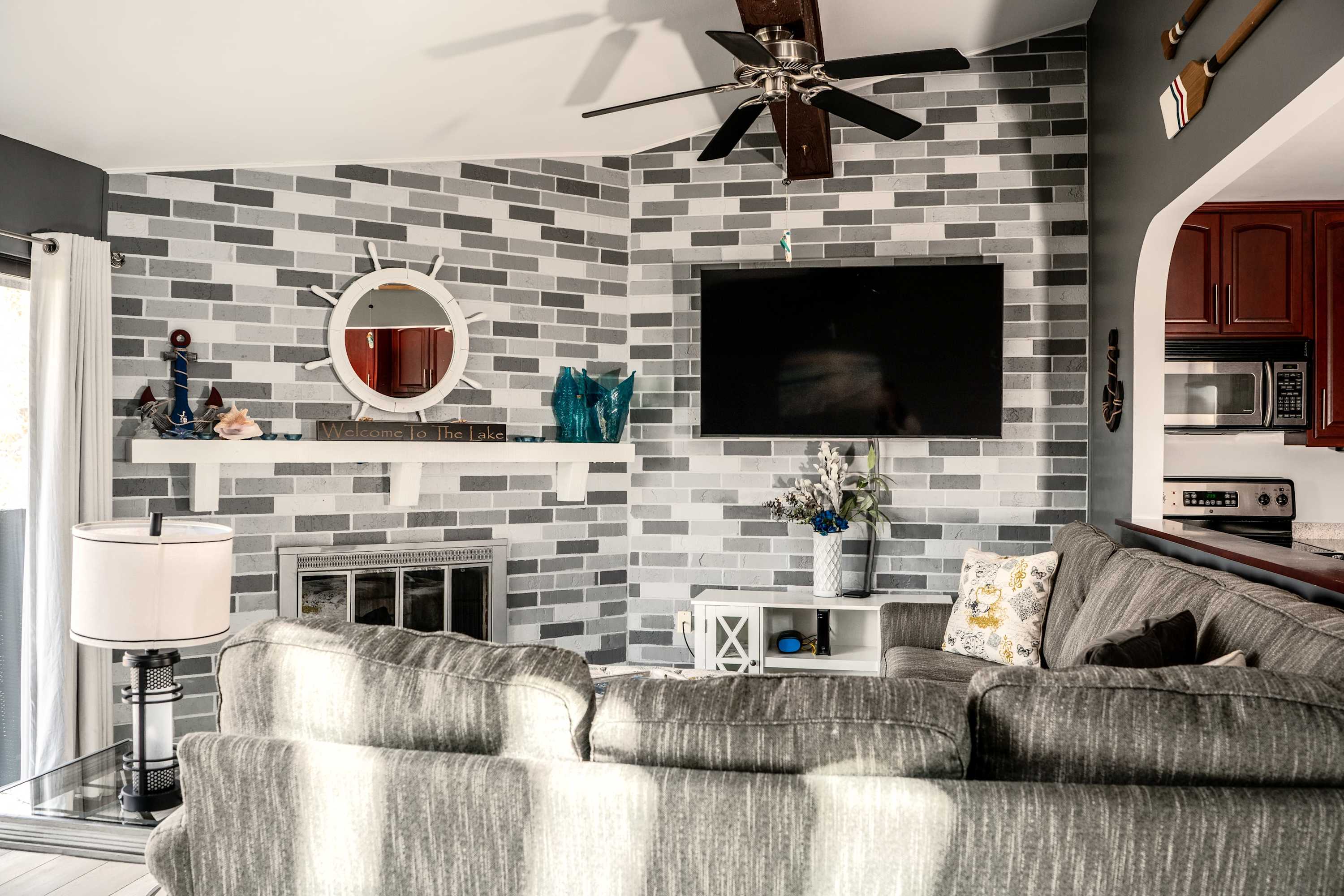 Step inside and feel instantly at ease as you enter the inviting living room, where a plush sectional and sofa gather around a warm indoor fireplace and a smart TV—perfect for cozy evenings after a day on the lake. Just beyond, the dining table for six provides a bright, comfortable place to enjoy meals together. The compact yet fully equipped kitchen is designed with rich cabinetry, stainless steel appliances, and all the essentials you need to cook, brew coffee, or prep snacks before heading out to explore.