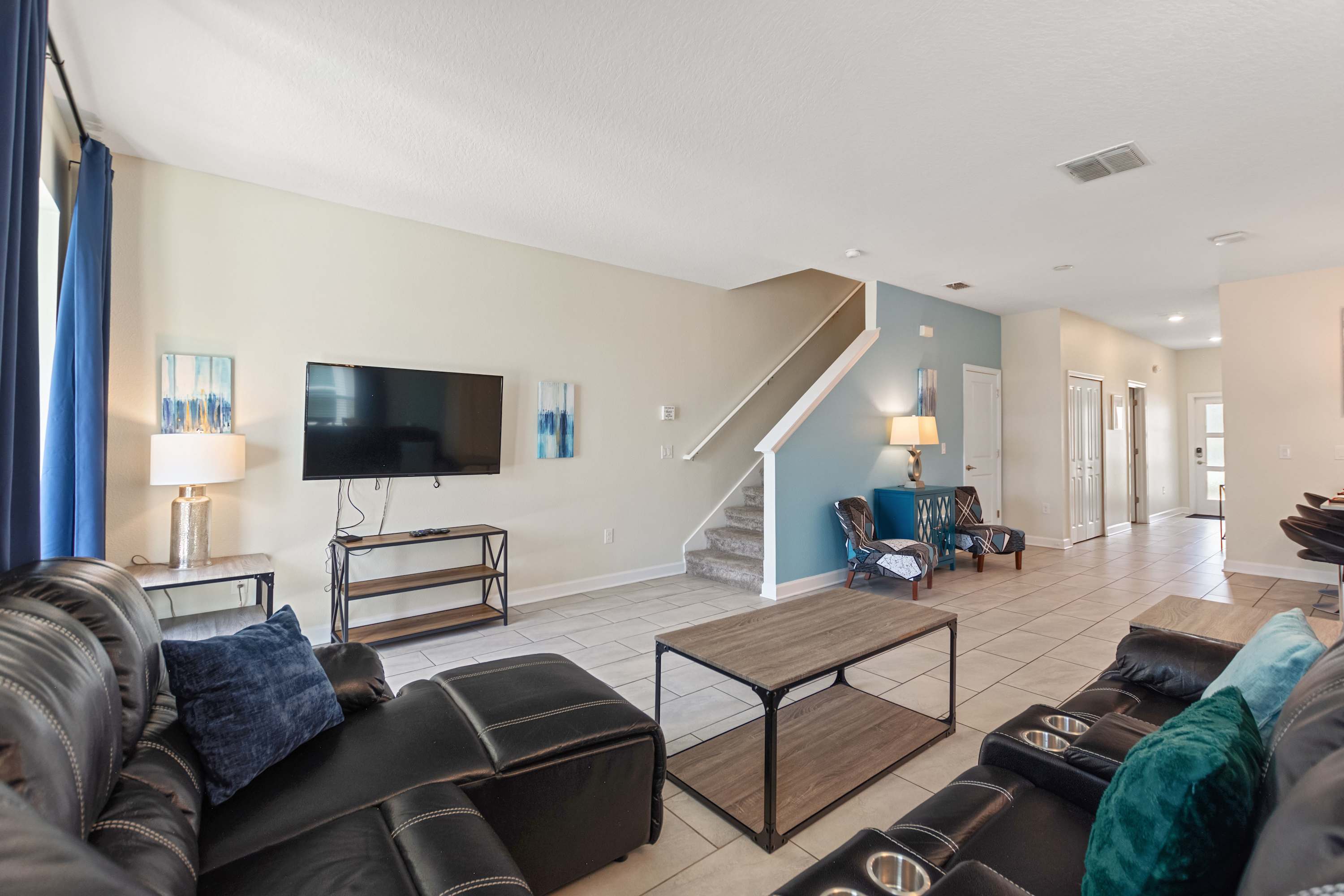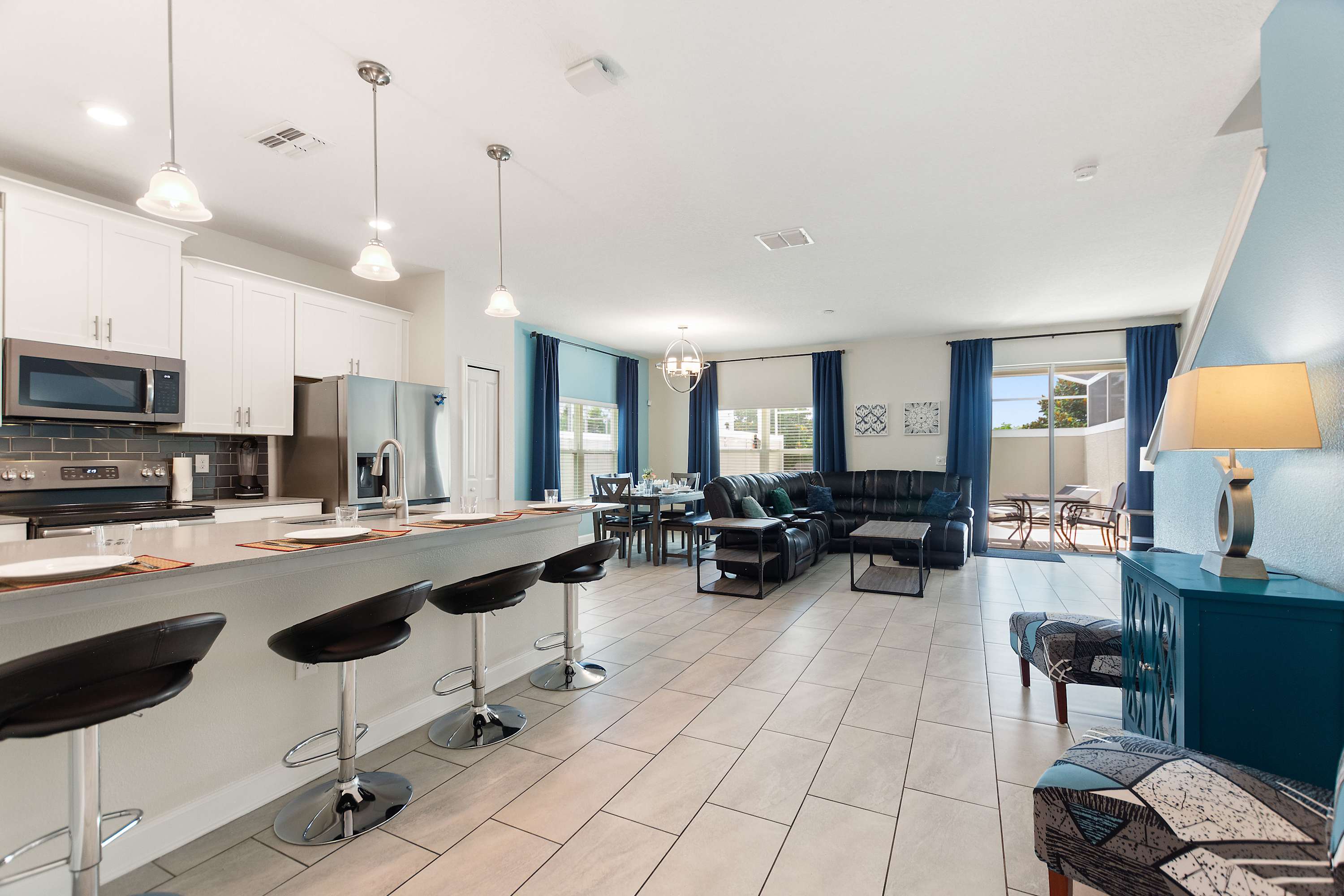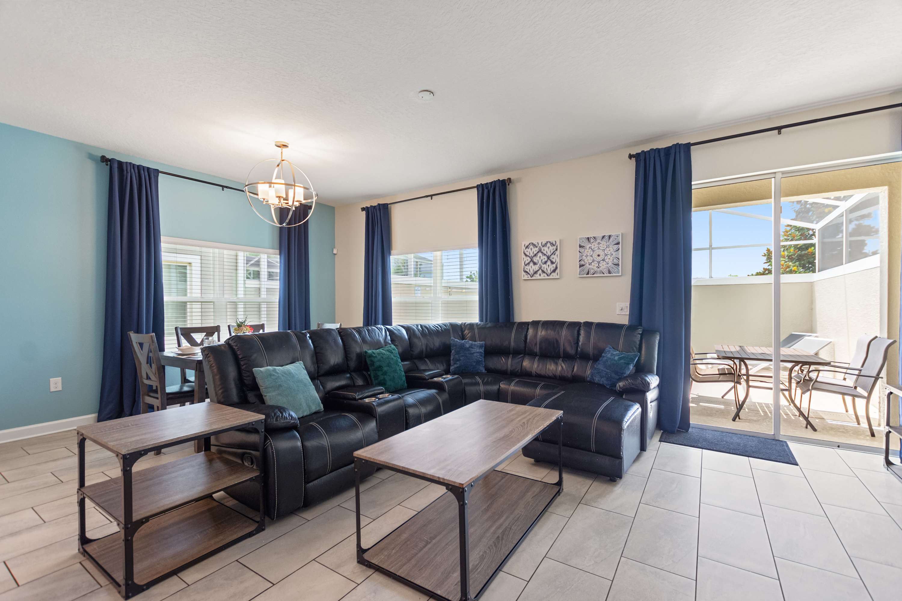 The living room is designed for comfort, centered around a luxurious black leather wraparound sectional with three built-in recliners, perfect for cozy movie nights on the smart TV. Sunlight pours in through the sliding glass doors, drawing you out to the screened patio, where your private pool, table for four, and relaxing lounge seating create a private backyard oasis. For even more fun, one of the bedrooms features a multi-game arcade machine, offering hours of entertainment for kids—and anyone who’s a kid at heart.