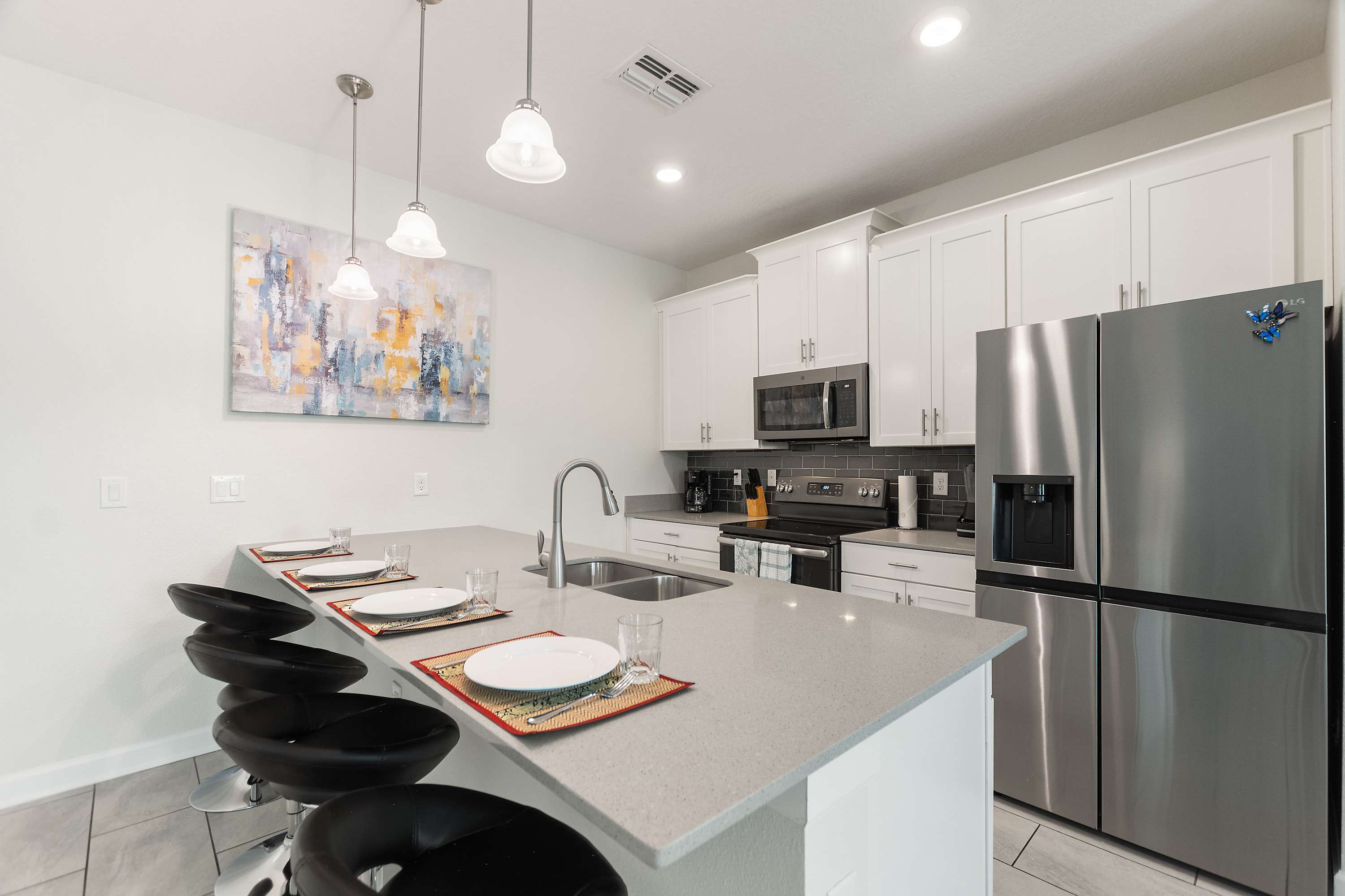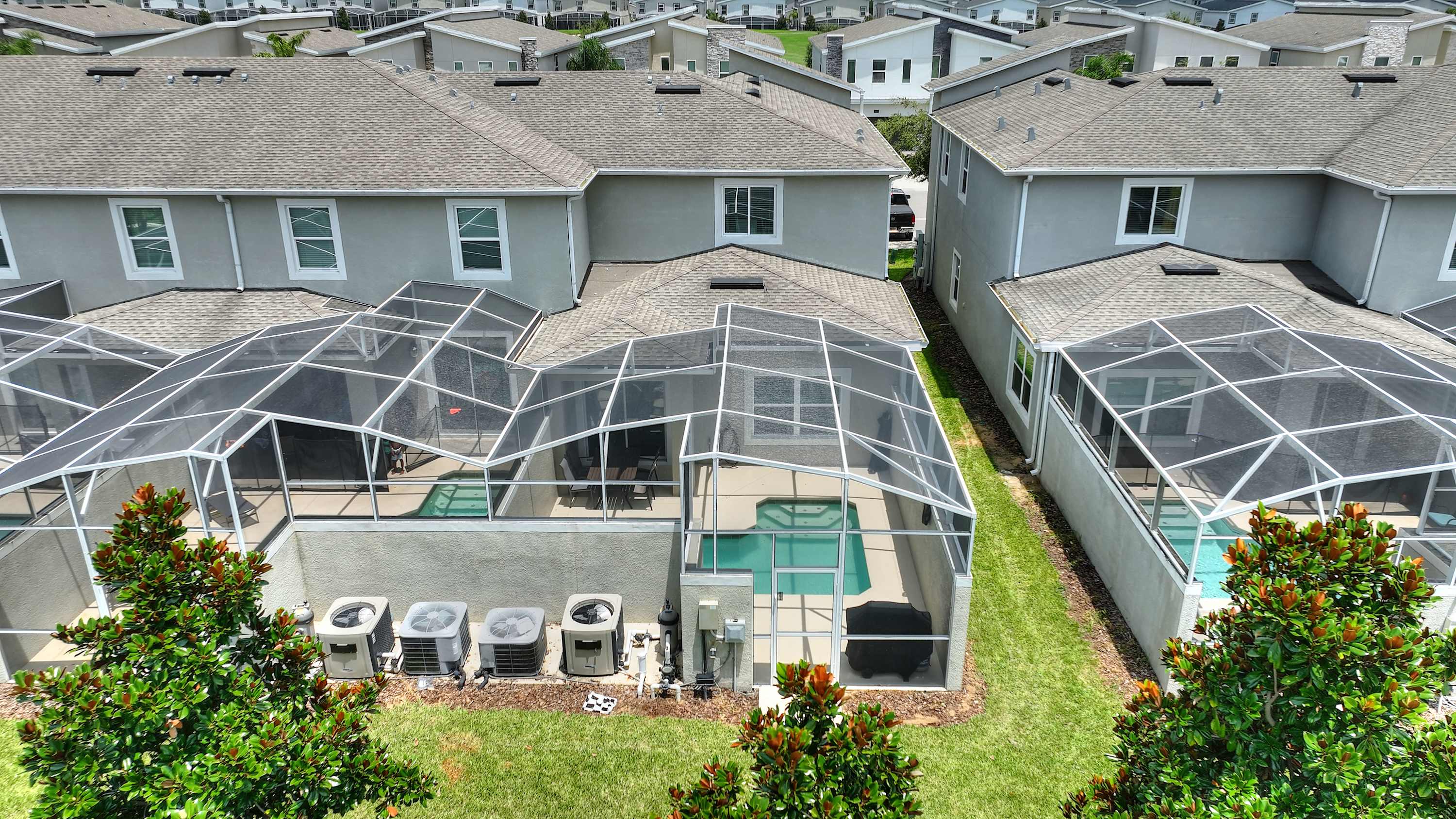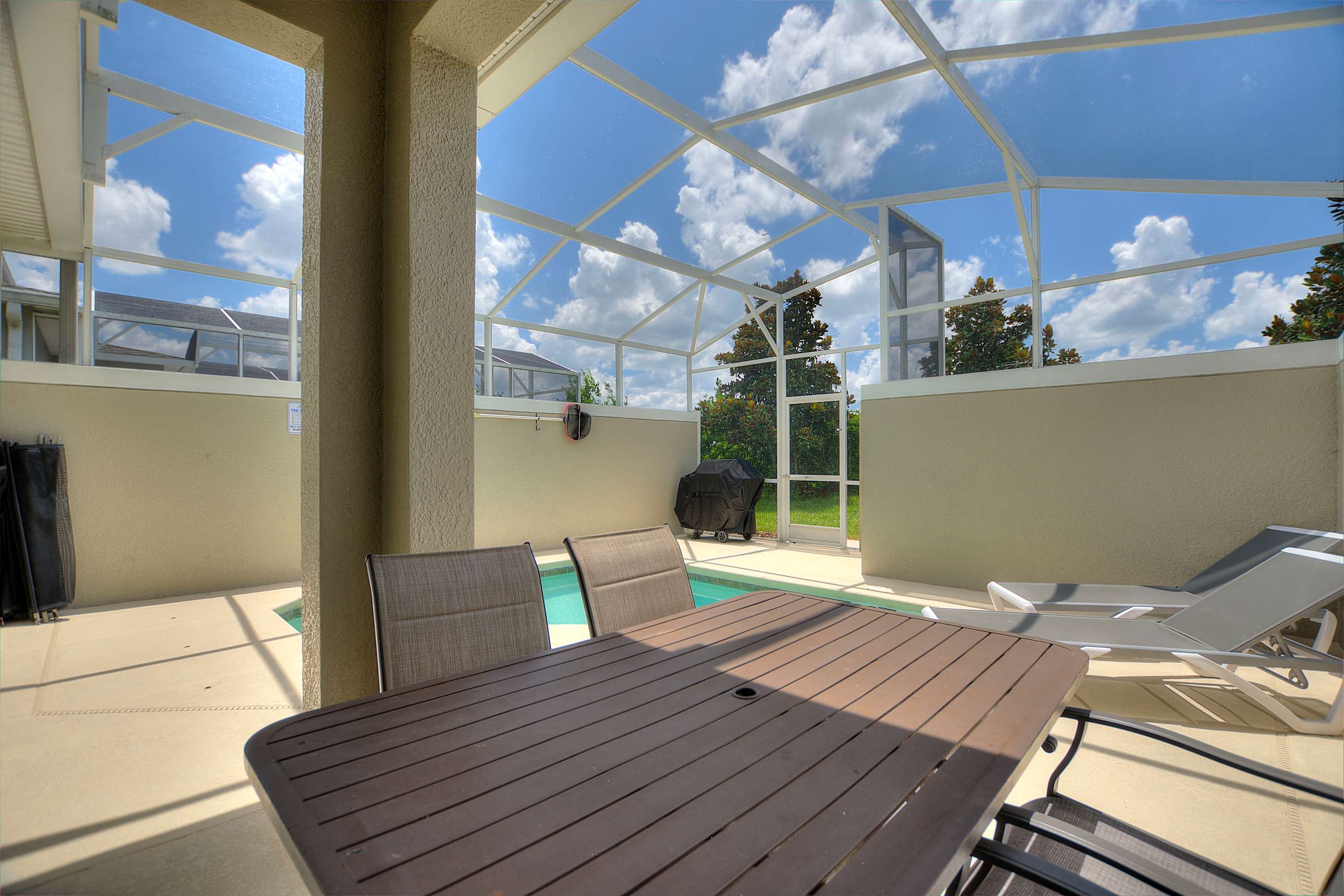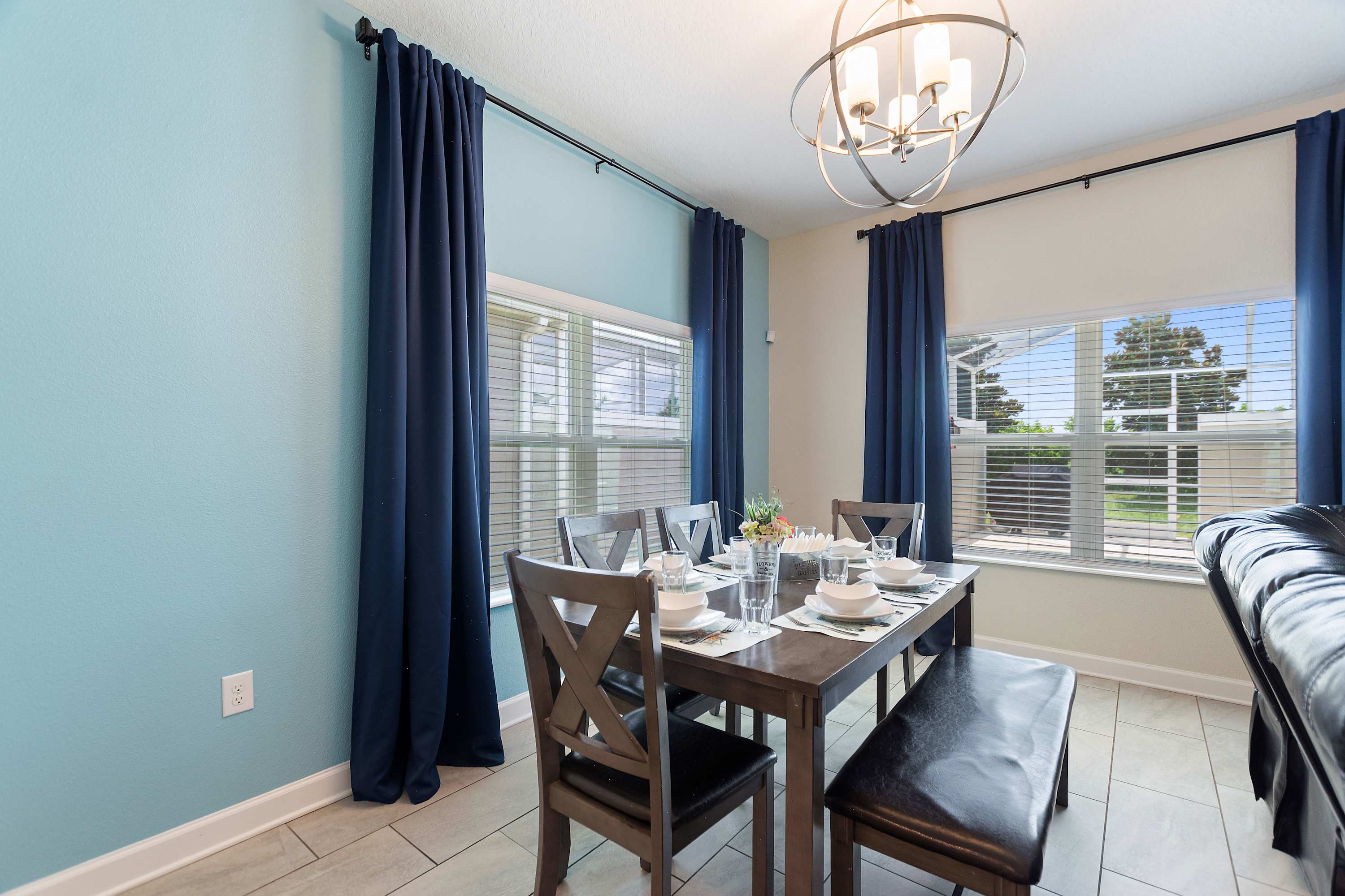 The living room is designed for comfort, centered around a luxurious black leather wraparound sectional with three built-in recliners, perfect for cozy movie nights on the smart TV. Sunlight pours in through the sliding glass doors, drawing you out to the screened patio, where your private pool, table for four, and relaxing lounge seating create a private backyard oasis. For even more fun, one of the bedrooms features a multi-game arcade machine, offering hours of entertainment for kids—and anyone who’s a kid at heart.