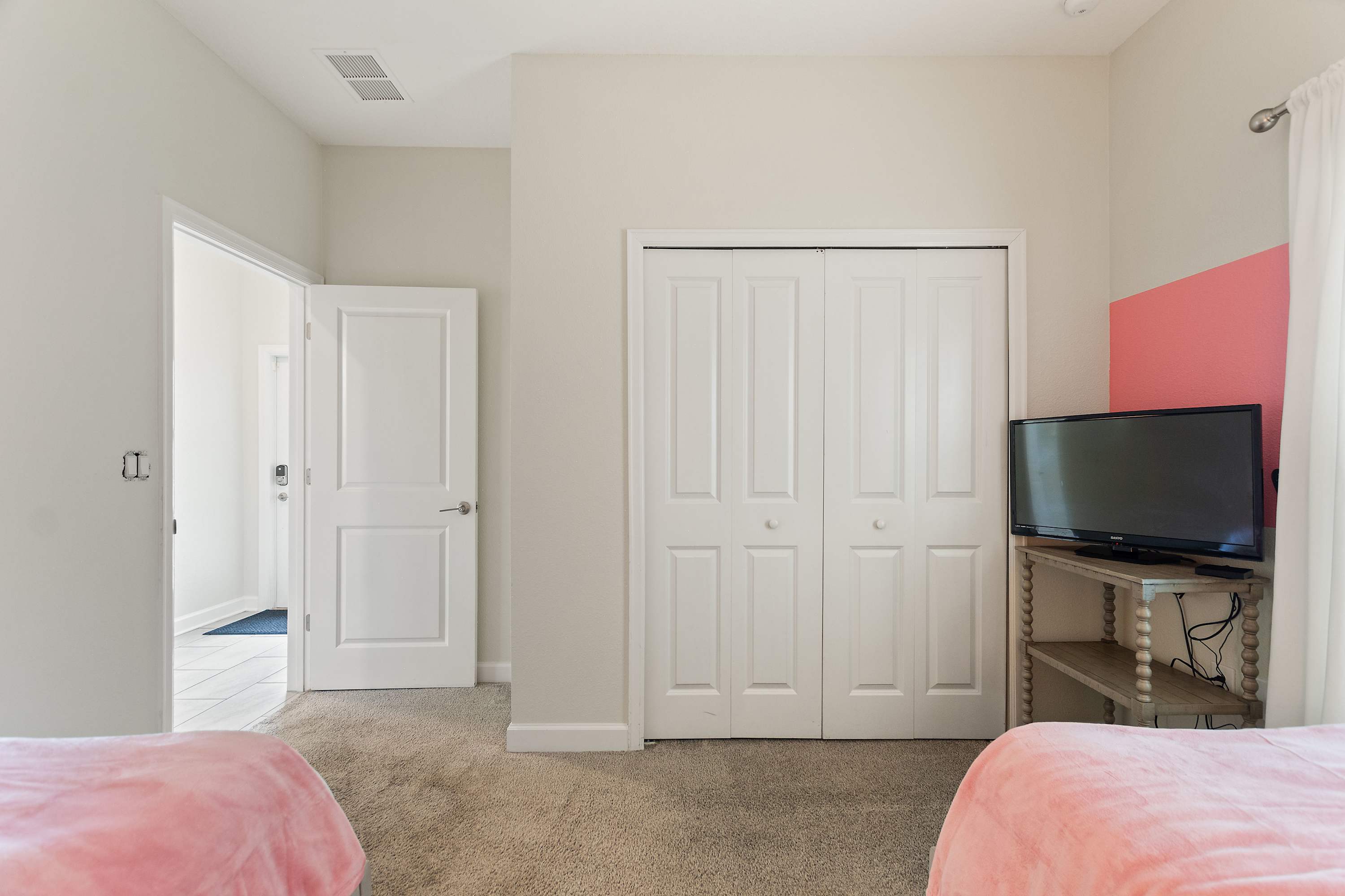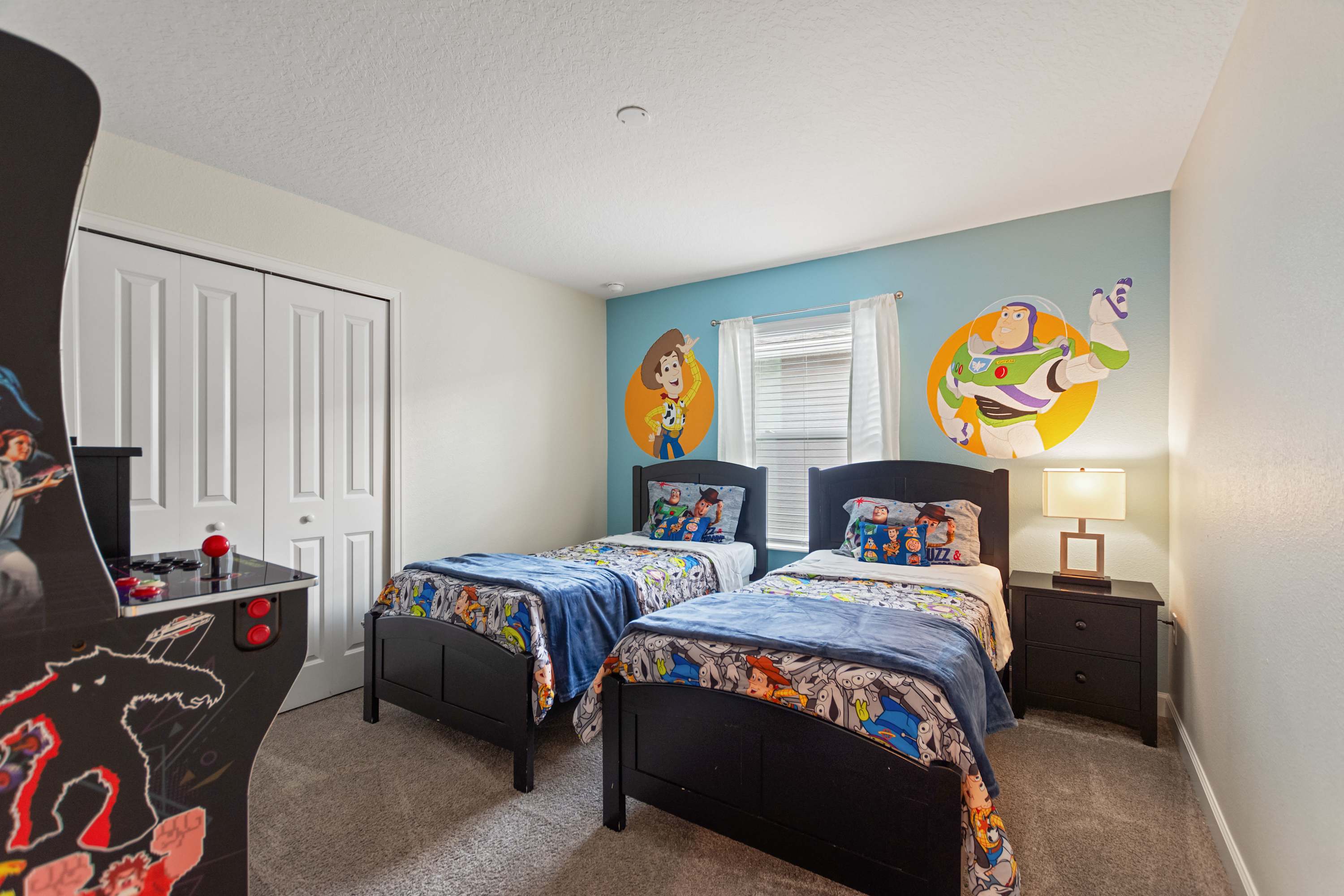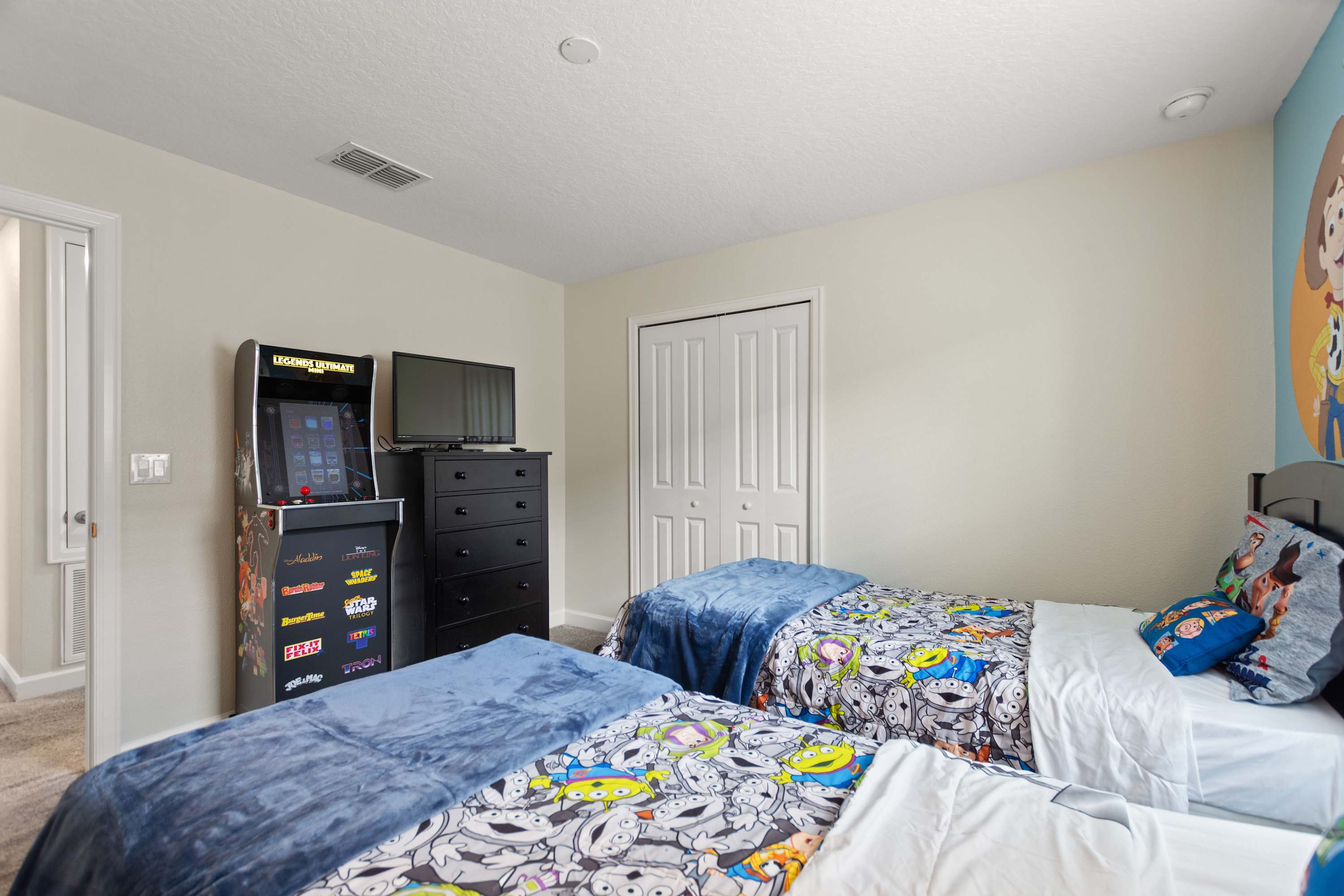 Bedroom #4 is Toy Story themed and includes 2 twin size beds, a smart TV also equipped with cable, and a multi-game arcade game.