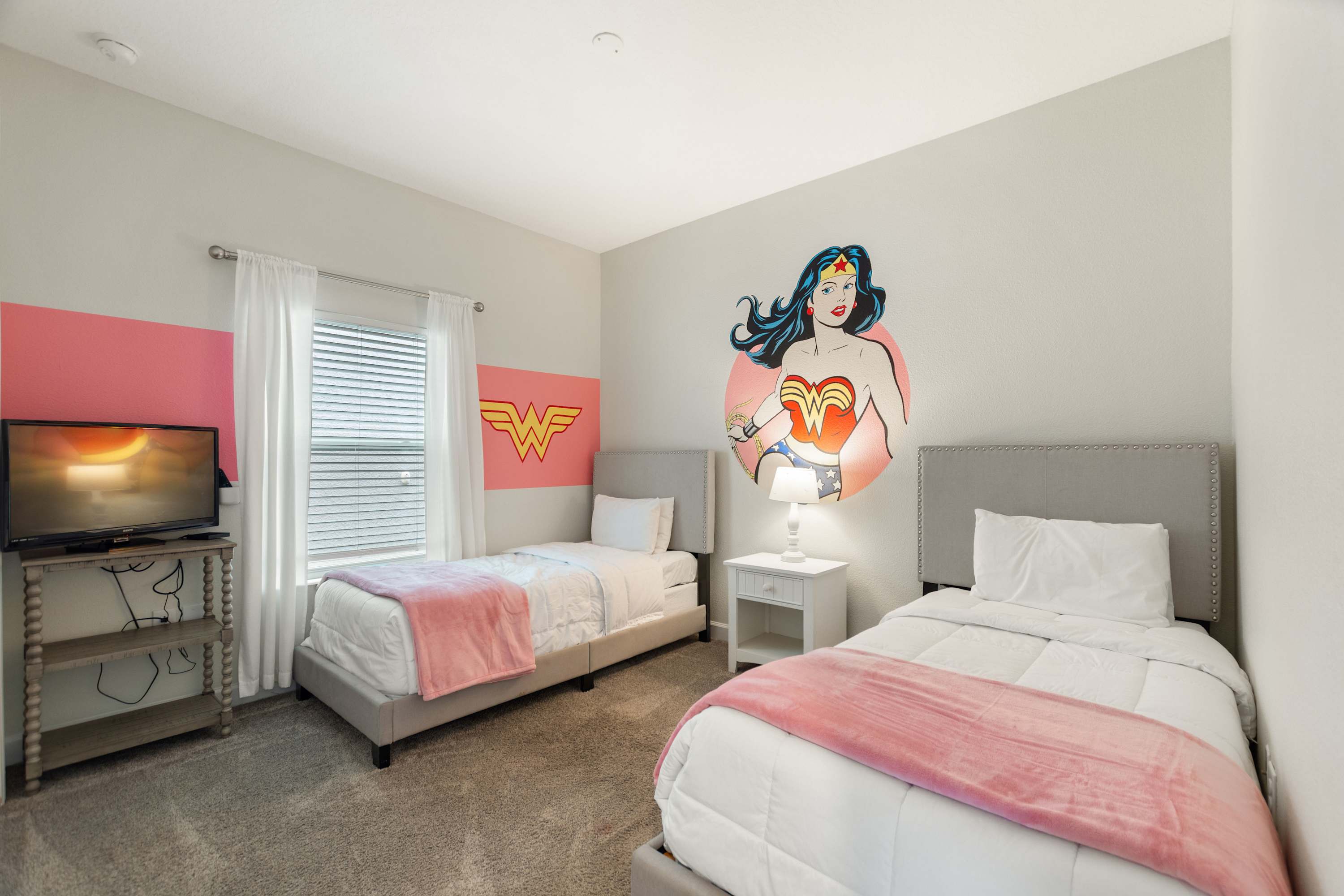 Bedroom #1 is Wonder Woman themed and includes 2 twin size beds and a smart TV also equipped with cable.
