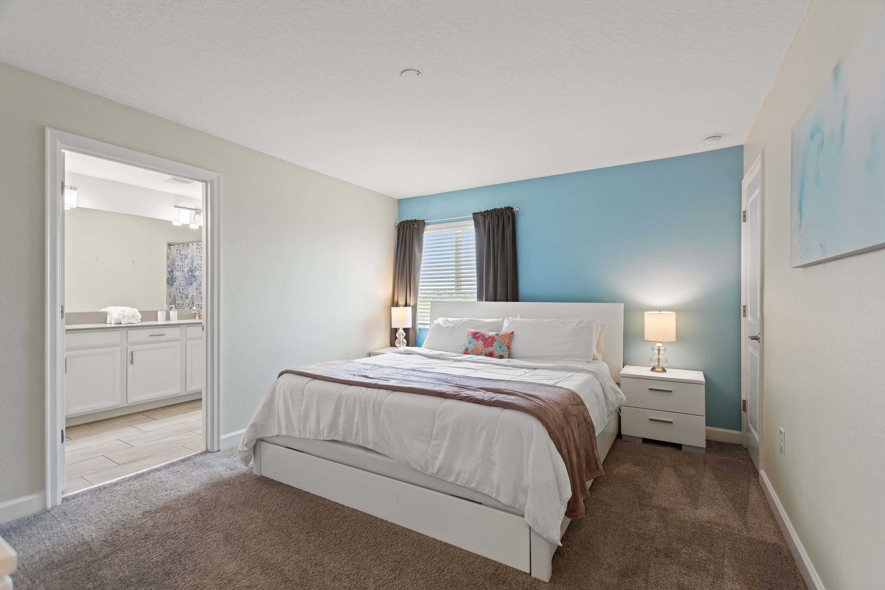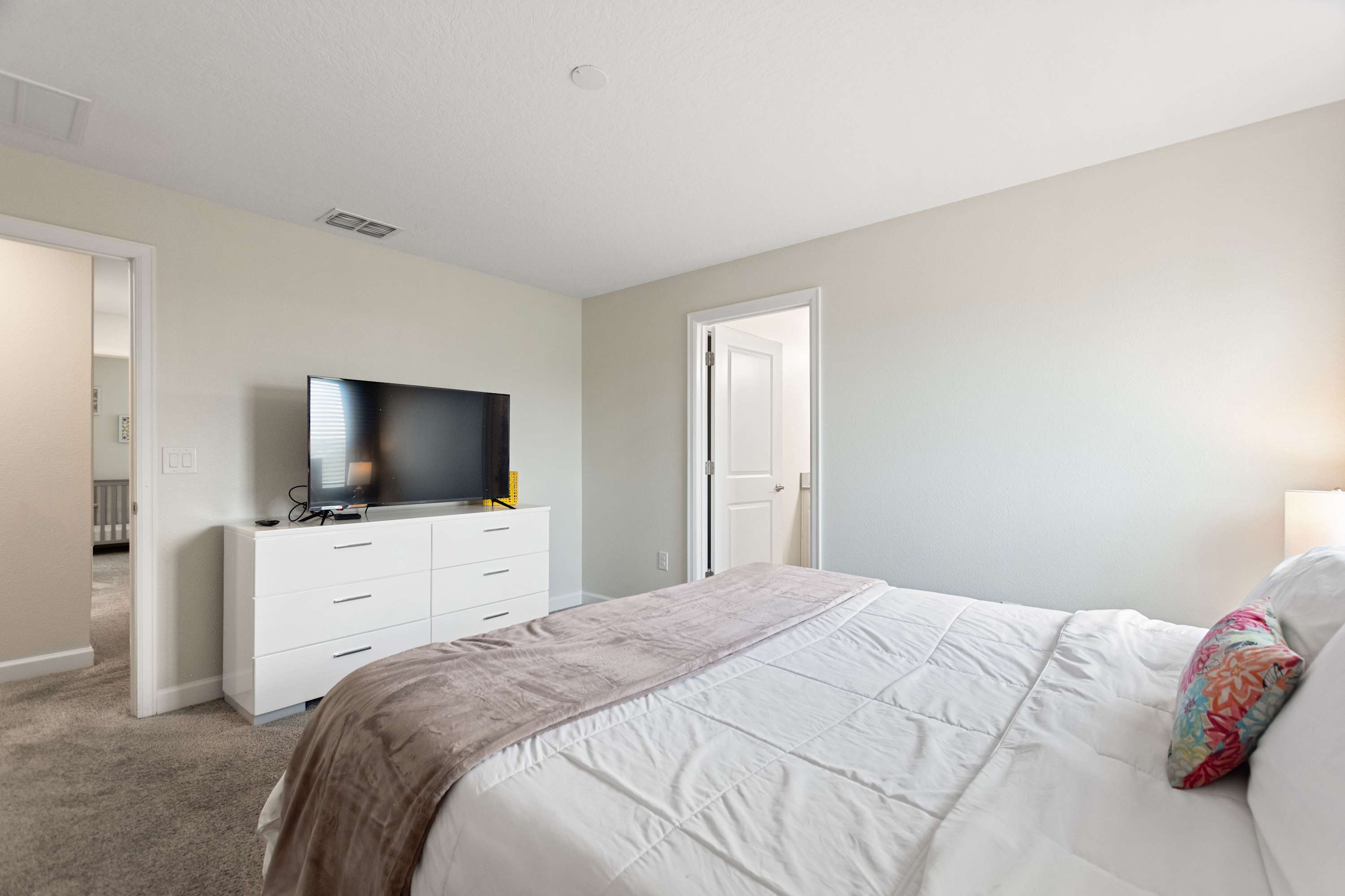 Bedroom #3 includes a king size bed, a smart TV also equipped with cable, and an ensuite bathroom with a dual vanity and a shower/tub combo.