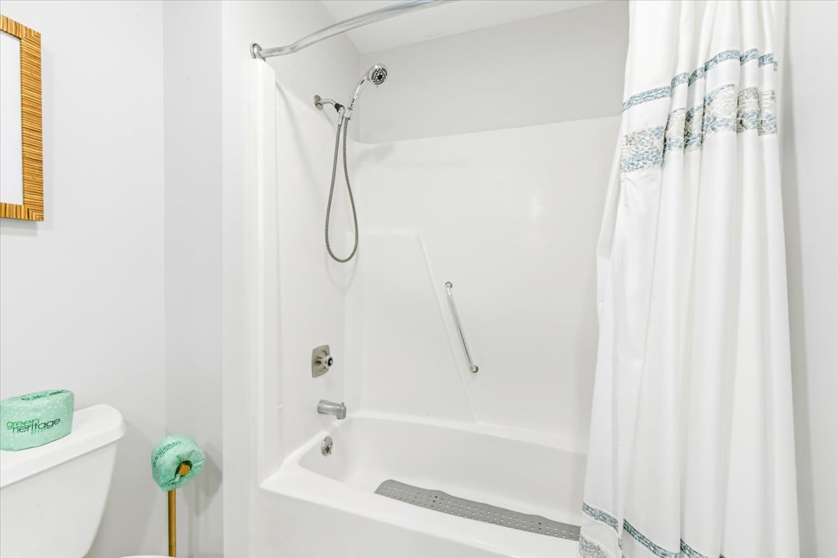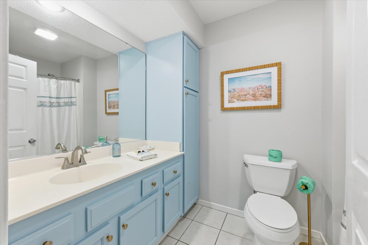 - Bathroom 1: Tub/shower combo, light blue vanity with large mirror