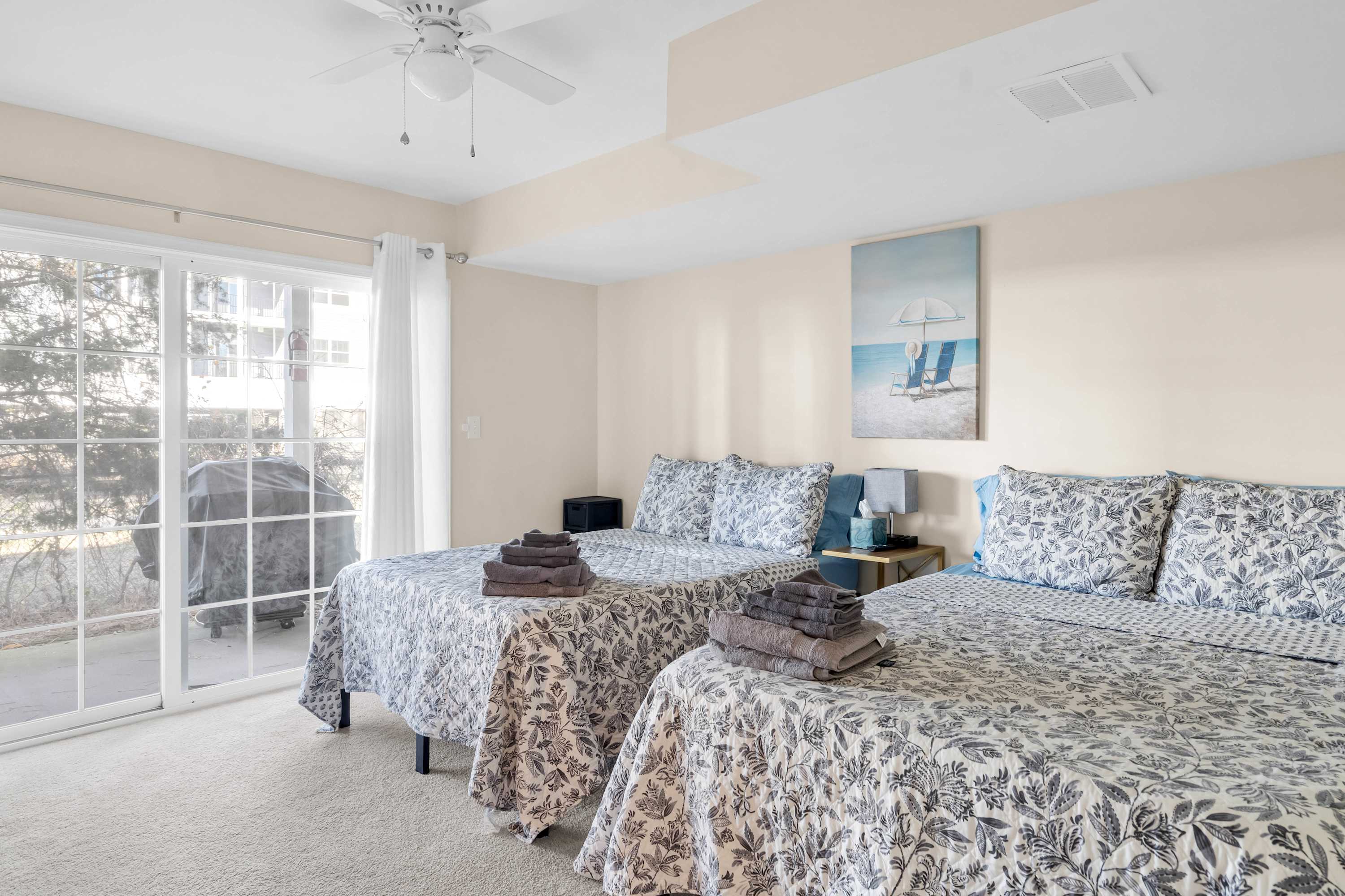 Bedroom #1 includes 2 queen size beds, a smart TV, patio access, and an ensuite bathroom with a single vanity and a walk-in shower.
