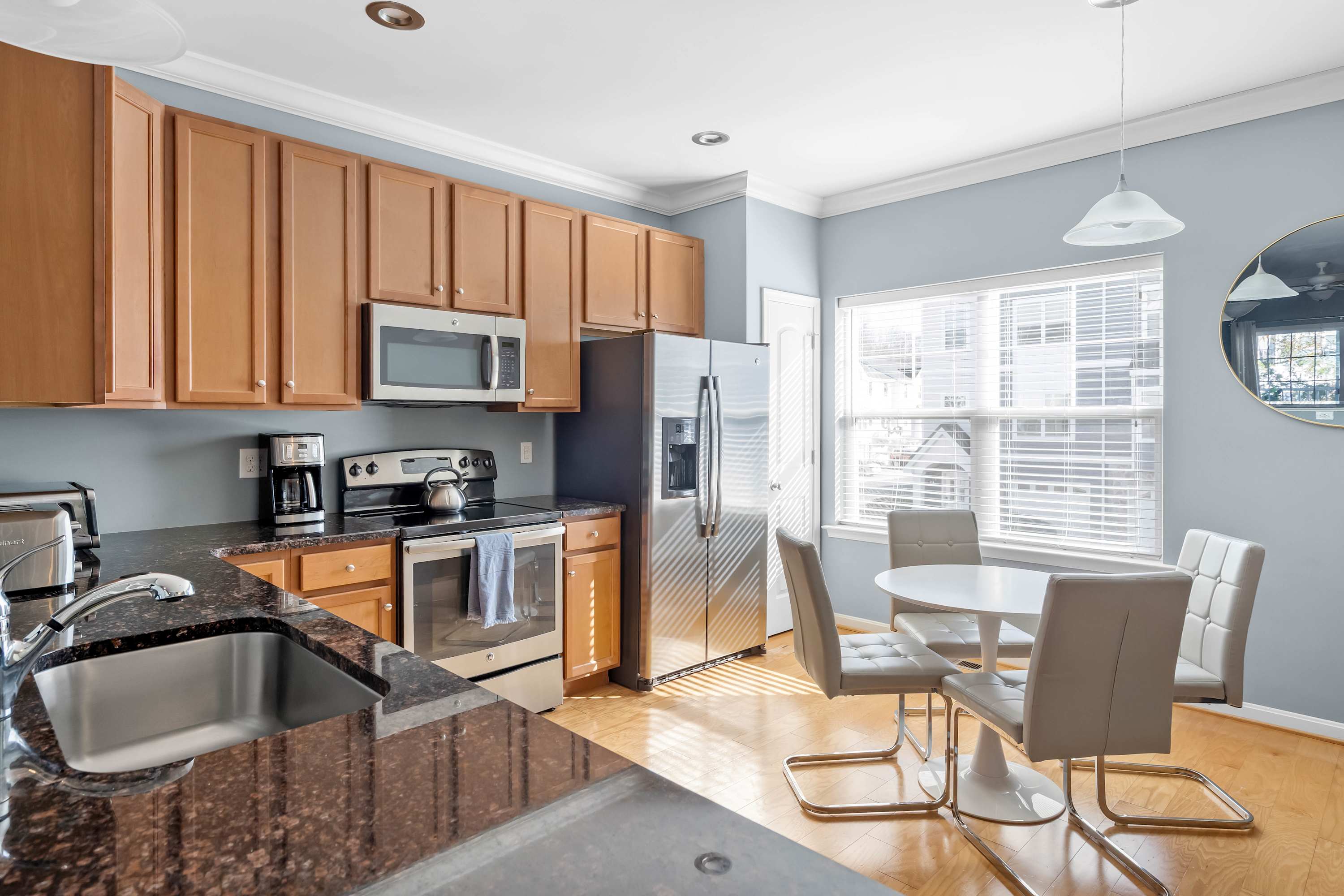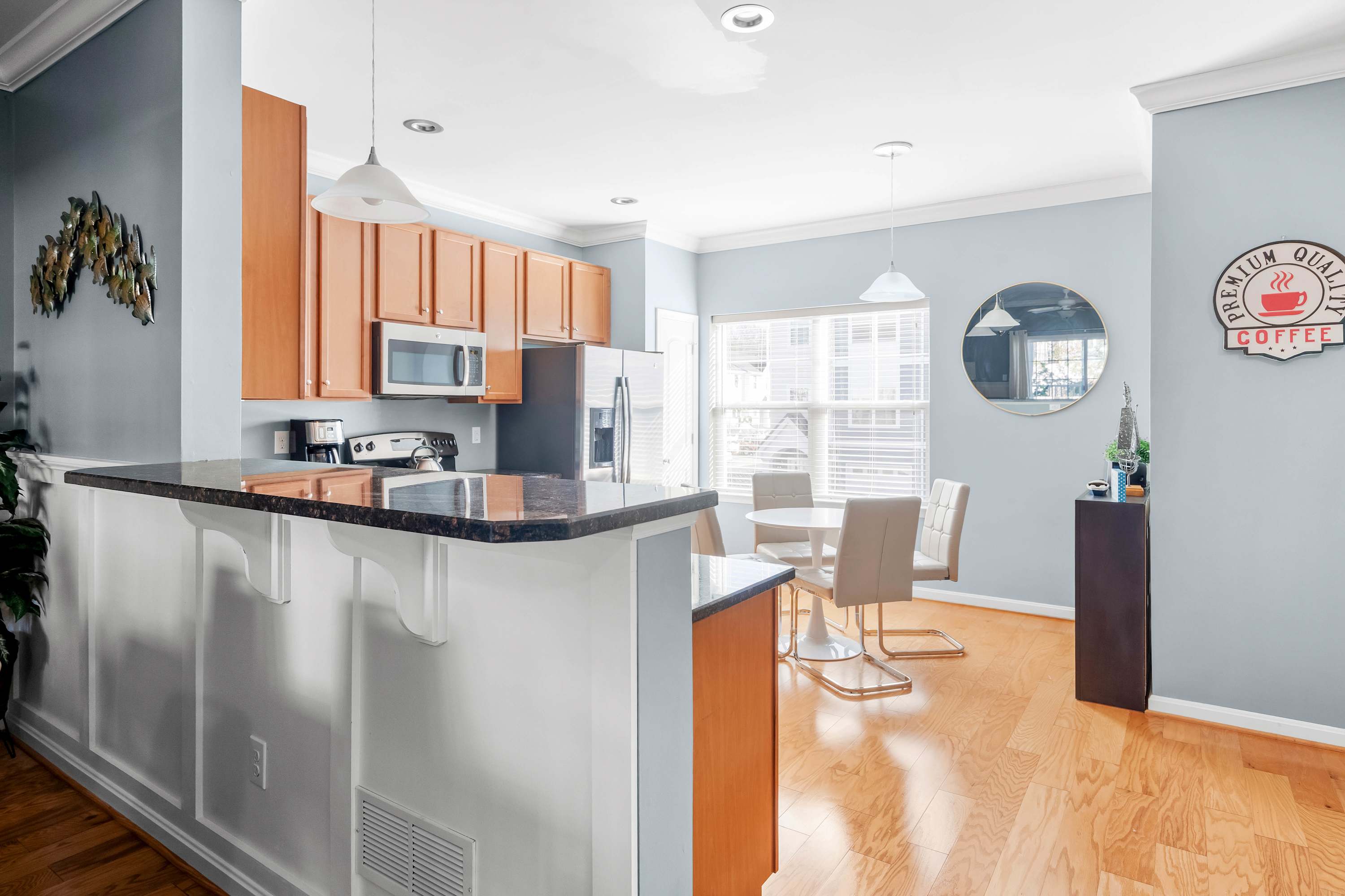 Step inside and feel instantly at ease in the spacious living room, where a large, cozy sectional invites you to sink in and unwind. A warm gas fireplace and cable TV set the tone for laid-back evenings, while sliding glass doors open to a screened-in deck furnished for lounging and complete with a grill for effortless outdoor meals. Just beyond, a separate dining area offers a welcoming table for six—ideal for gathering over dinner—while the kitchen provides plenty of room to cook and connect. Here, you’ll find stainless steel appliances, warm cabinetry, dark stone countertops, and a sunny kitchen table for four, creating a comfortable, home-like space designed for easy vacation living.