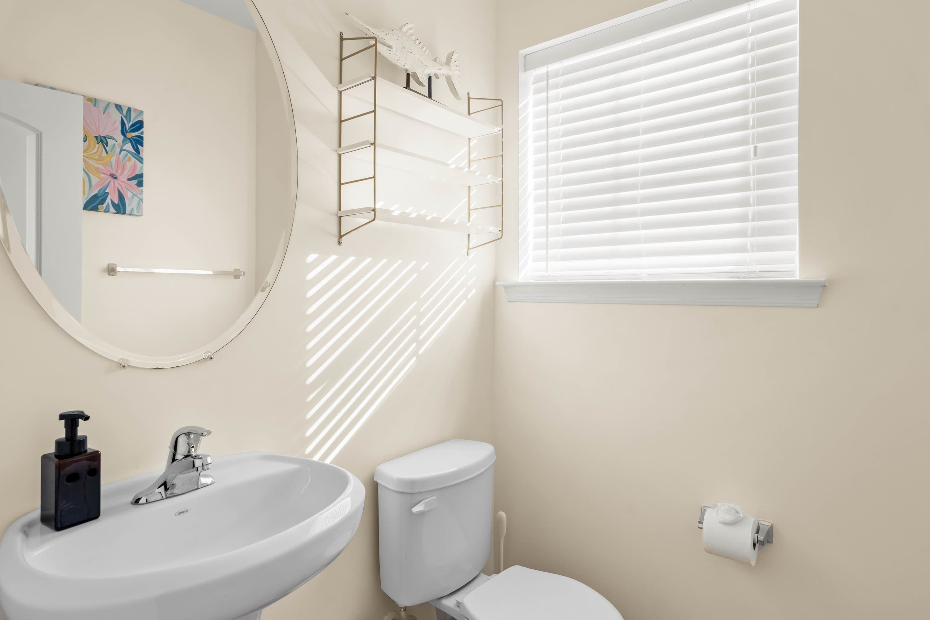 This home also includes a half bathroom with a pedestal sink.