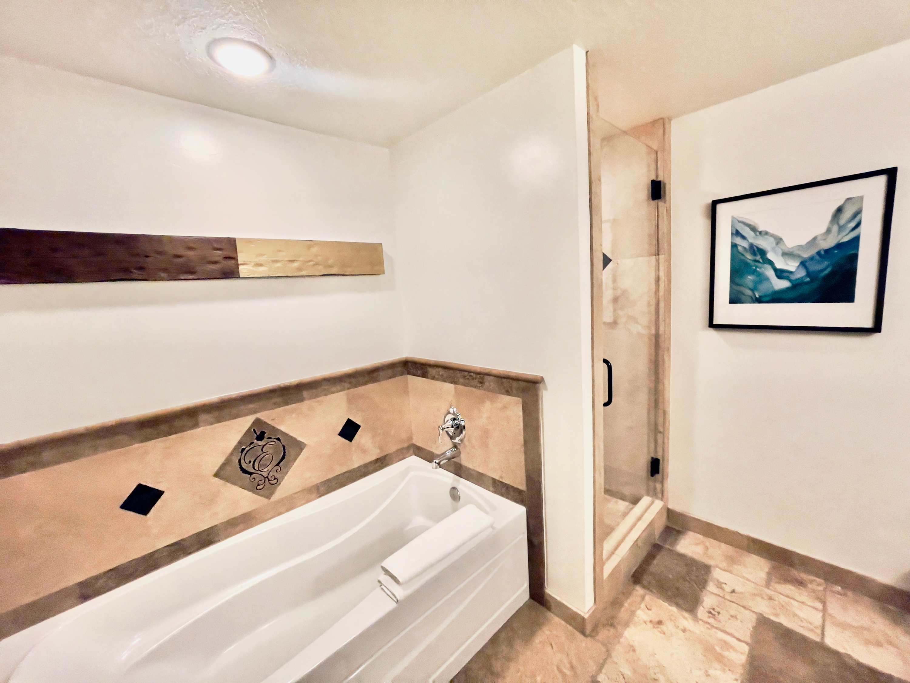 This home also includes a smart TV, also equipped with cable, and an ensuite bathroom with a single vanity, a walk-in shower, and a soaking tub.