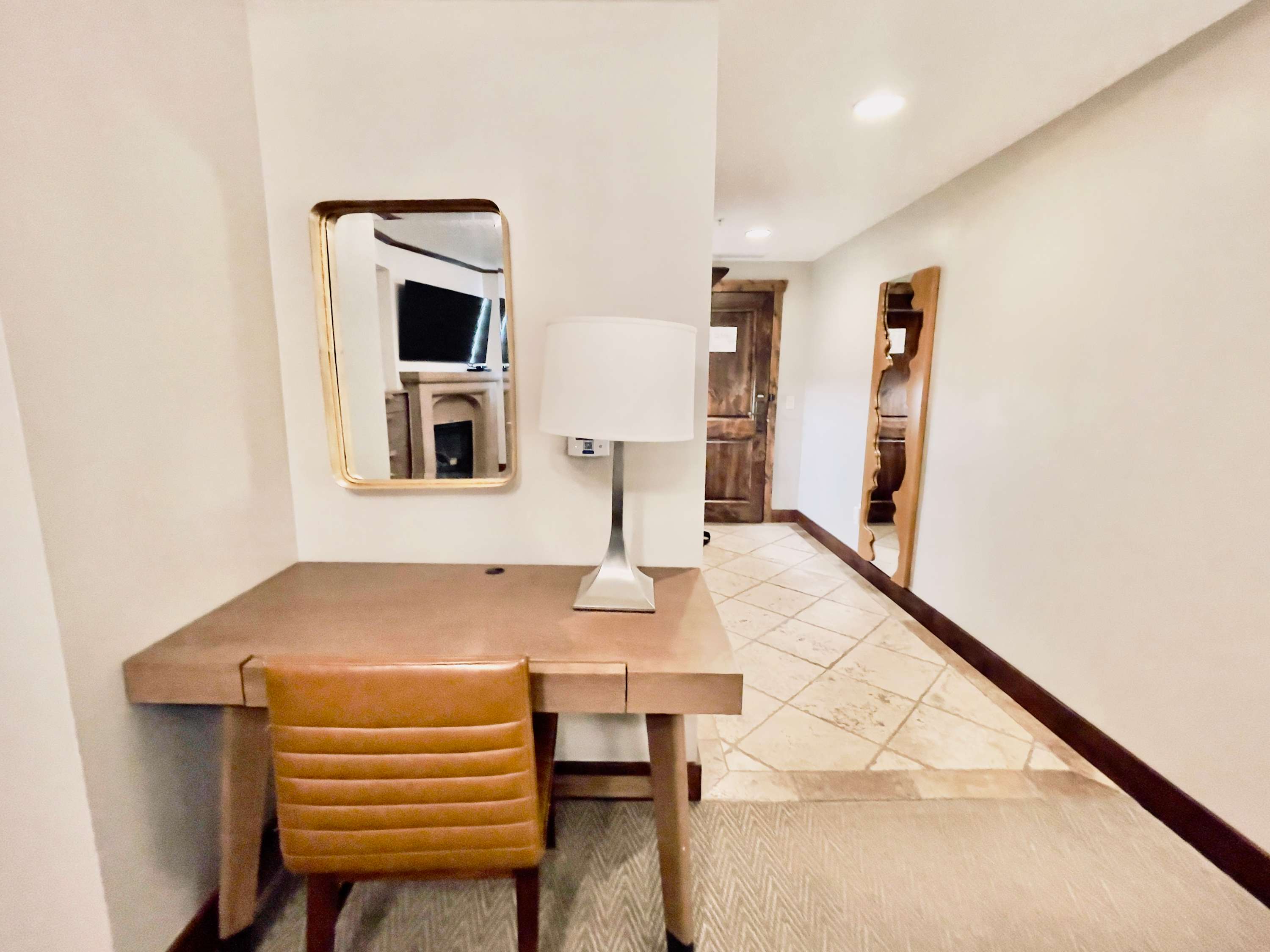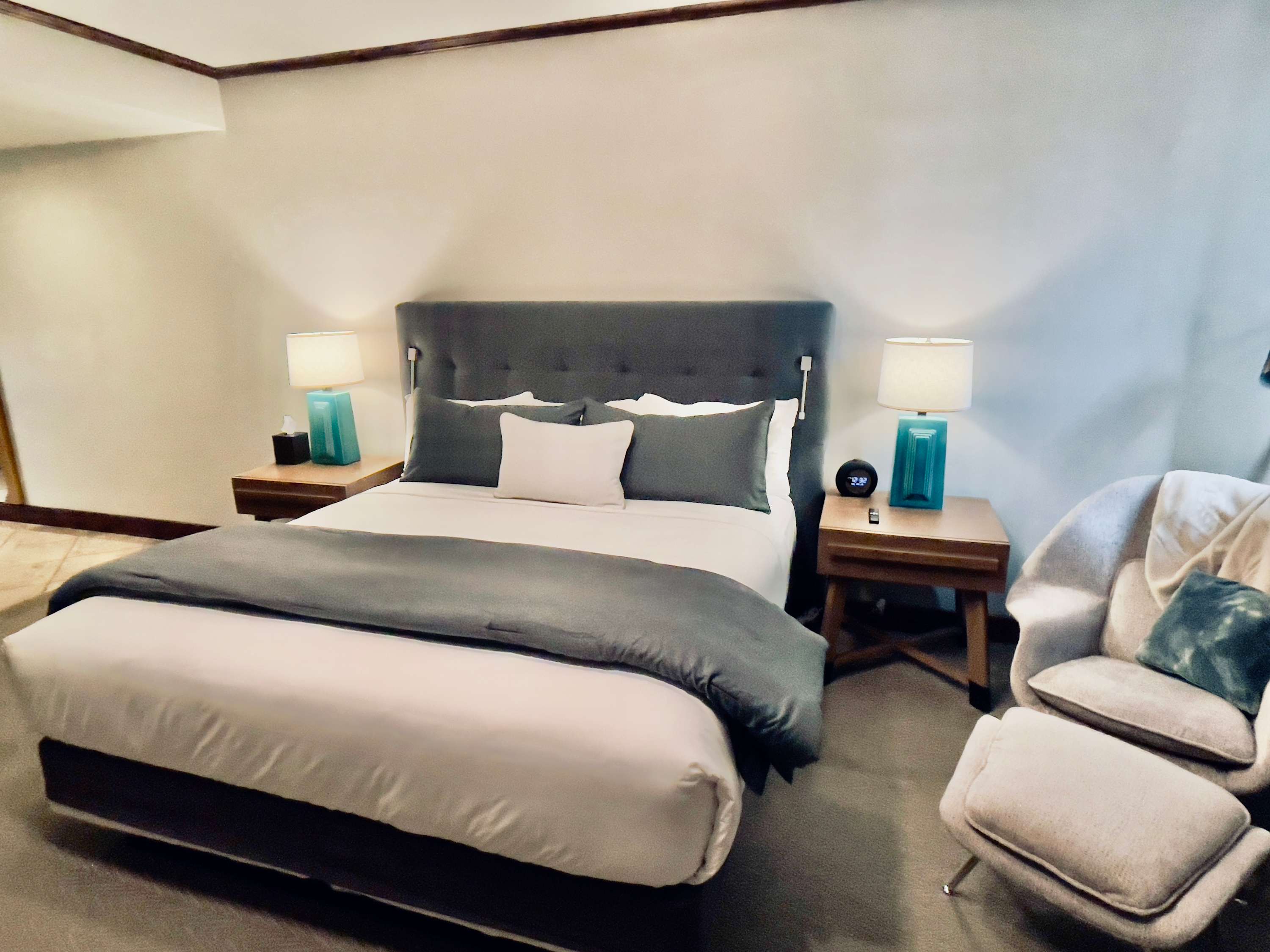 Step into this modern, thoughtfully designed studio and feel instantly at ease. The spacious layout features a plush king bed, a cozy fireplace, and a large smart TV, creating the perfect space to relax after a day outdoors. A comfortable lounge chair, large dresser, and separate closet offer both comfort and convenience, whether you're settling in for a weekend or a longer stay. The desk functions equally well as a workspace or makeup area, adding to the room’s flexibility. The kitchenette includes a refrigerator, sink, microwave, and ample cabinetry—ideal for preparing light meals or storing snacks for your mountain adventures.