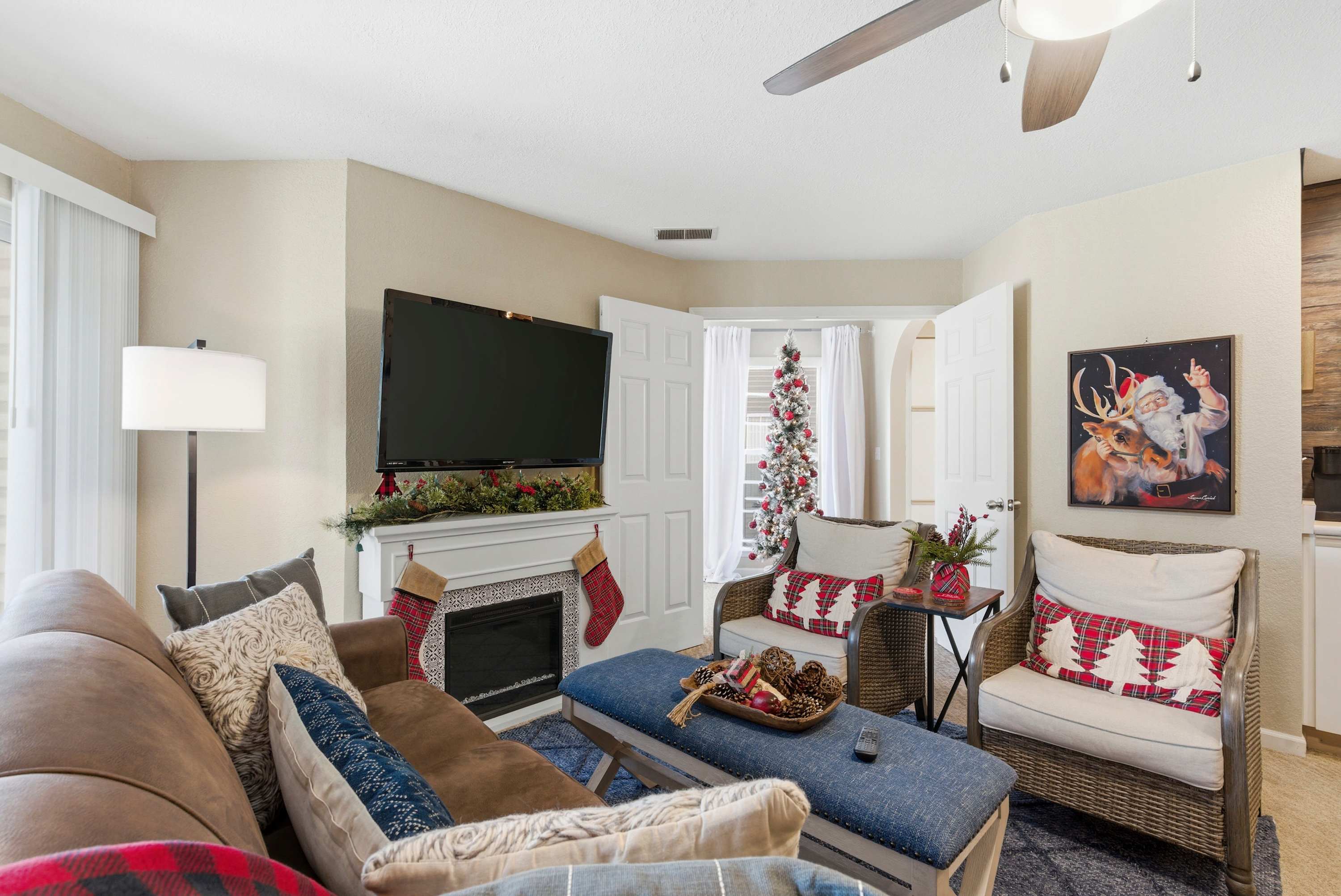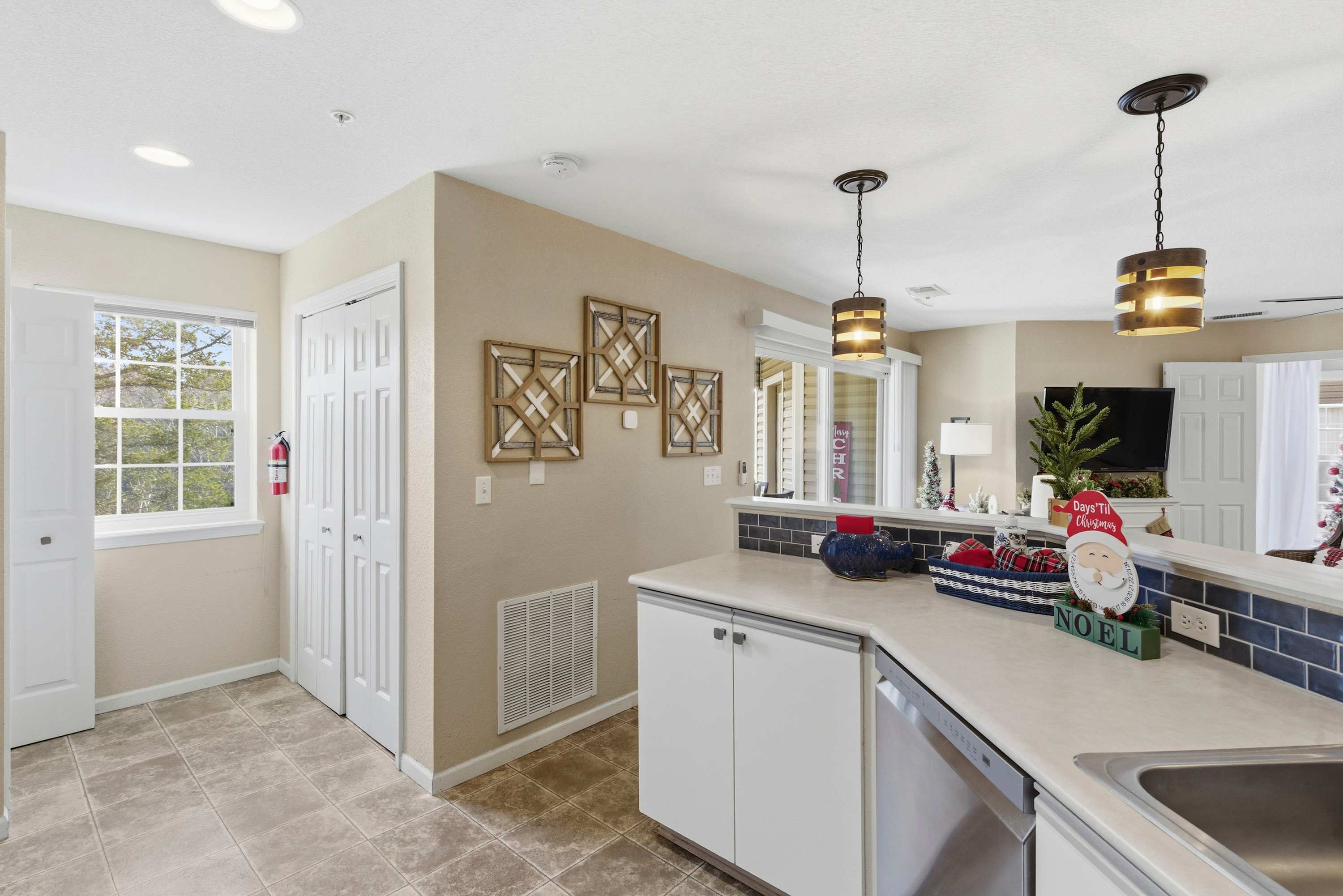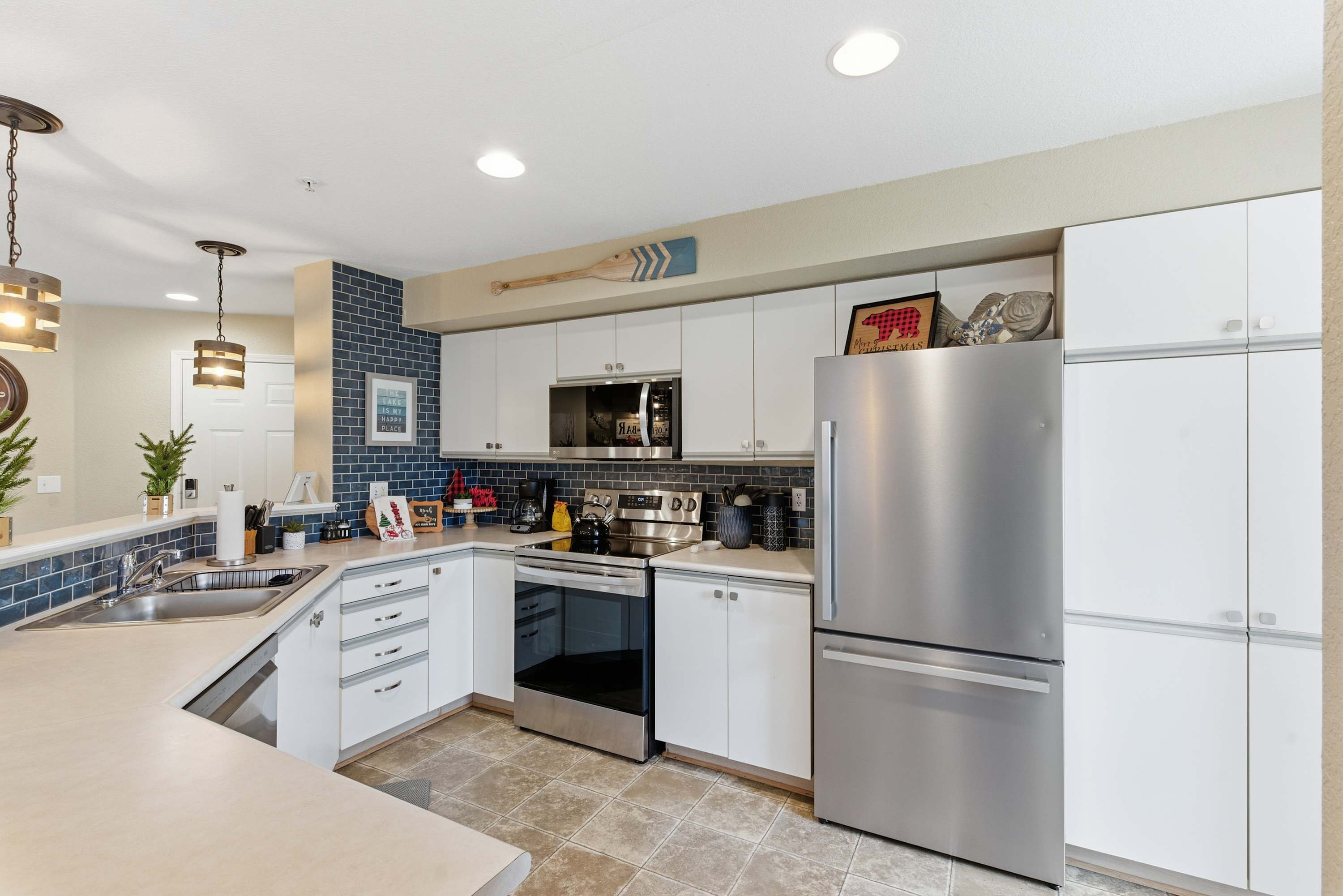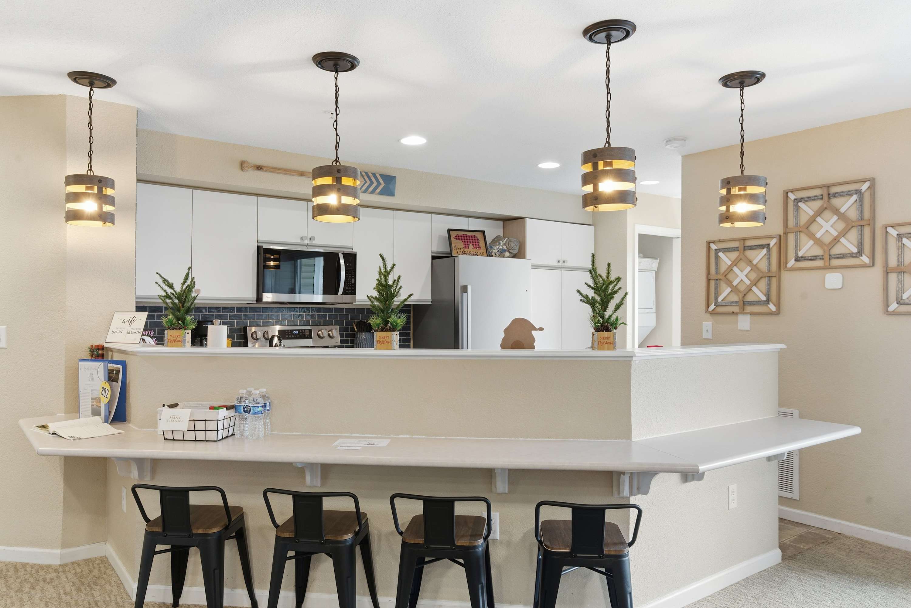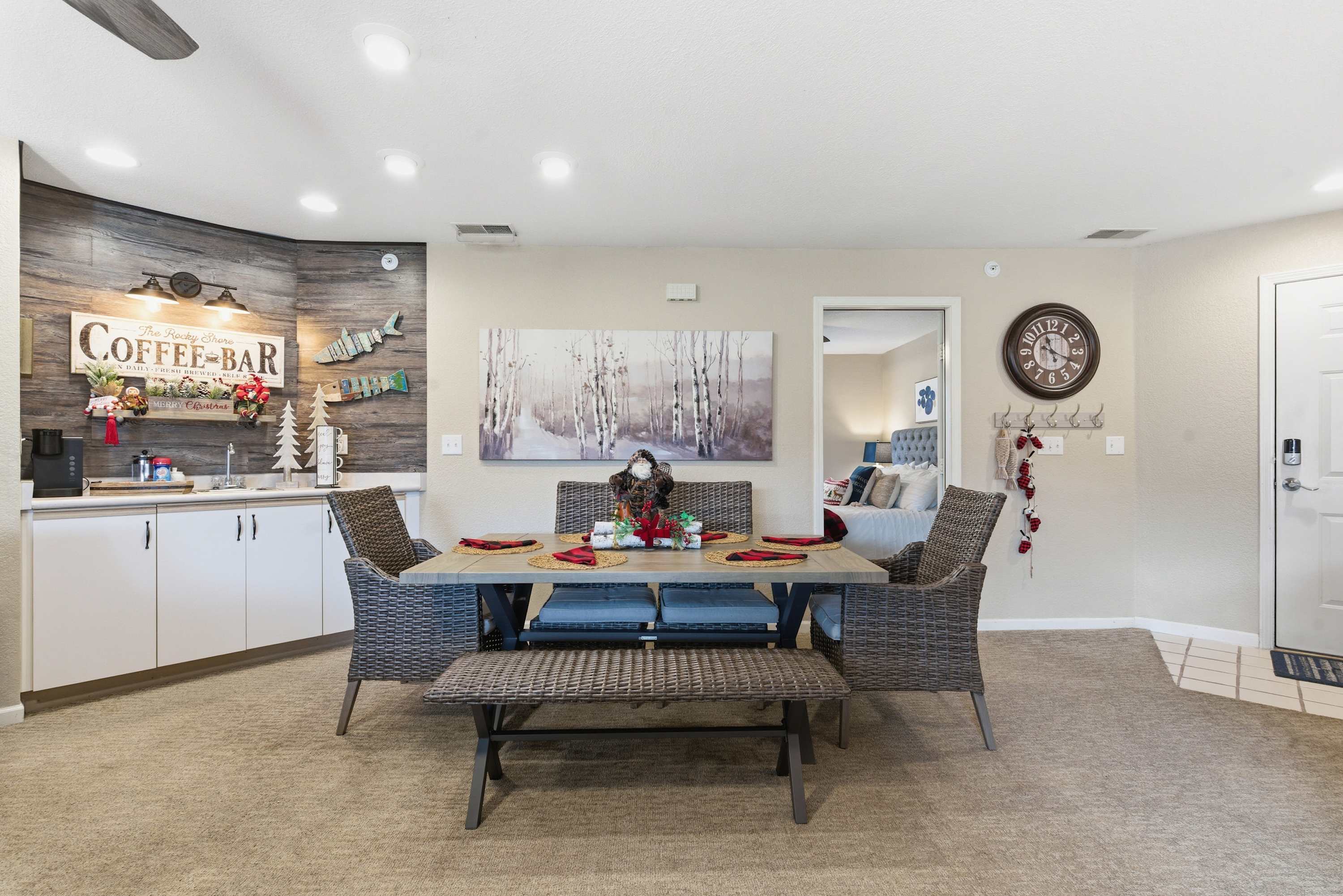 Step inside The Ozark Getaway and imagine yourself starting the day in the bright, inviting kitchen, featuring drip and Keurig coffee makers, stainless steel appliances, and counter seating for four. Gather around the dining table for six or prepare drinks at the cozy coffee bar before relaxing in the living room, where a Roku TV, comfortable couch, and two armchairs await. Step out onto the balcony with a table for four to enjoy your morning coffee or evening drink while taking in peaceful tree-lined views, making every moment of your stay feel like a true escape.