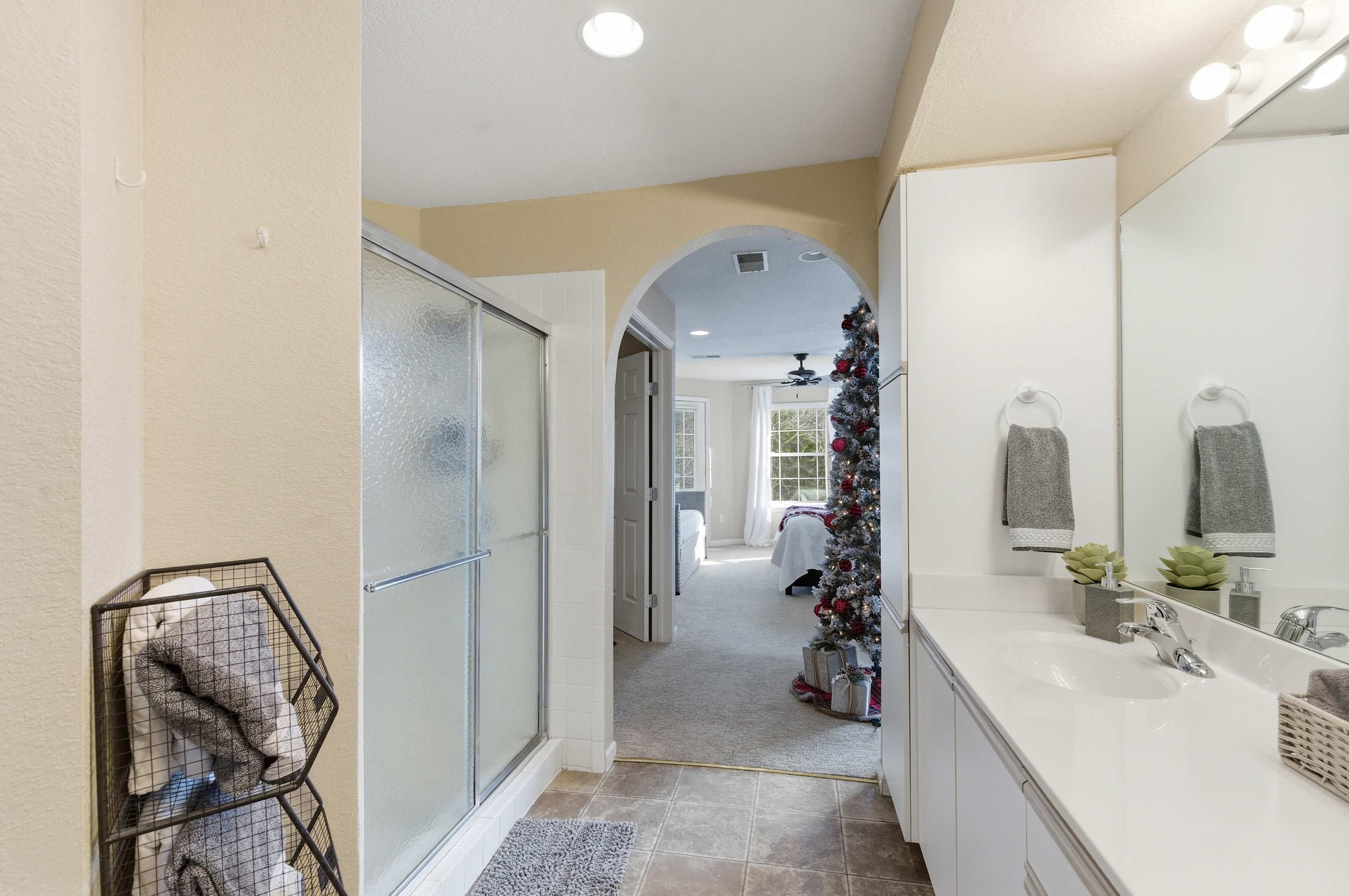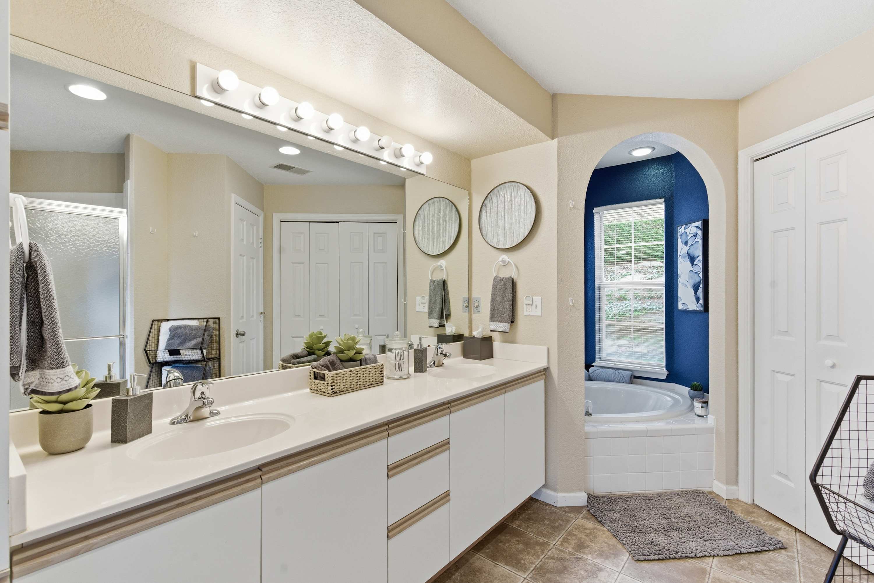 Bedroom #2 includes a king size bed, a twin size bed, a twin size trundle bed, a smart TV, and an ensuite bathroom with a dual vanity, a walk-in shower, and a soaking tub.