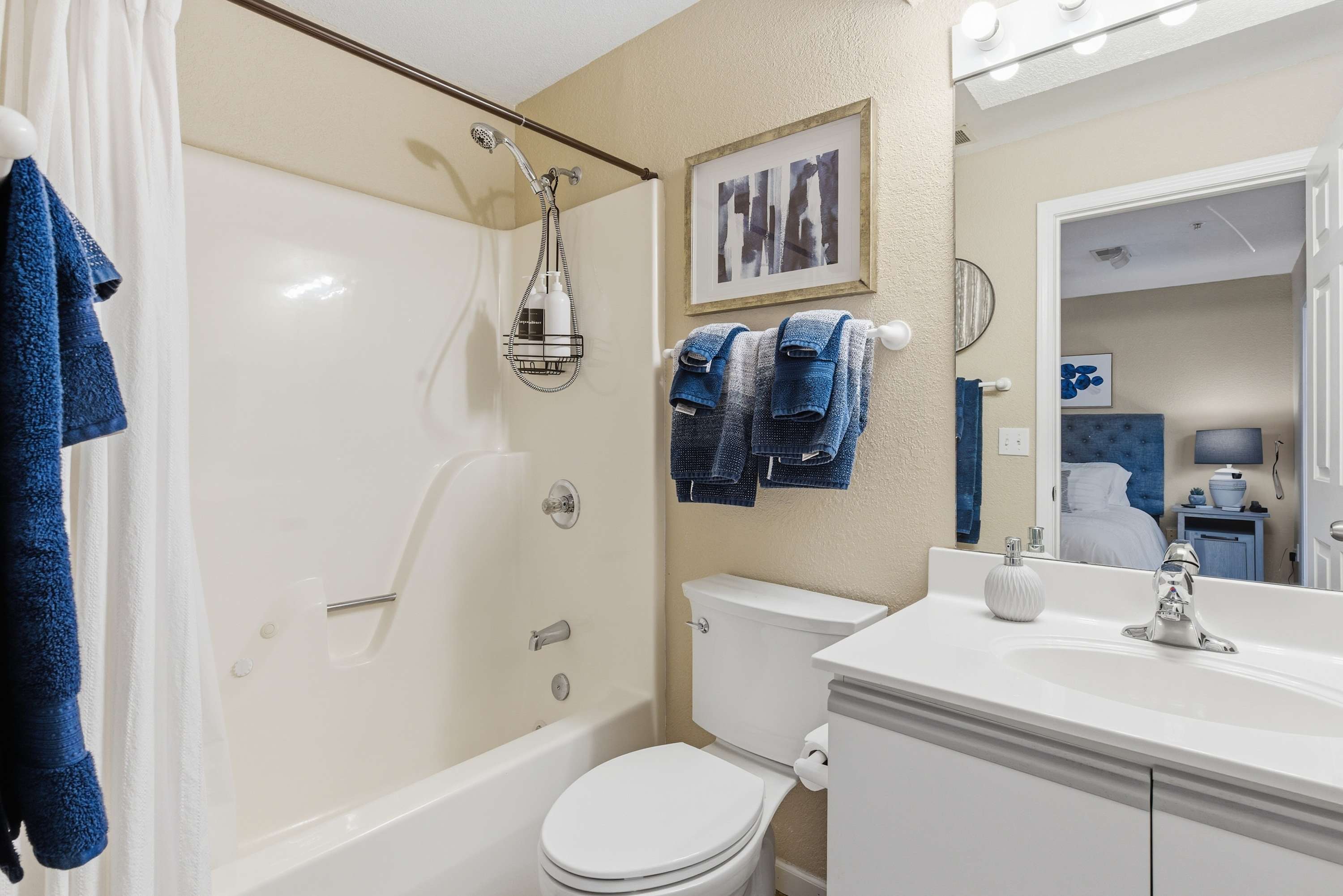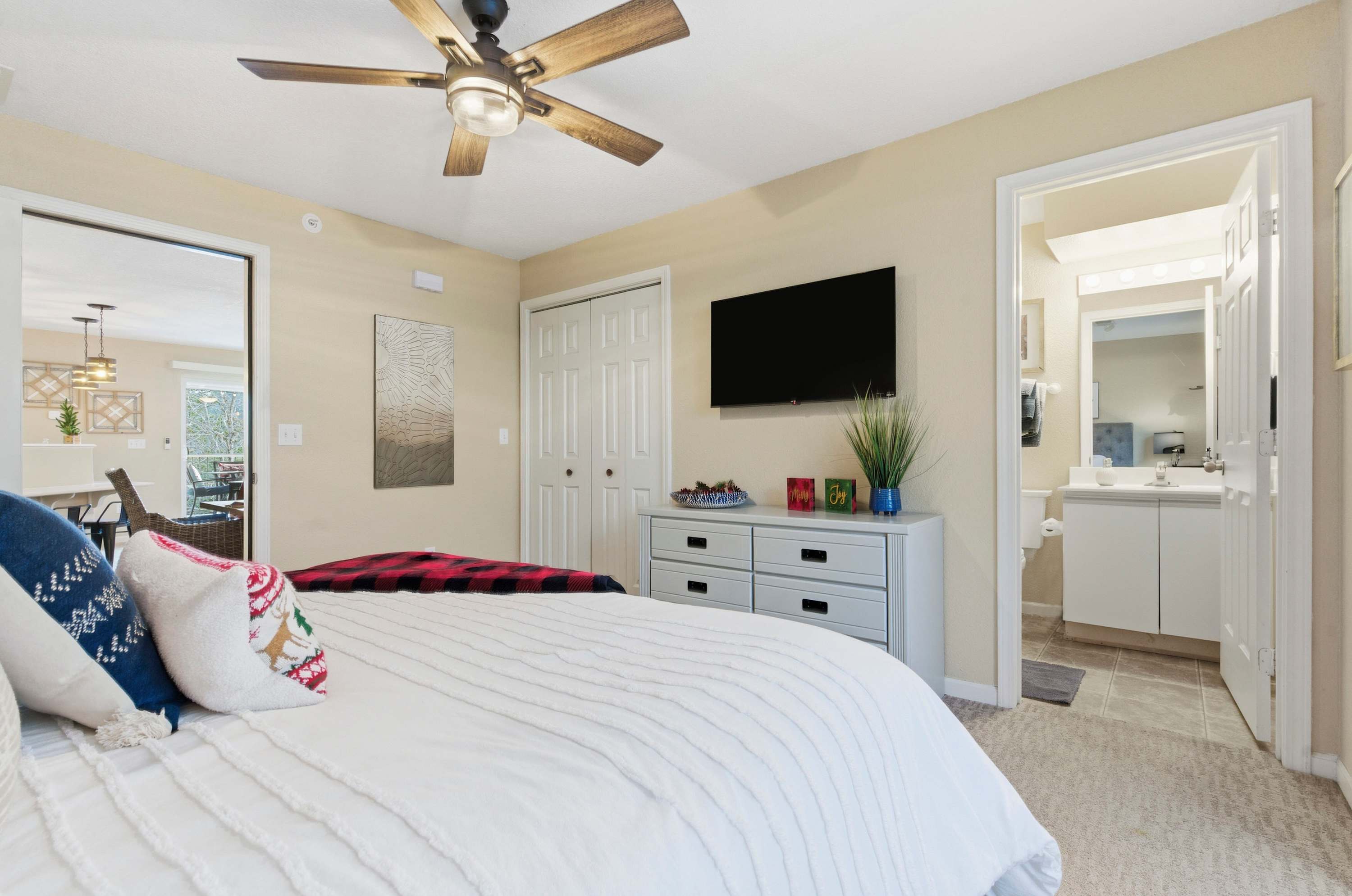 Bedroom #1 includes a king size bed, a couch, a smart TV, and an ensuite bathroom with a single vanity and a shower/tub combo.