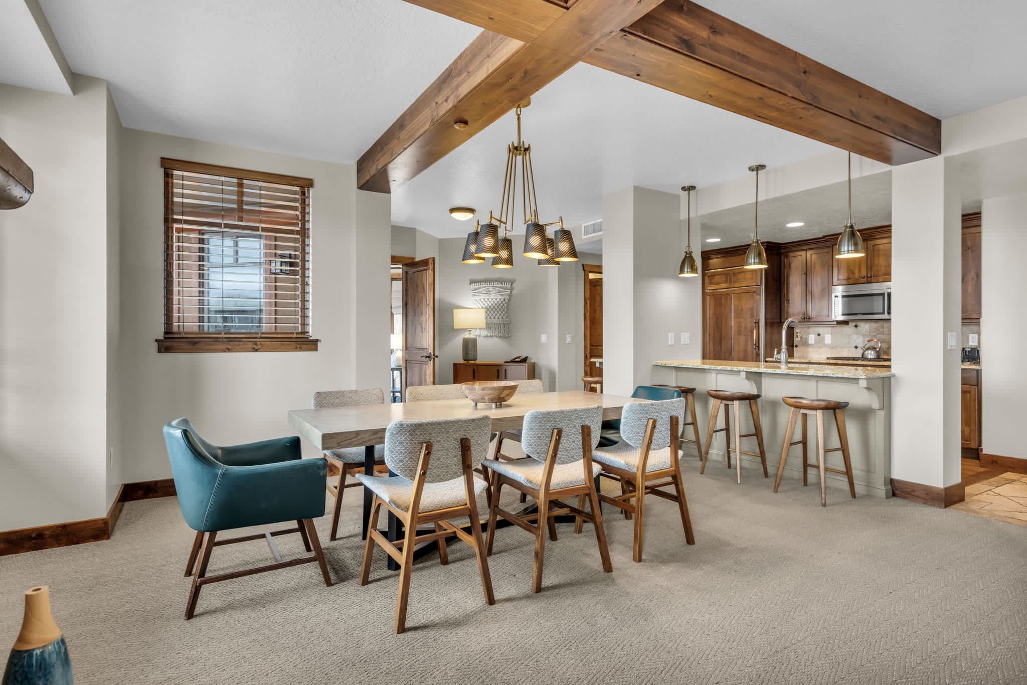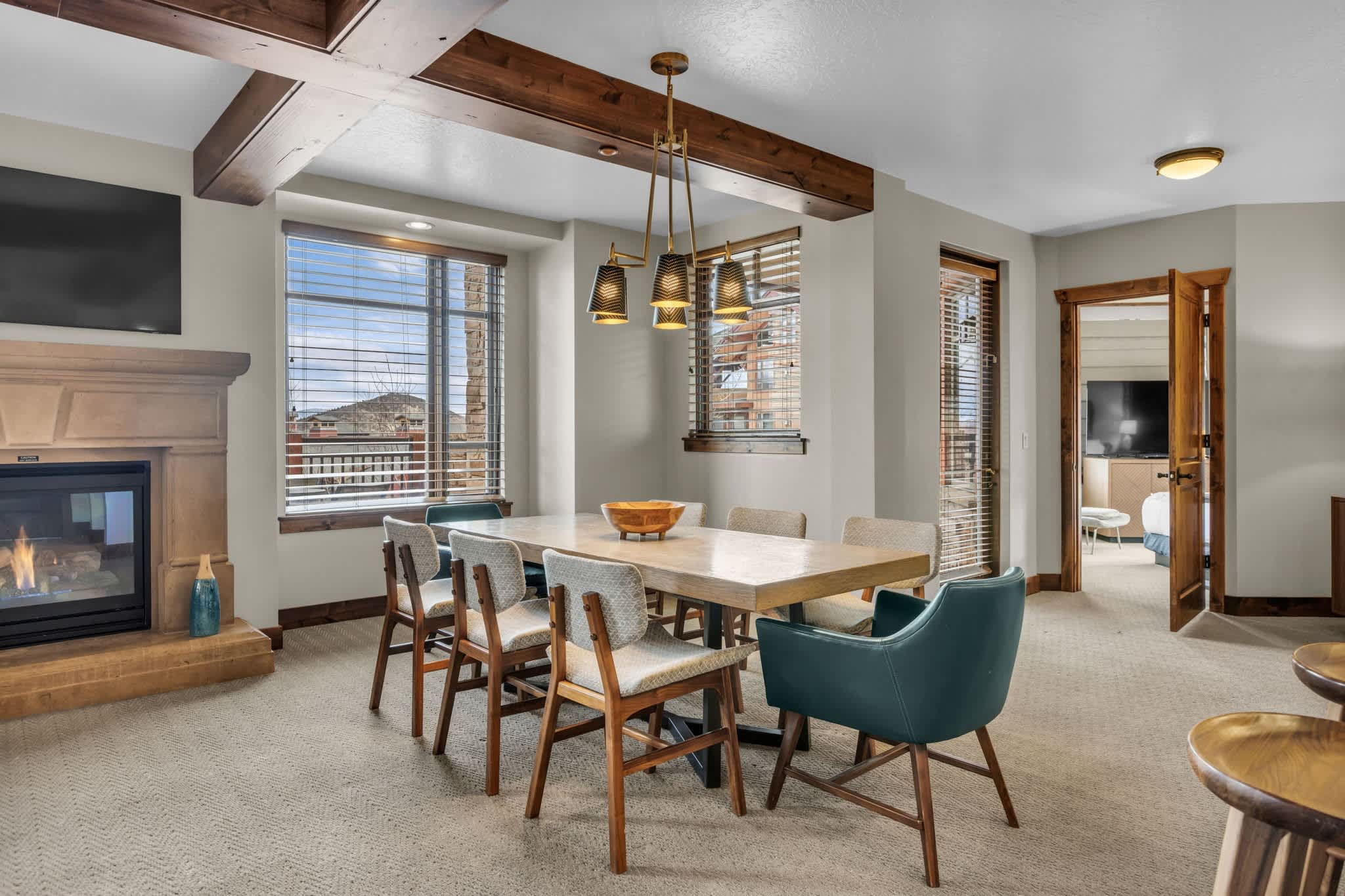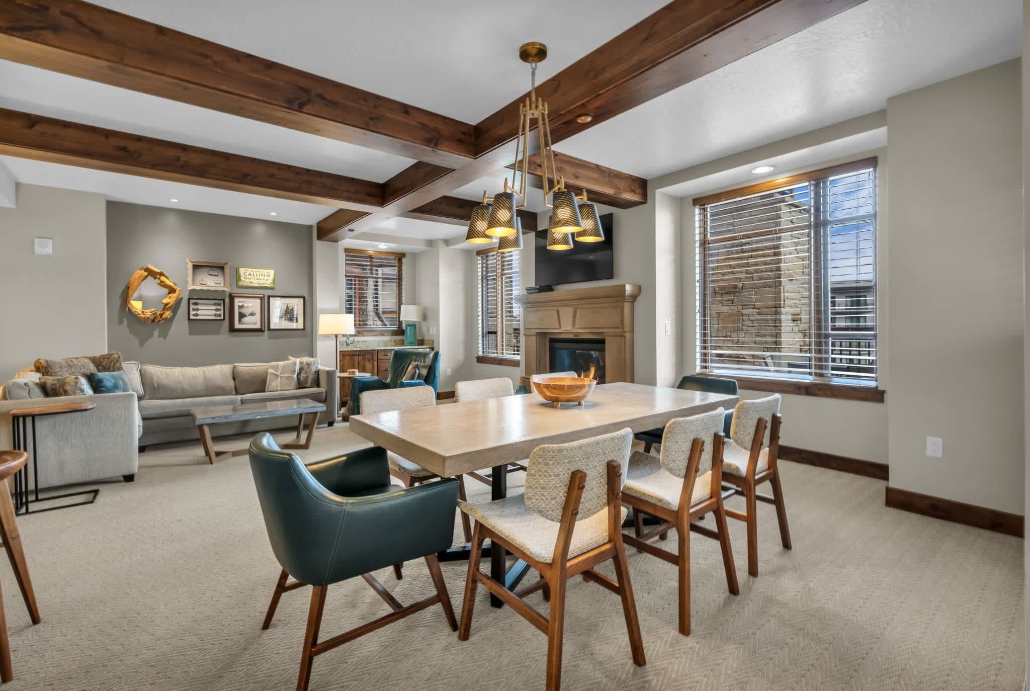 Imagine unwinding in the open, lodge-style living room, where a large smart TV with cable, a wraparound couch, and a crackling fireplace create the perfect après-ski atmosphere. A wine chiller stands ready for your favorite bottles, while sliding doors lead to a private deck overlooking the brand-new Sunrise Gondola, giving you front-row views of the mountains and skiers gliding by. The experience continues in the full gourmet kitchen, featuring a Wolf range, rich finishes, and a scenic outlook that transforms cooking into part of the vacation. Start your mornings at the coffee bar, gather around the modern dining table for eight, or enjoy casual bites at the four kitchen stools. Every detail of this condo is crafted for comfort, style, and effortless enjoyment.