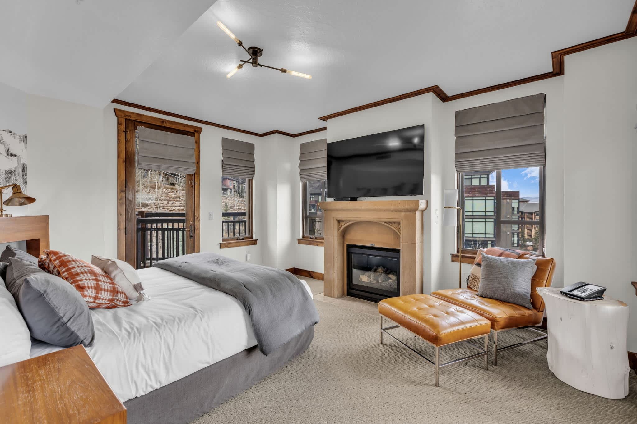 Bedroom #1 includes a king size bed, a sitting area, a smart TV also equipped with cable, a fireplace, deck access, and an ensuite bathroom with a dual vanity and a shower/tub combo.
