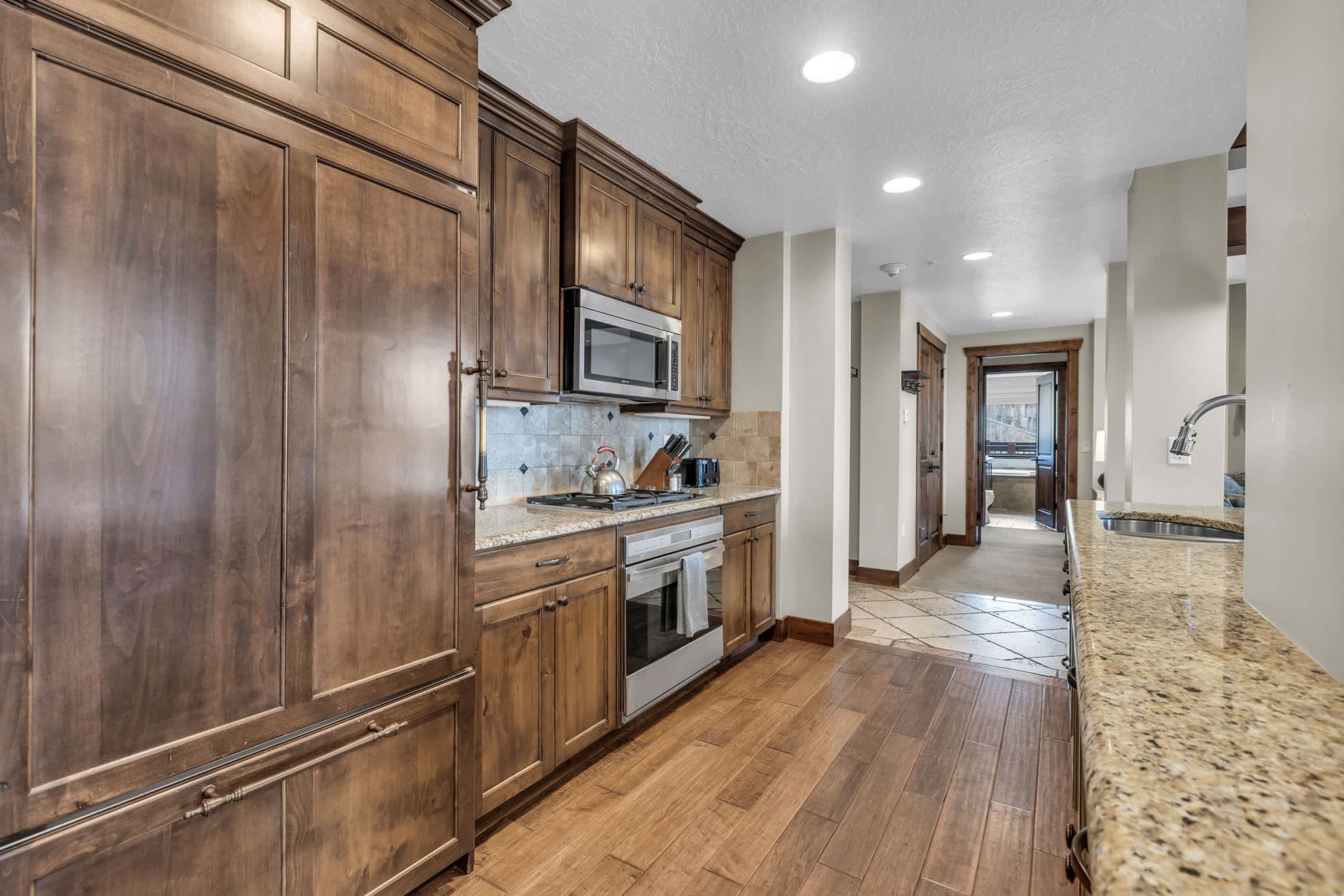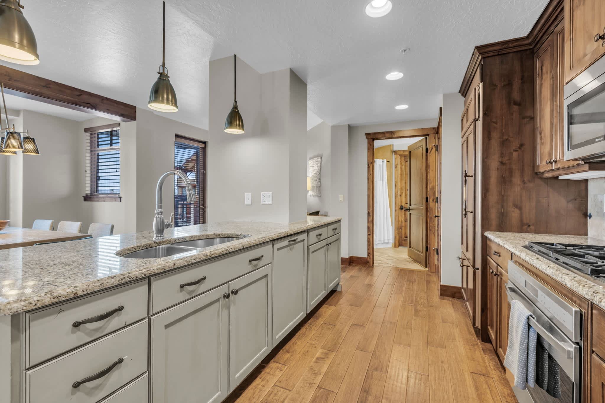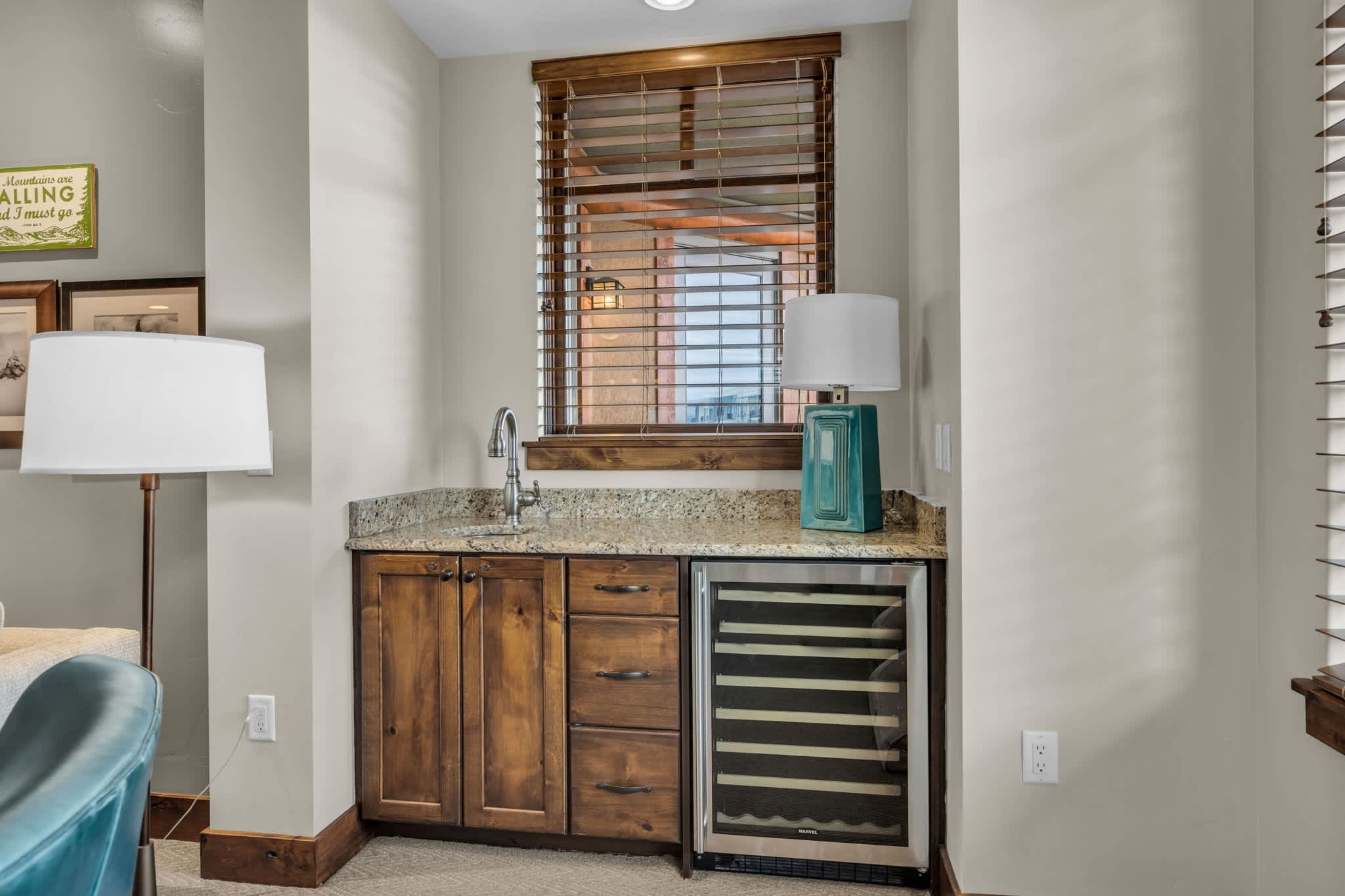And over at Sunrise Gondola Retreat, you can imagine unwinding in the open, lodge-style living room, where a large smart TV with cable, a wraparound couch, and a crackling fireplace create the perfect après-ski atmosphere. A wine chiller stands ready for your favorite bottles, while sliding doors lead to a private deck overlooking the brand-new Sunrise Gondola, giving you front-row views of the mountains and skiers gliding by. The experience continues in the full gourmet kitchen, featuring a Wolf range, rich finishes, and a scenic outlook that transforms cooking into part of the vacation. Start your mornings at the coffee bar, gather around the modern dining table for eight, or enjoy casual bites at the four kitchen stools. Every detail of this condo is crafted for comfort, style, and effortless enjoyment.