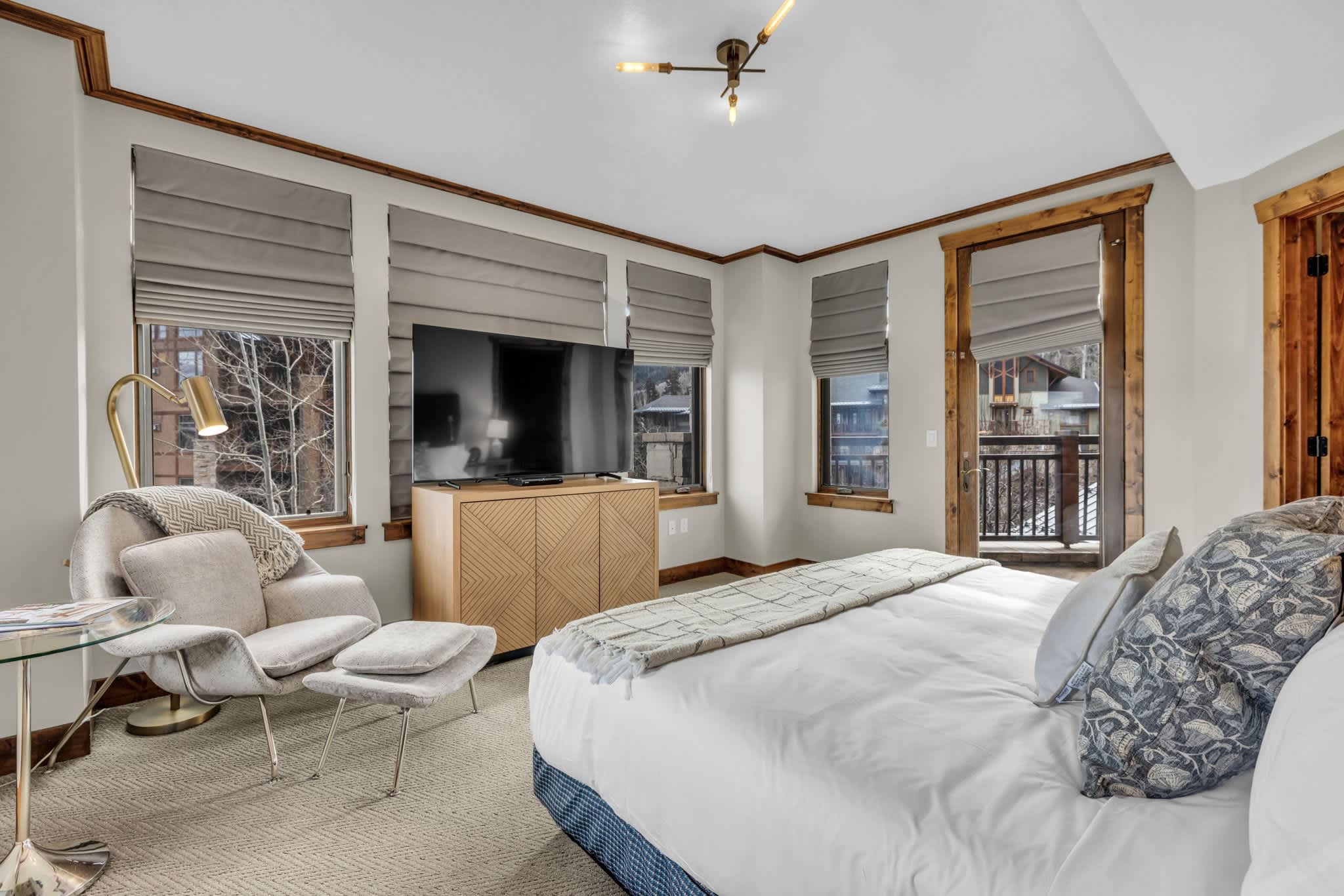 Bedroom #1 includes a king size bed, a sitting area, a smart TV also equipped with cable, a fireplace, deck access, and an ensuite bathroom with a dual vanity and a shower/tub combo.
