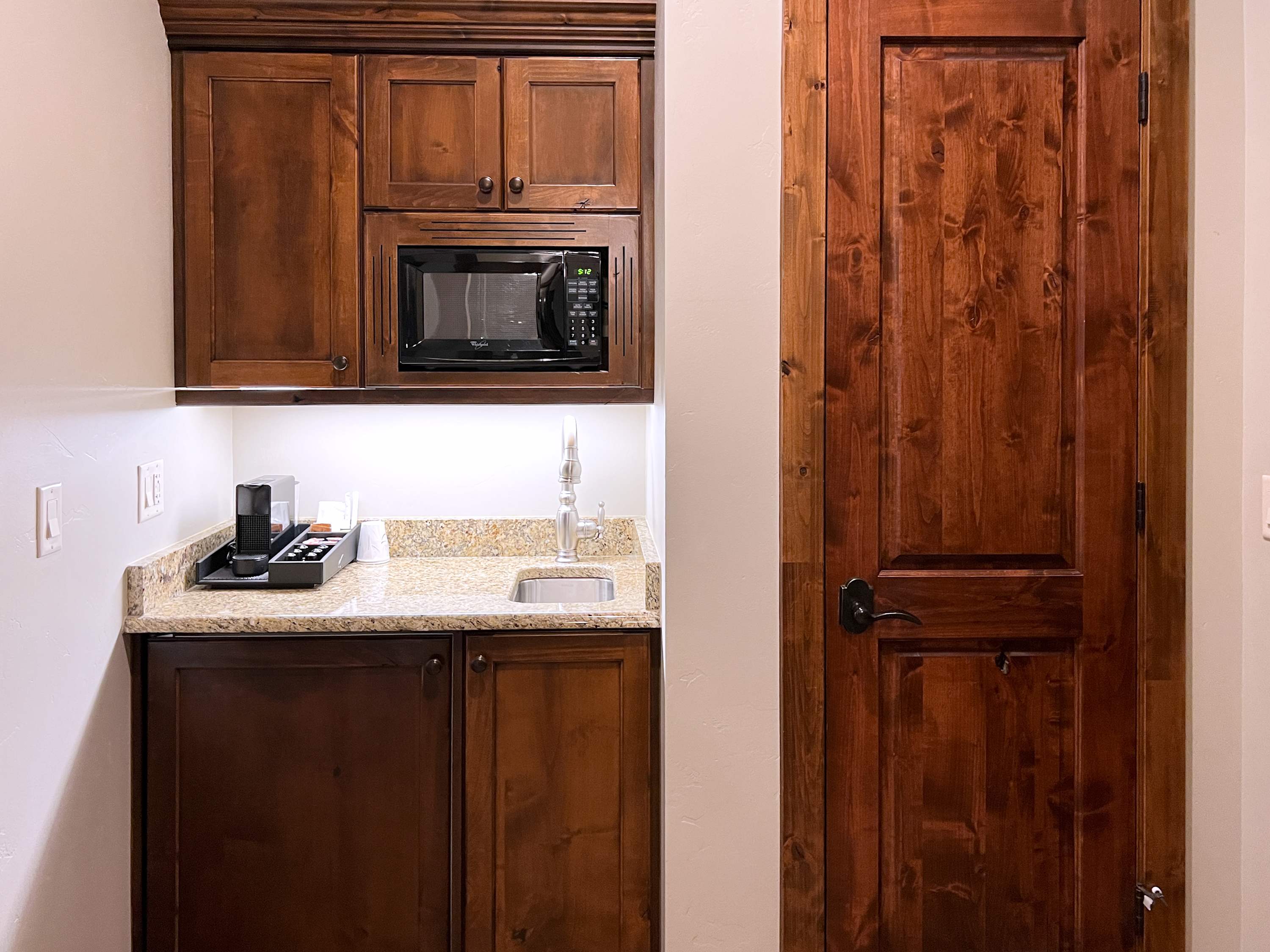 Comprised of 2 completely separate homes that can be booked individually, Sunrise Gondola Getaway and Sunrise Gondola Retreat, guests now have the flexibility and convenience to book both together, where both units become yours for the duration of your stay. Step into Sunrise Gondola Getaway—a modern, thoughtfully designed studio where you can feel instantly at ease. The spacious layout features a plush king bed, a cozy fireplace, and a large smart TV, creating the perfect space to relax after a day outdoors. Aside from the lounging chair, the desk functions equally well as a workspace or makeup area, adding to the room’s flexibility. The kitchenette includes a refrigerator, sink, microwave, and ample cabinetry—ideal for preparing light meals or storing snacks for your mountain adventures.