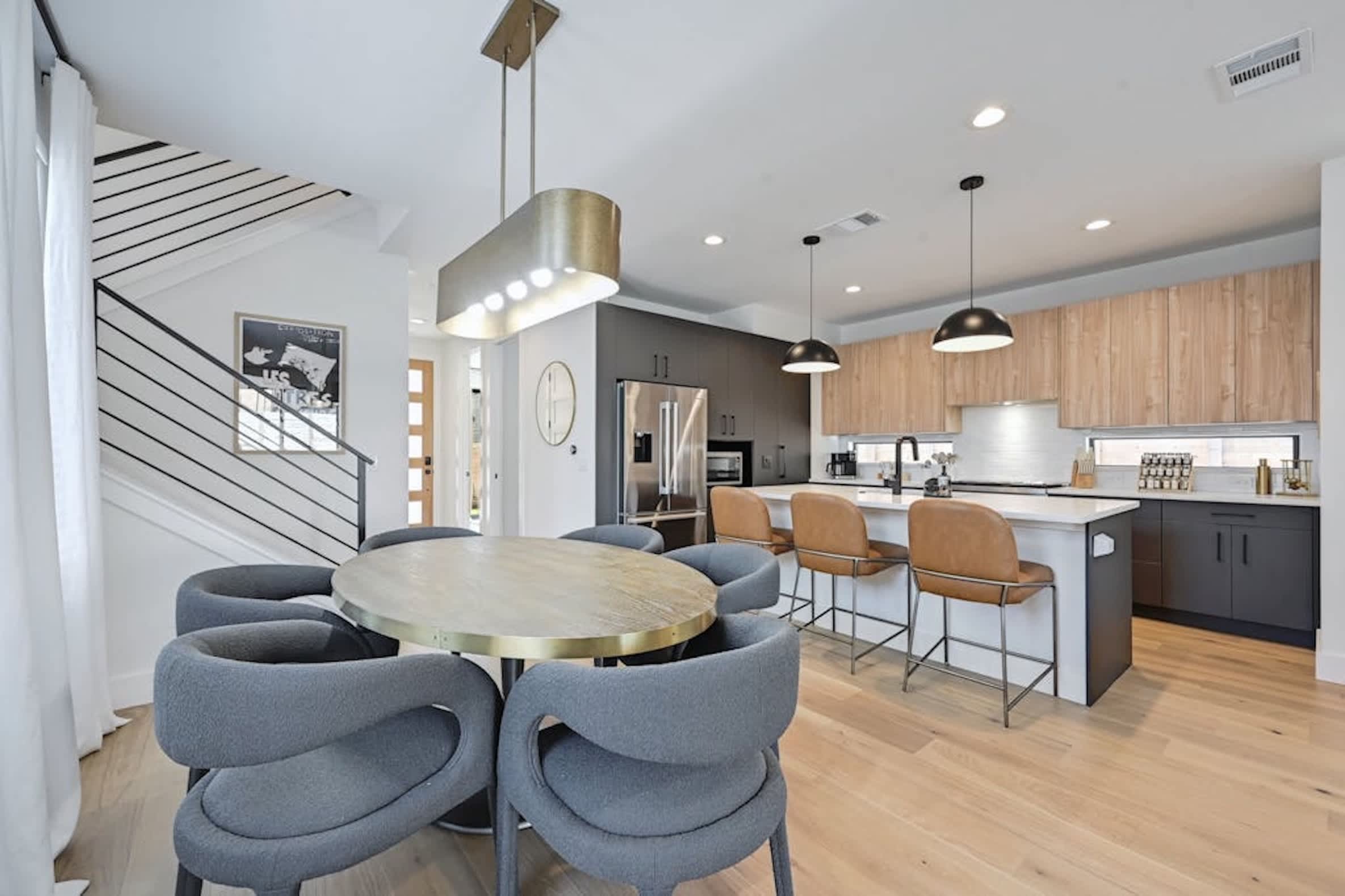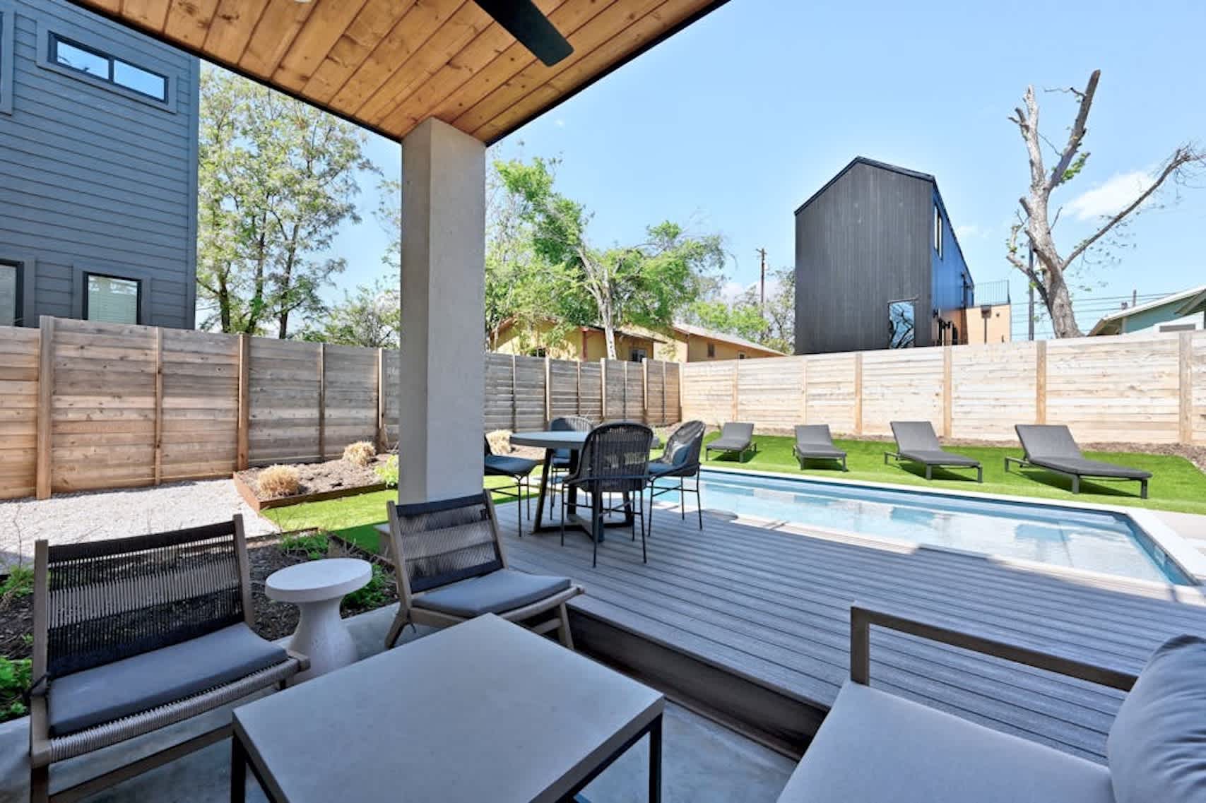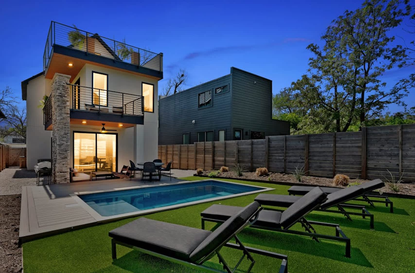 Welcome to Chic Austin Oasis! This modern 5-bedroom townhouse sleeps up to 11 and puts you minutes from local restaurants, live music, and iconic Austin landmarks—plus a private 4-ft pool and a rooftop patio with city views.
