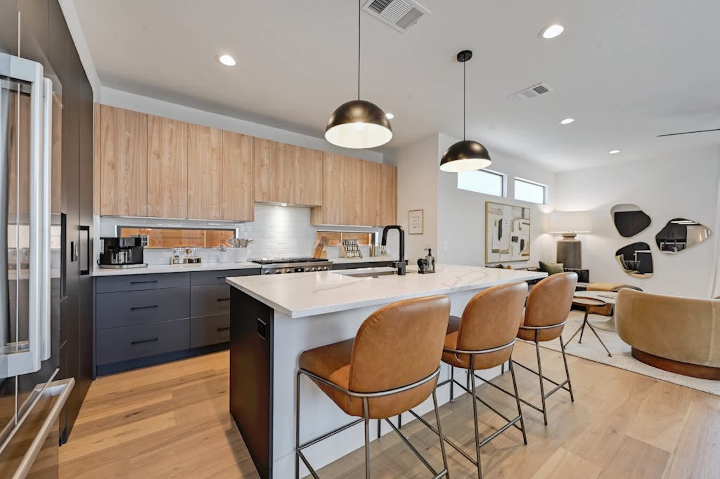 Designed for easy group stays, this chic, multi-level townhouse features 5 bedrooms and 4 bathrooms, with open-concept living and plenty of indoor/outdoor hangout space. The living room offers a smart TV and opens to a side patio where you can relax beside the private 4-ft-deep pool. The modern kitchen is fully equipped and includes a Keurig, pantry storage, and an island with seating for 3; the adjacent dining area seats 6 for shared meals.