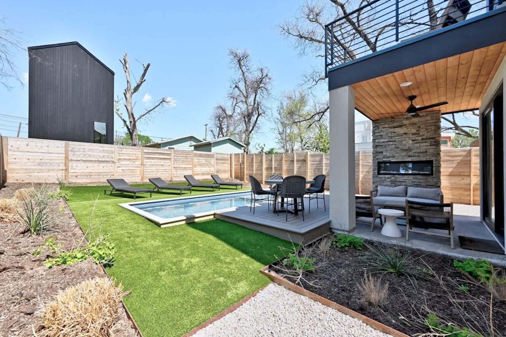 • Three levels of outdoor space: first-floor patio with private 4-ft pool and seating, second-floor wraparound balcony, and third-floor rooftop patio with city views