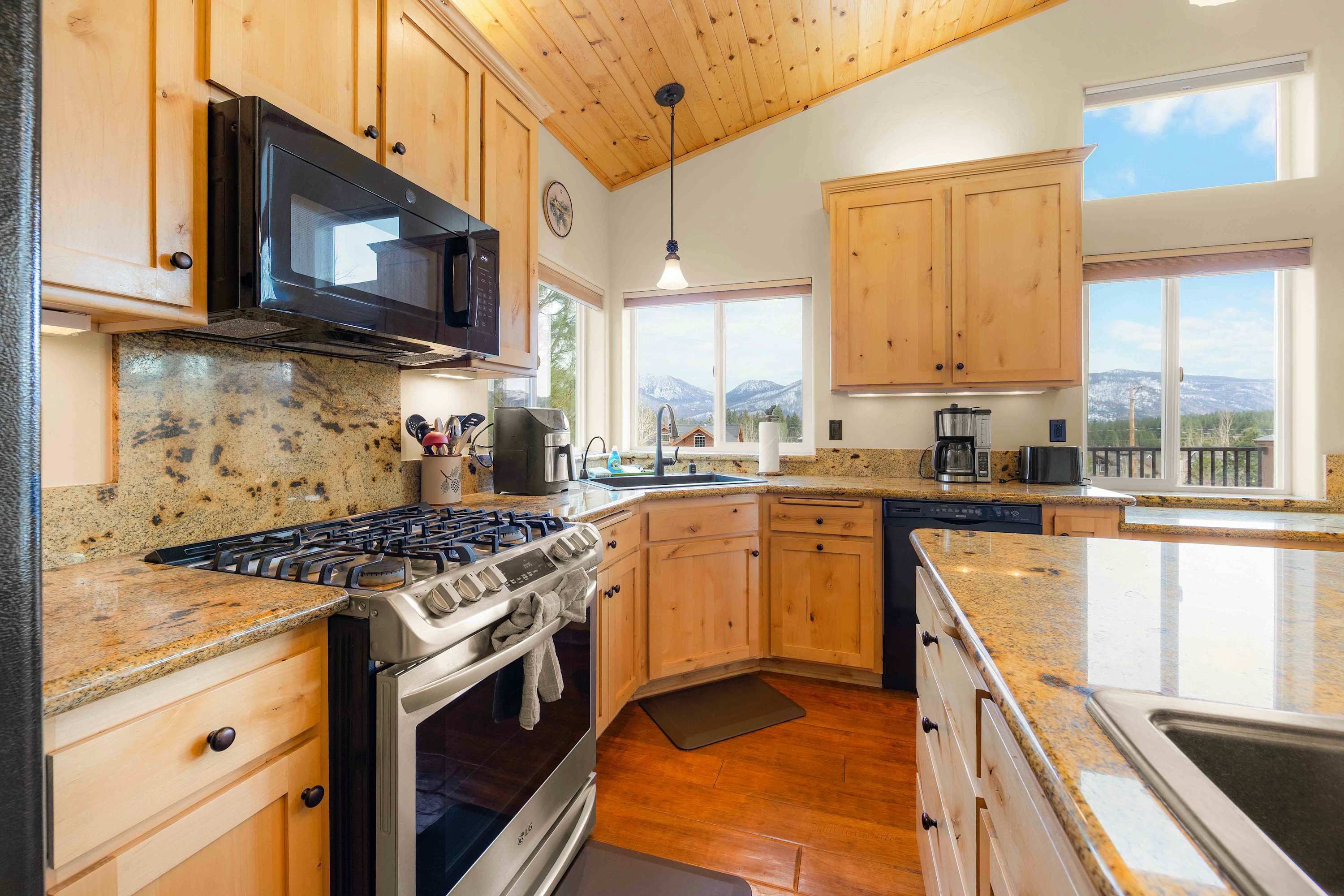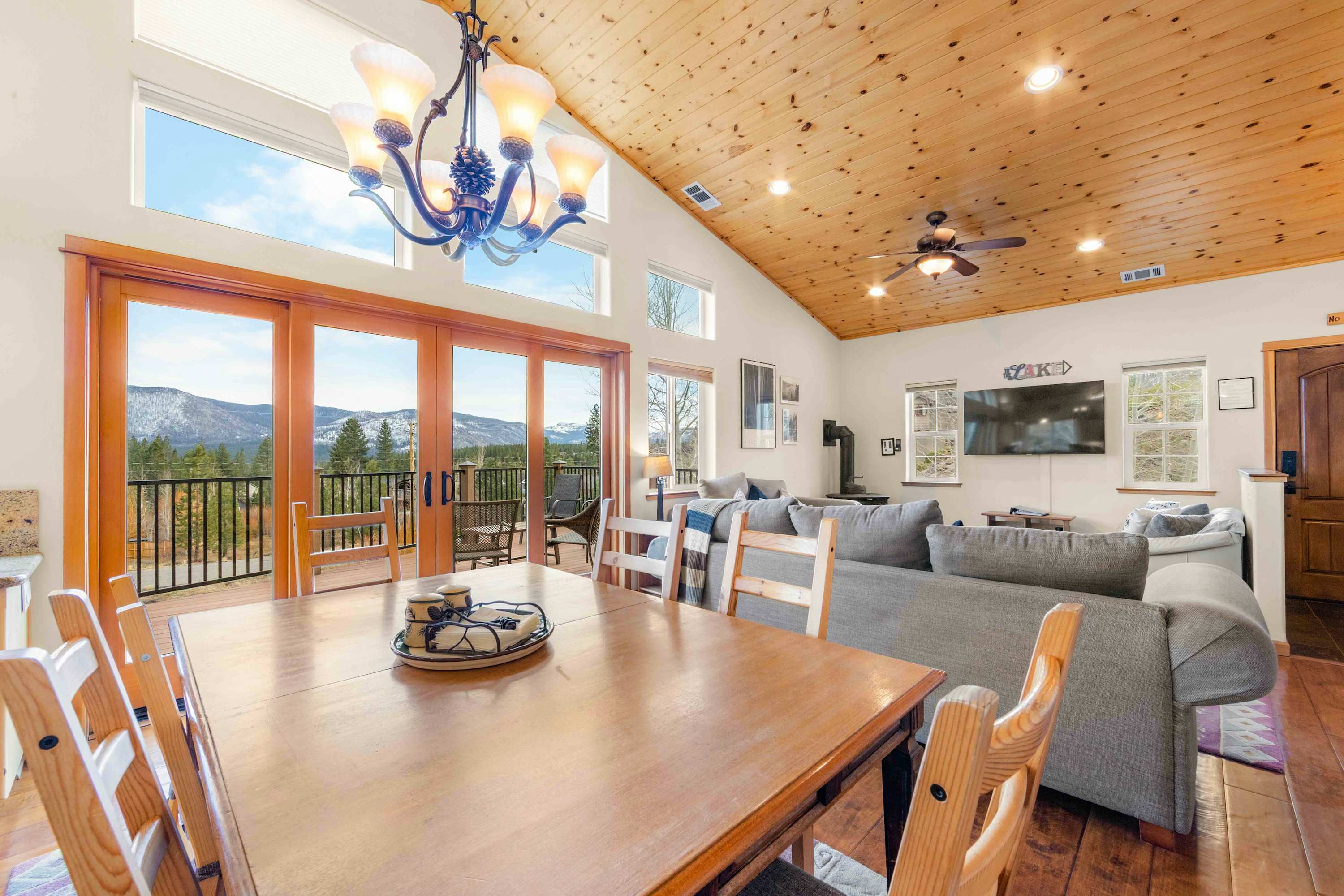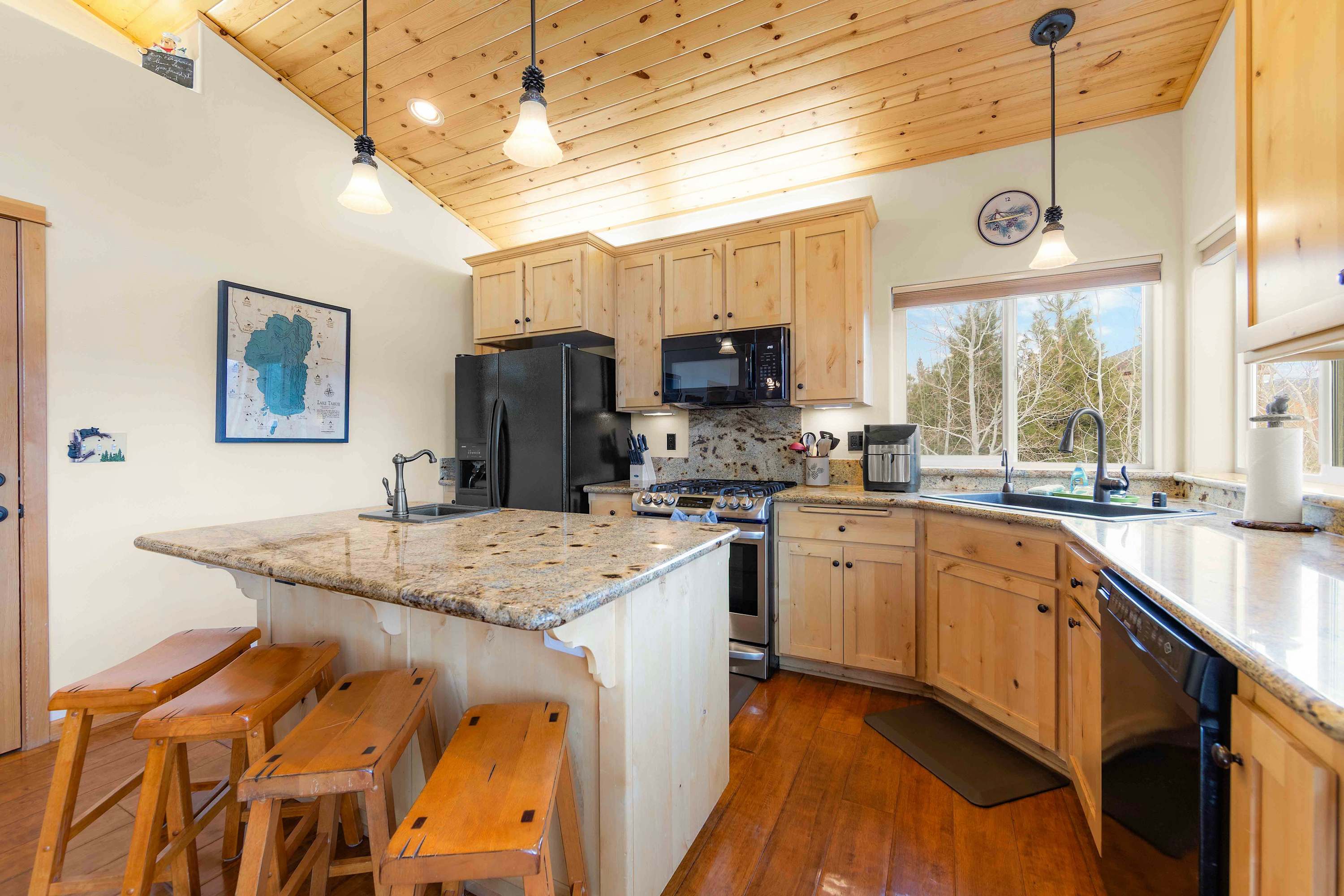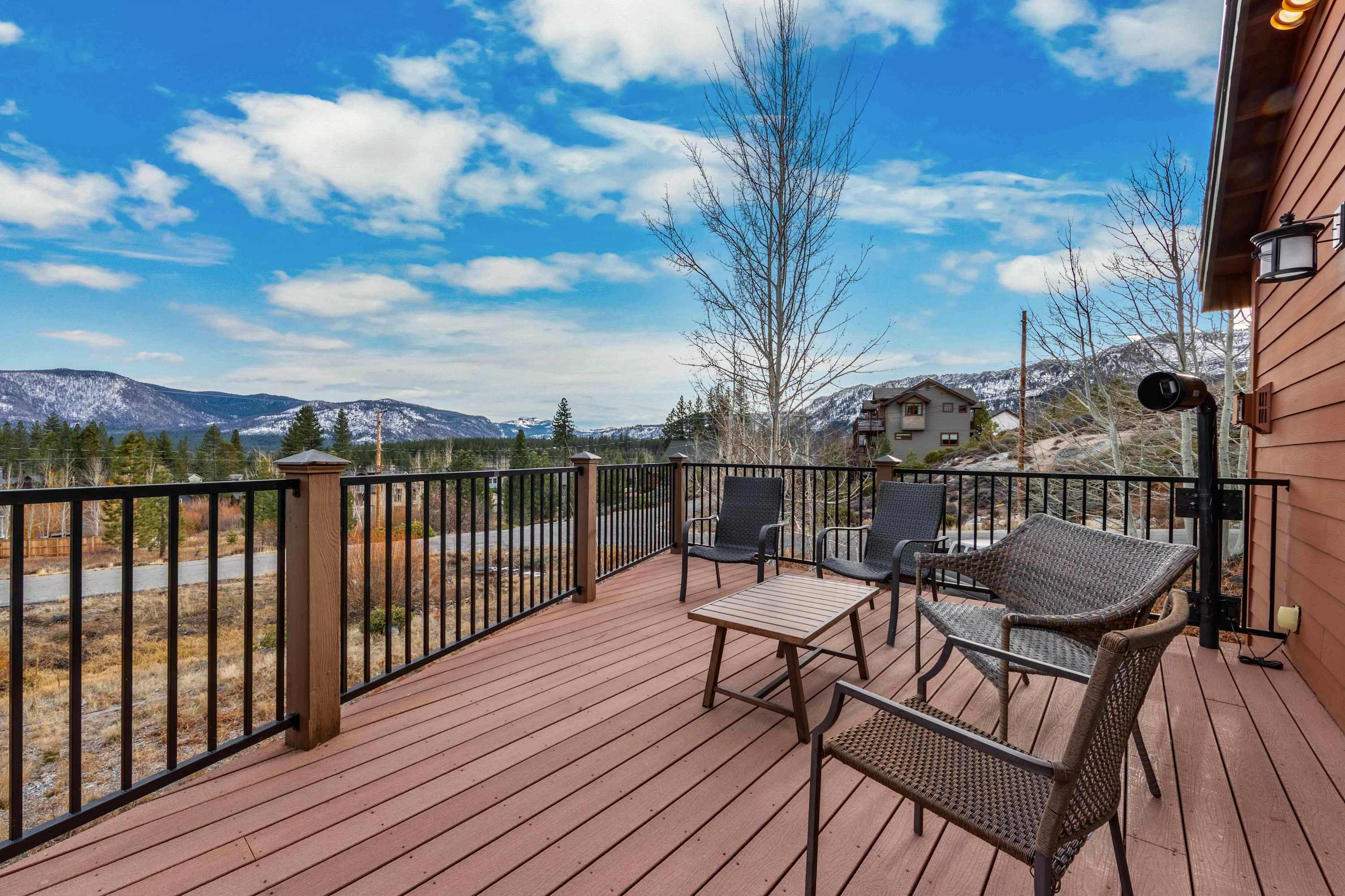 Step inside to a bright, open floor plan where the living, dining, and kitchen areas flow together beneath high peaked ceilings and walls of windows that flood the space with natural light. The living room feels both spacious and cozy, featuring a gas stove fireplace, two love seats, a full couch, and a smart TV—ideal for relaxing after a day outdoors. Gather around the dining table for six for shared meals, or pull up a stool at the kitchen island, which offers bar seating for four and opens seamlessly to the heart of the home. Step out onto the balcony, where comfortable seating, a grill, and beautiful mountain views create an inviting space for morning coffee or sunset dinners. When it’s time to rest, the bedrooms are designed for comfort with room-darkening shades, ensuring a peaceful night’s sleep so you can wake refreshed and ready to enjoy another unforgettable day in Tahoe.