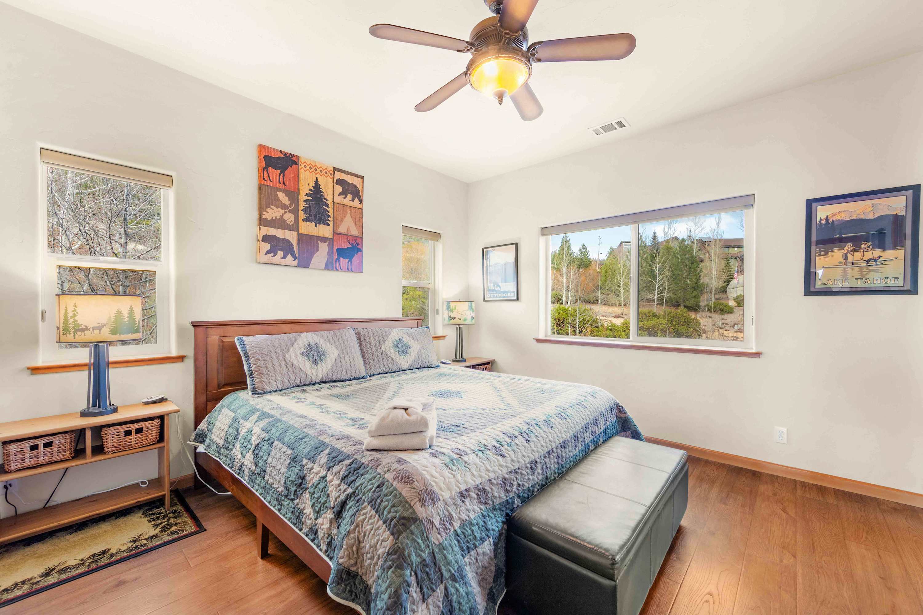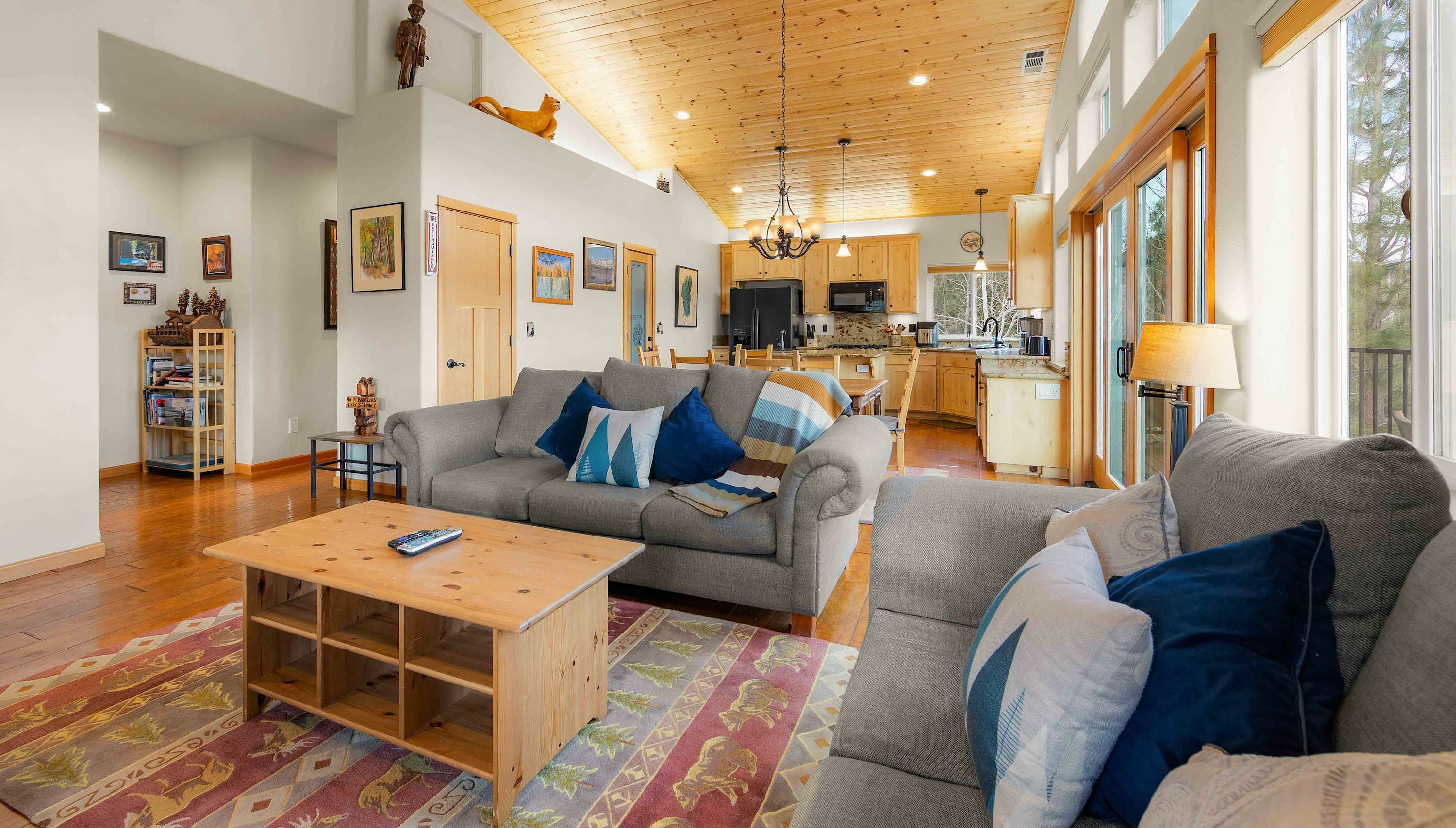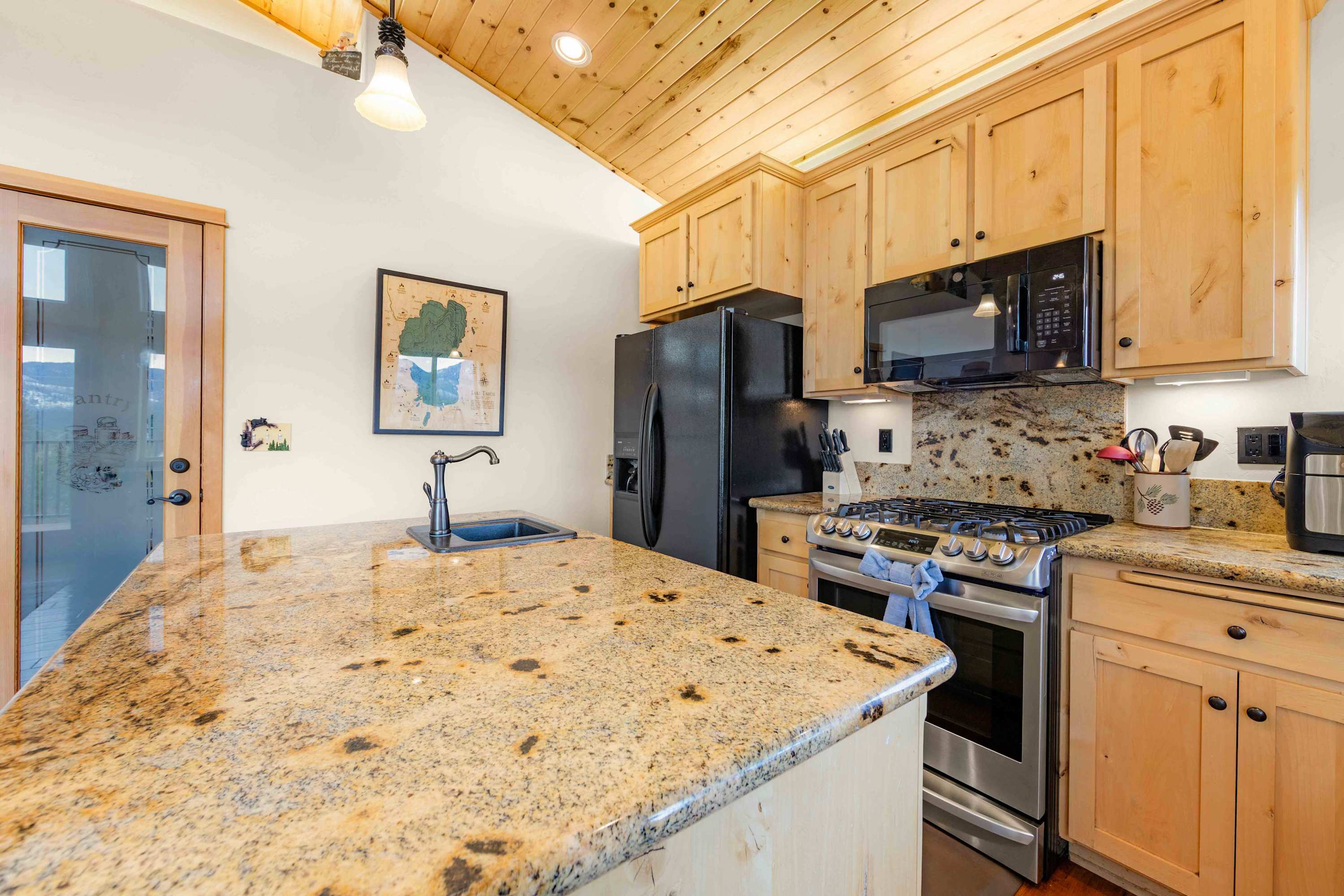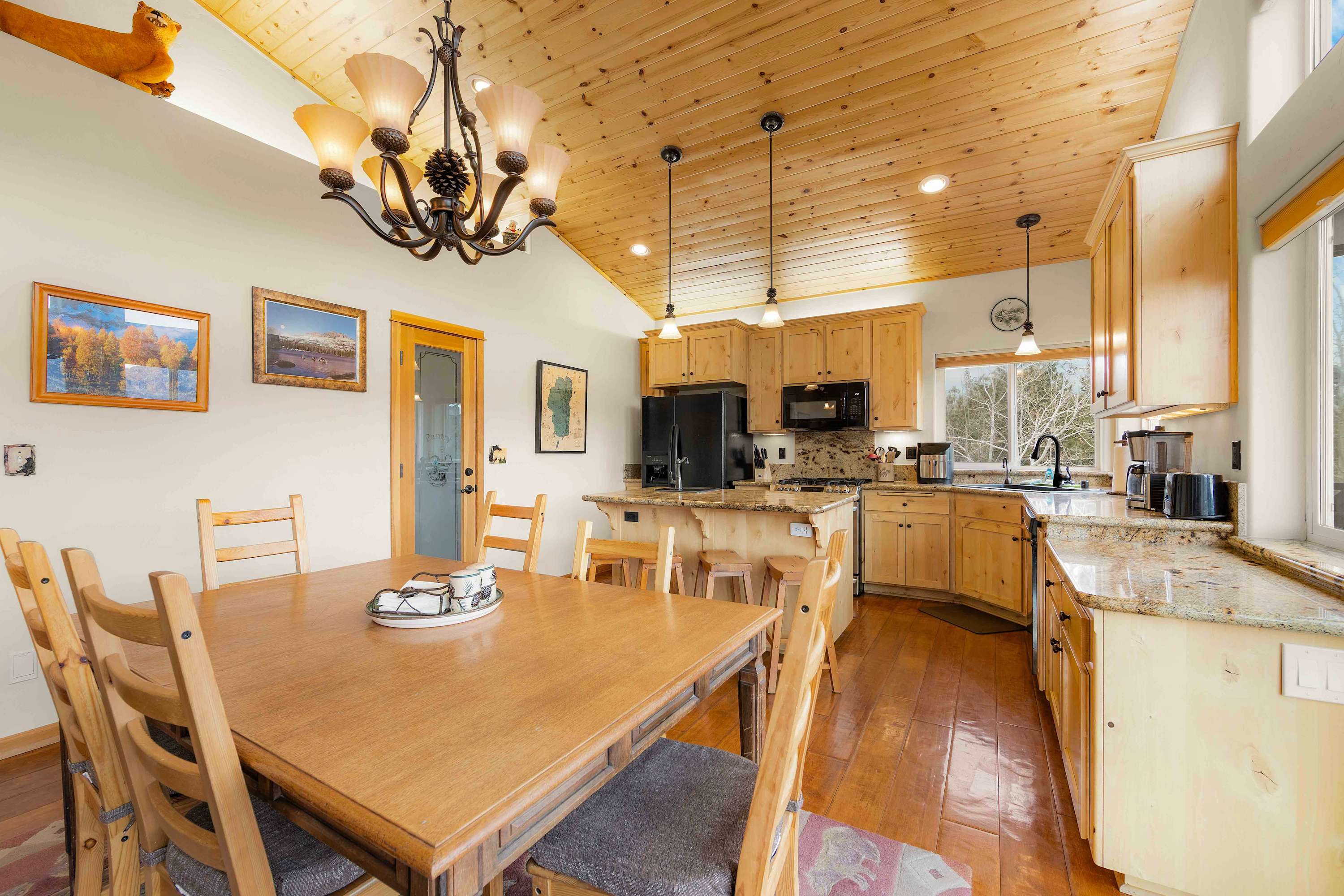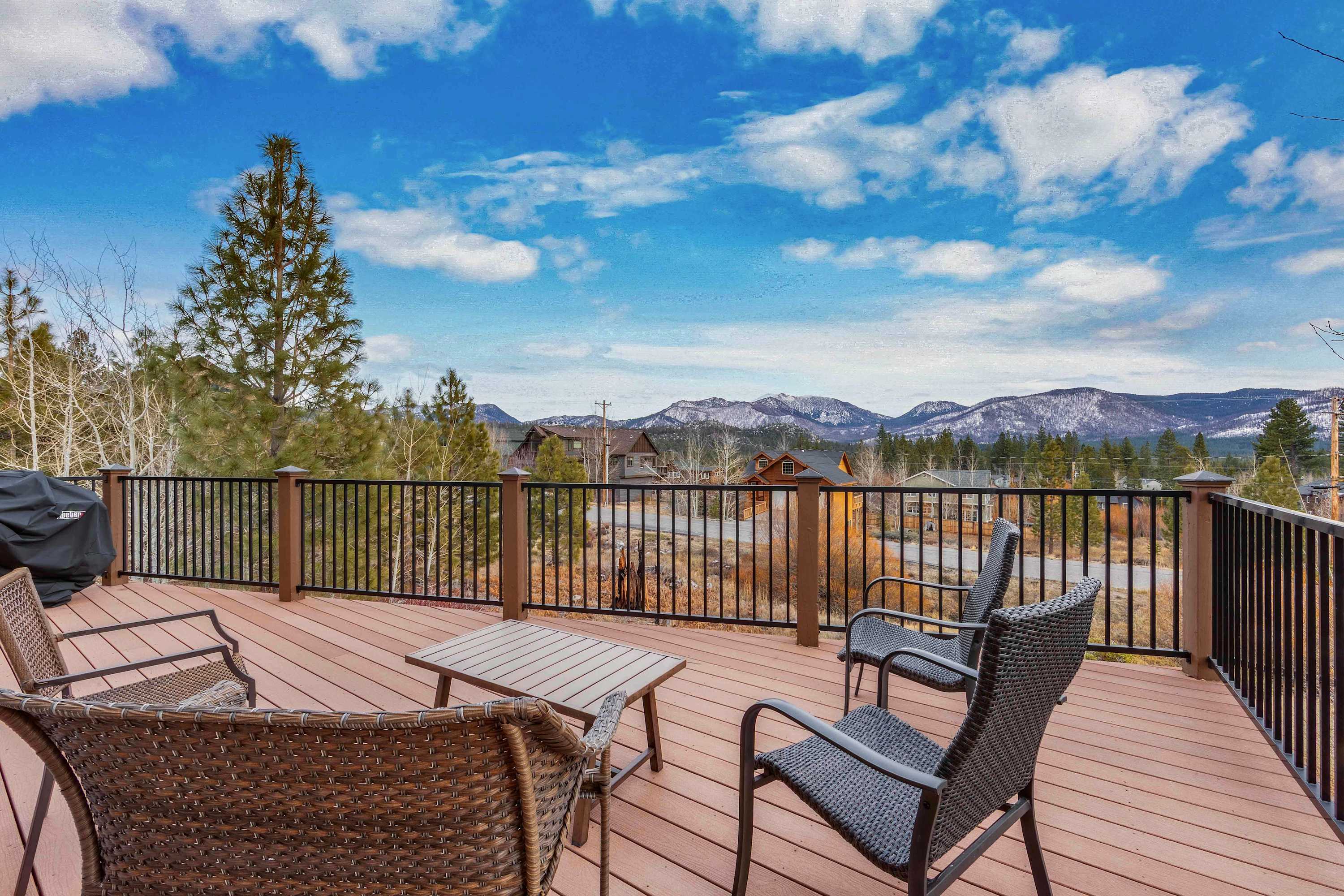 Step inside to a bright, open floor plan where the living, dining, and kitchen areas flow together beneath high peaked ceilings and walls of windows that flood the space with natural light. The living room feels both spacious and cozy, featuring a gas stove fireplace, two love seats, a full couch, and a smart TV—ideal for relaxing after a day outdoors. Gather around the dining table for six for shared meals, or pull up a stool at the kitchen island, which offers bar seating for four and opens seamlessly to the heart of the home. Step out onto the balcony, where comfortable seating, a grill, and beautiful mountain views create an inviting space for morning coffee or sunset dinners. When it’s time to rest, the bedrooms are designed for comfort with room-darkening shades, ensuring a peaceful night’s sleep so you can wake refreshed and ready to enjoy another unforgettable day in Tahoe.