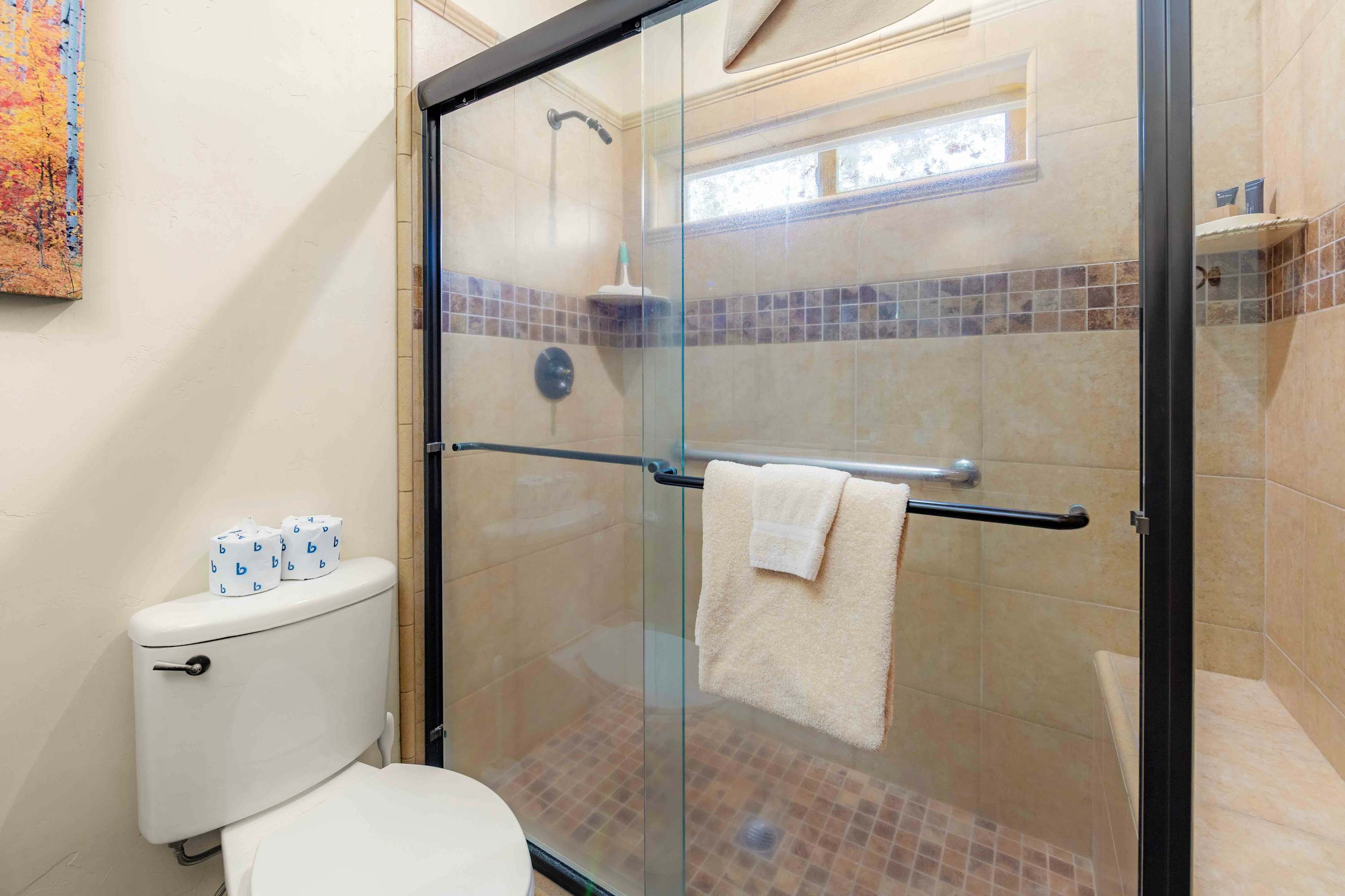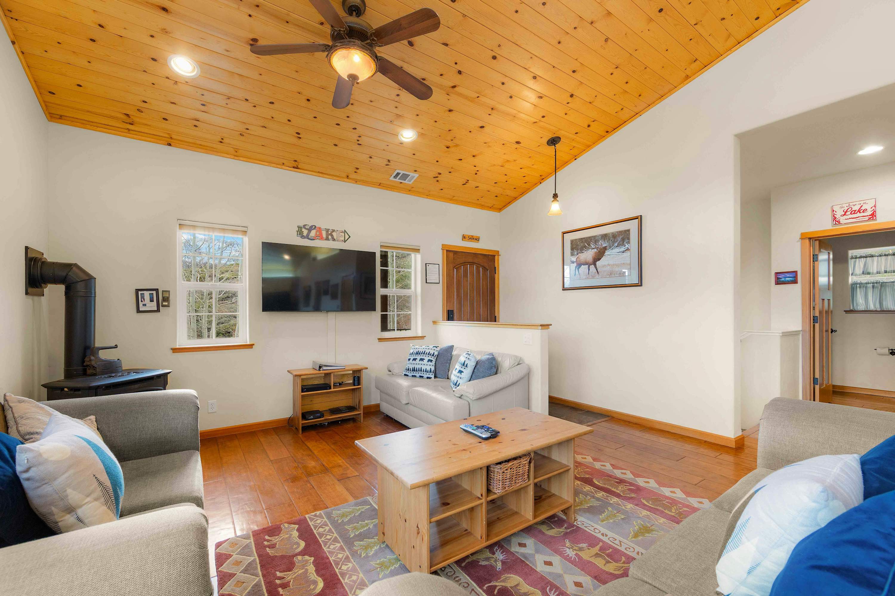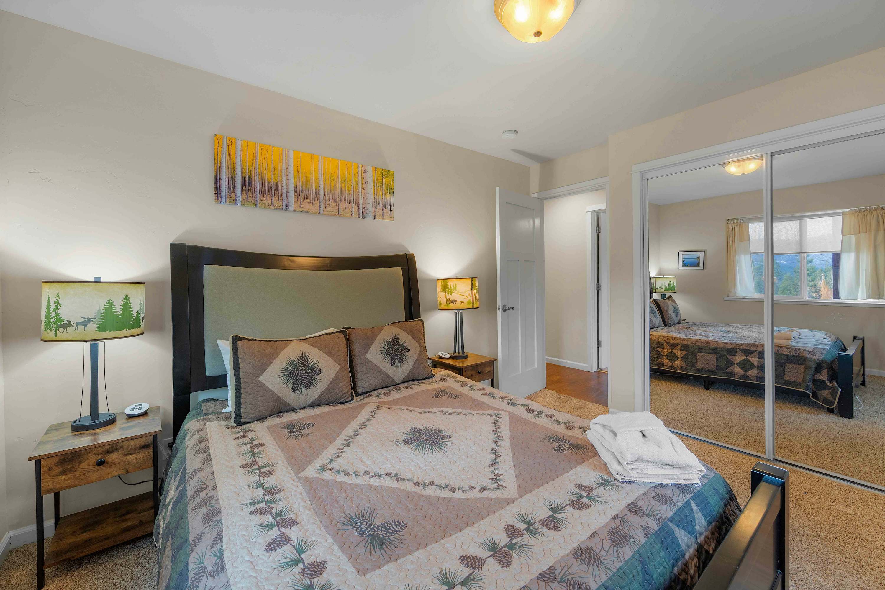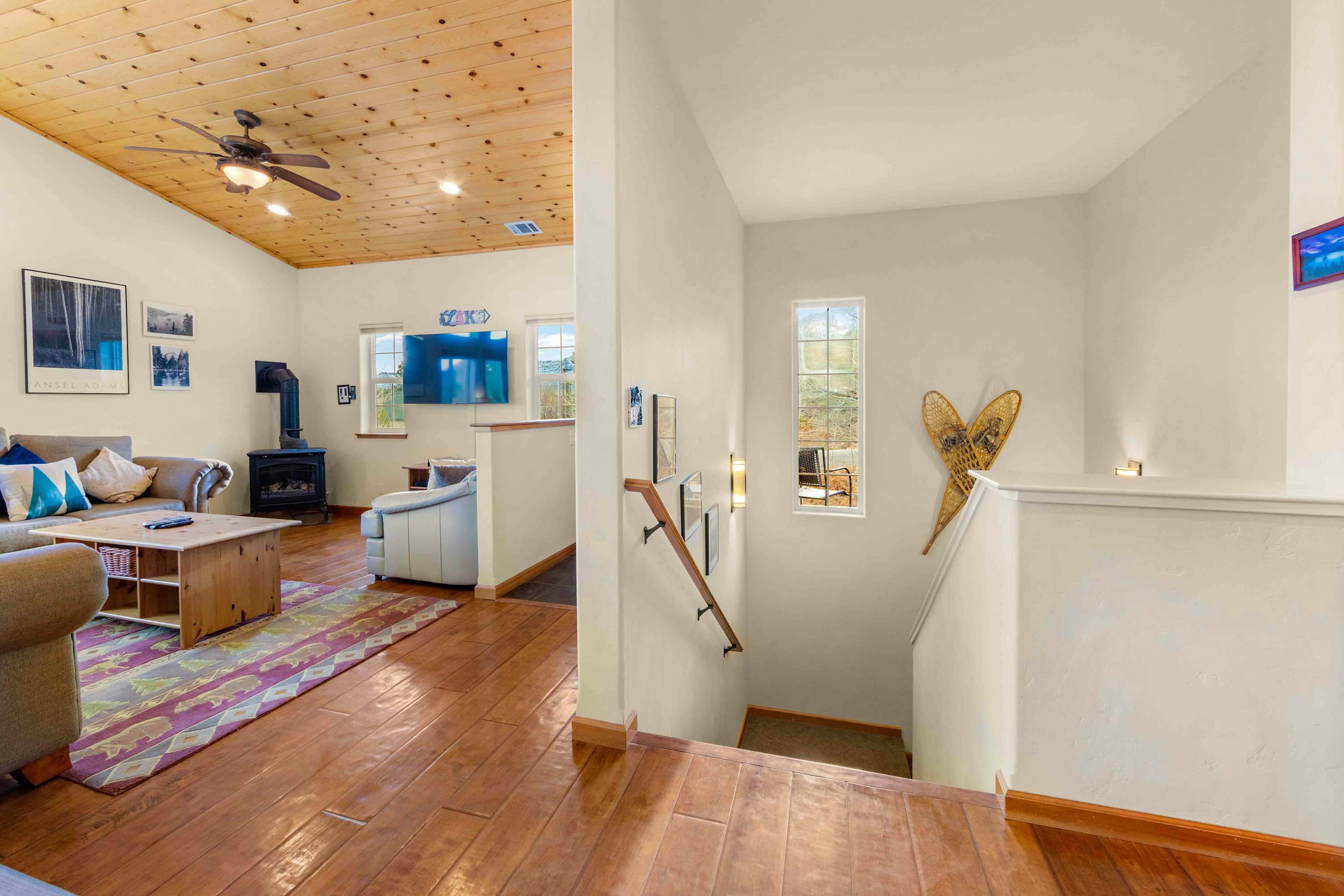 Step inside to a bright, open floor plan where the living, dining, and kitchen areas flow together beneath high peaked ceilings and walls of windows that flood the space with natural light. The living room feels both spacious and cozy, featuring a gas stove fireplace, two love seats, a full couch, and a smart TV—ideal for relaxing after a day outdoors. Gather around the dining table for six for shared meals, or pull up a stool at the kitchen island, which offers bar seating for four and opens seamlessly to the heart of the home. Step out onto the balcony, where comfortable seating, a grill, and beautiful mountain views create an inviting space for morning coffee or sunset dinners. When it’s time to rest, the bedrooms are designed for comfort with room-darkening shades, ensuring a peaceful night’s sleep so you can wake refreshed and ready to enjoy another unforgettable day in Tahoe.