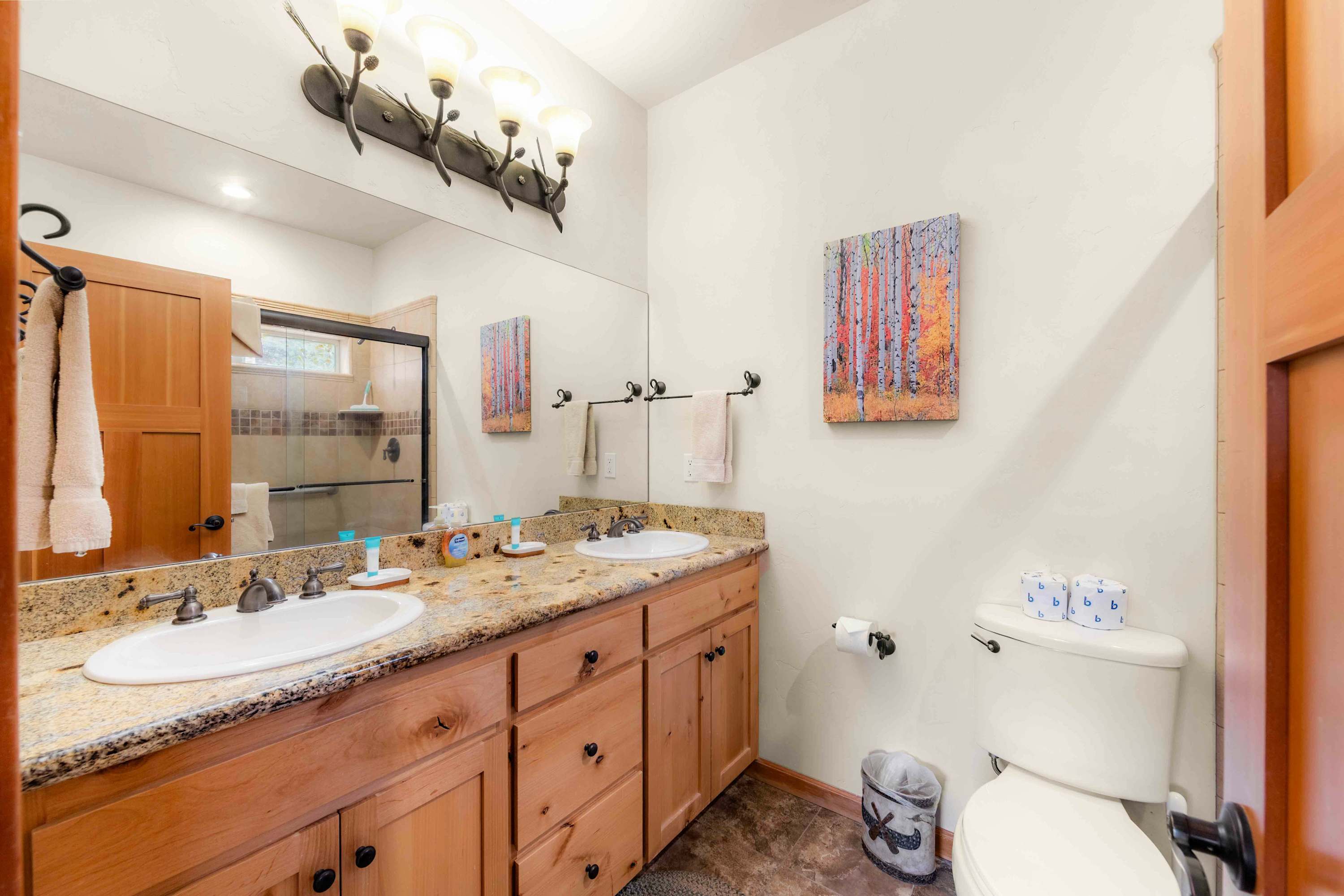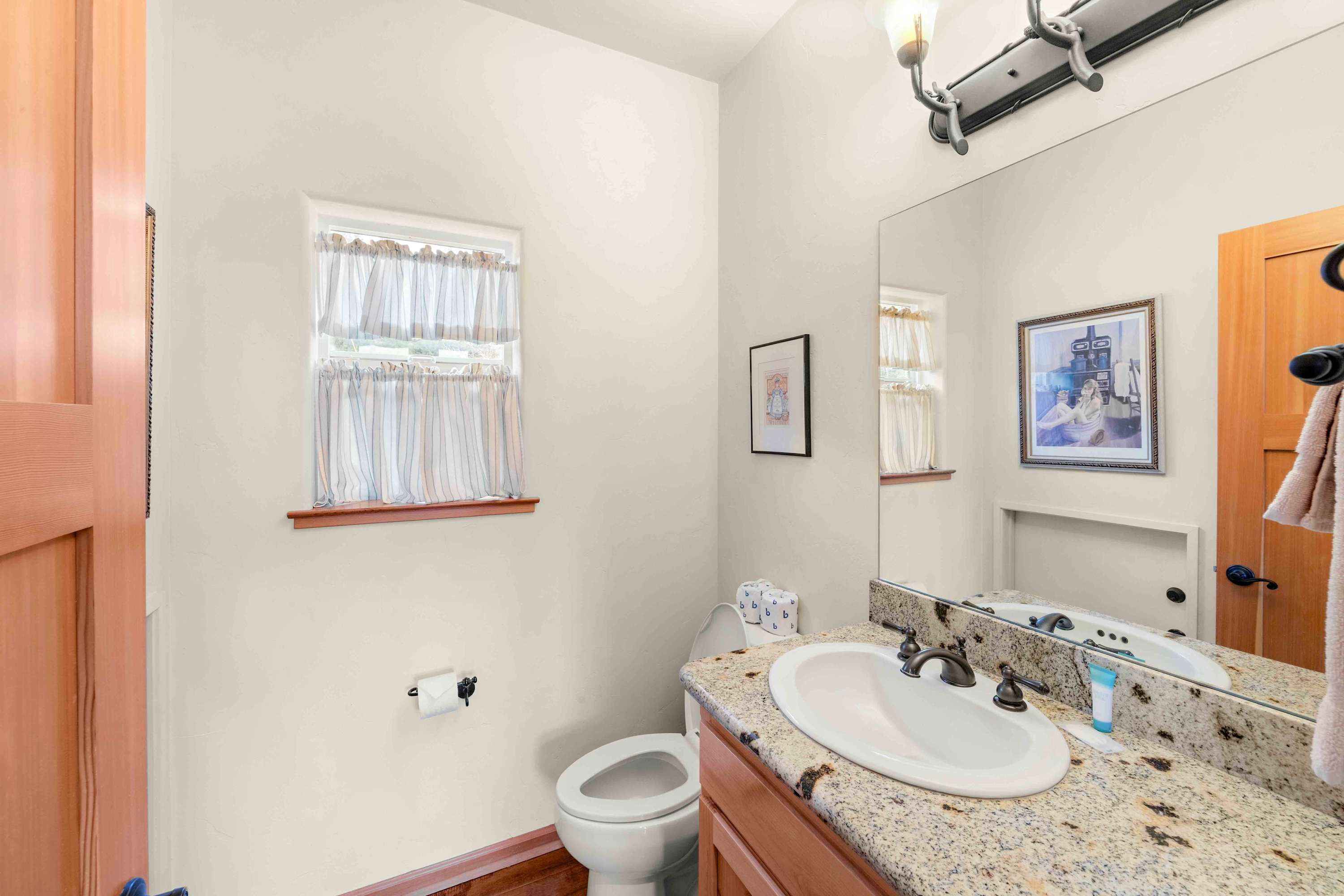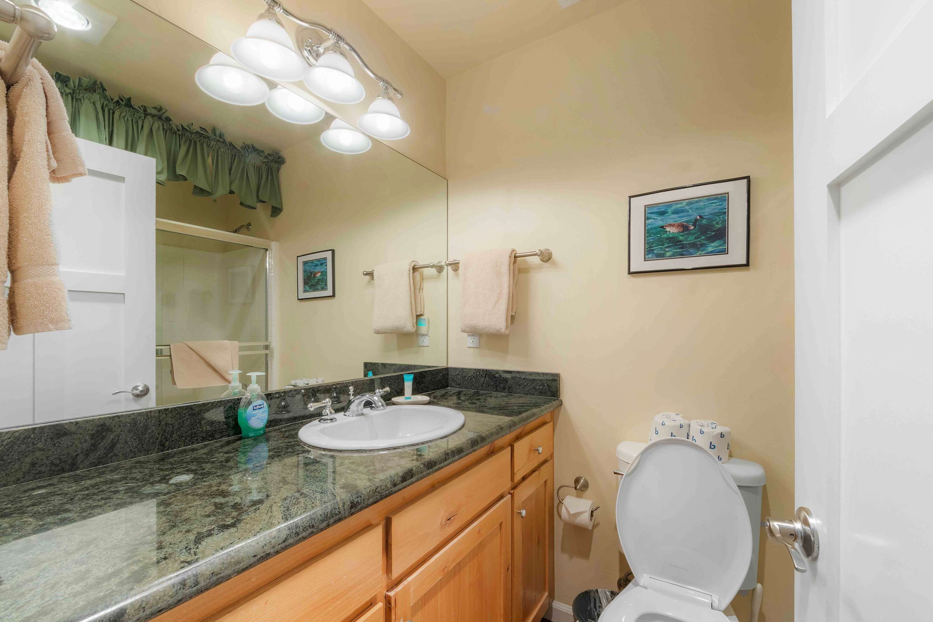 This home includes a half bathroom and a full guest bathroom with a single vanity and a shower/tub combo.