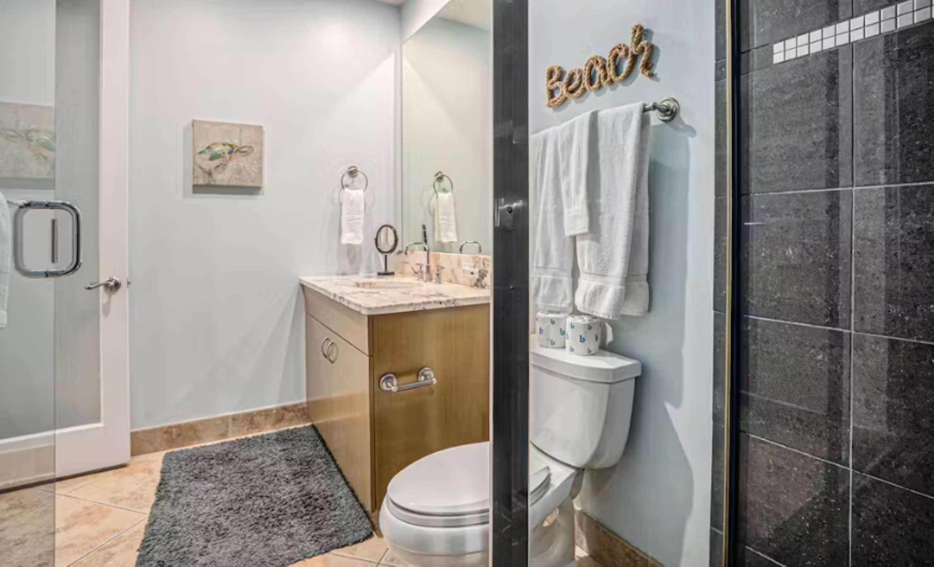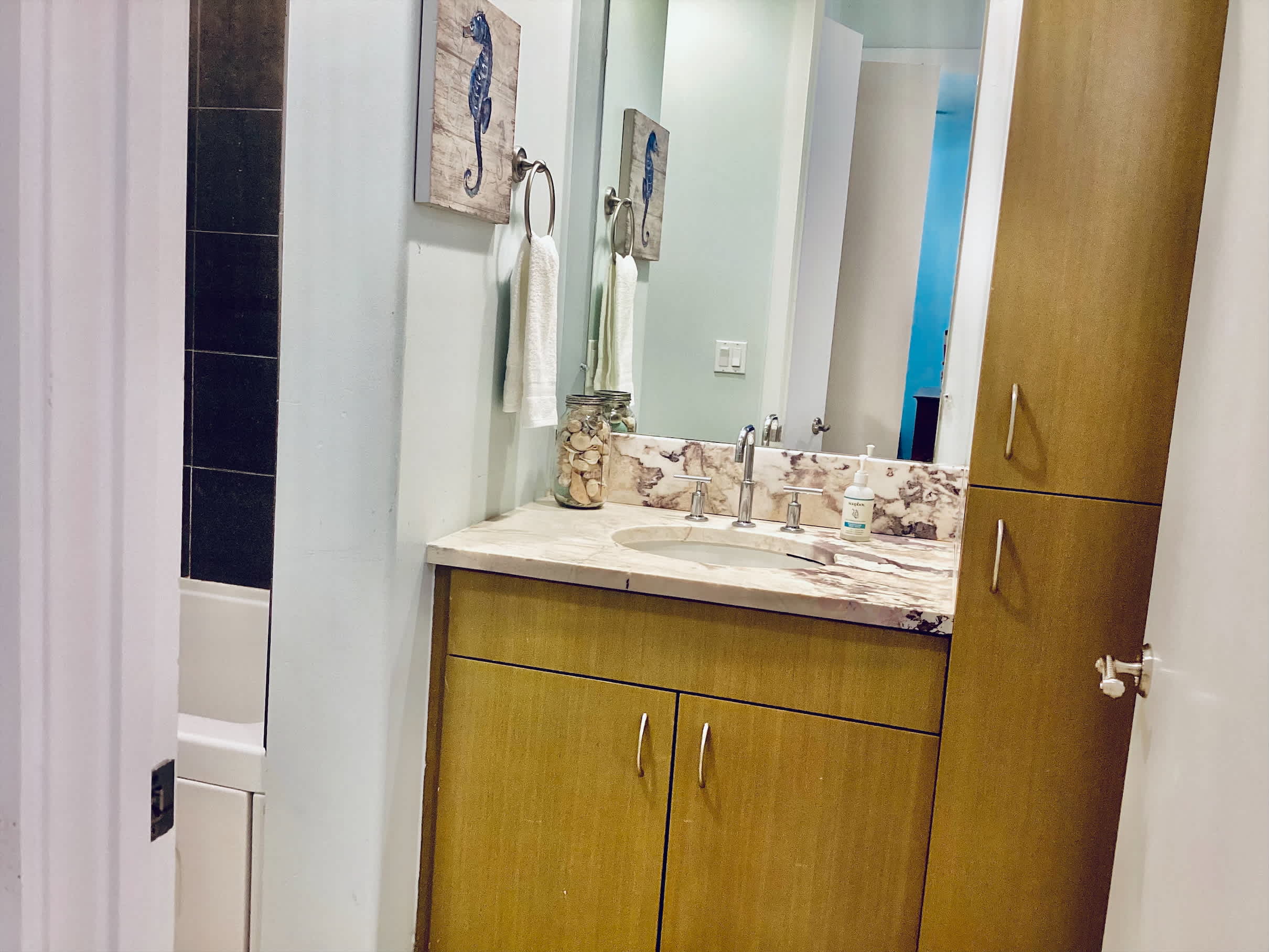 This home also includes a full guest bathroom with a single vanity and a shower/tub combo.