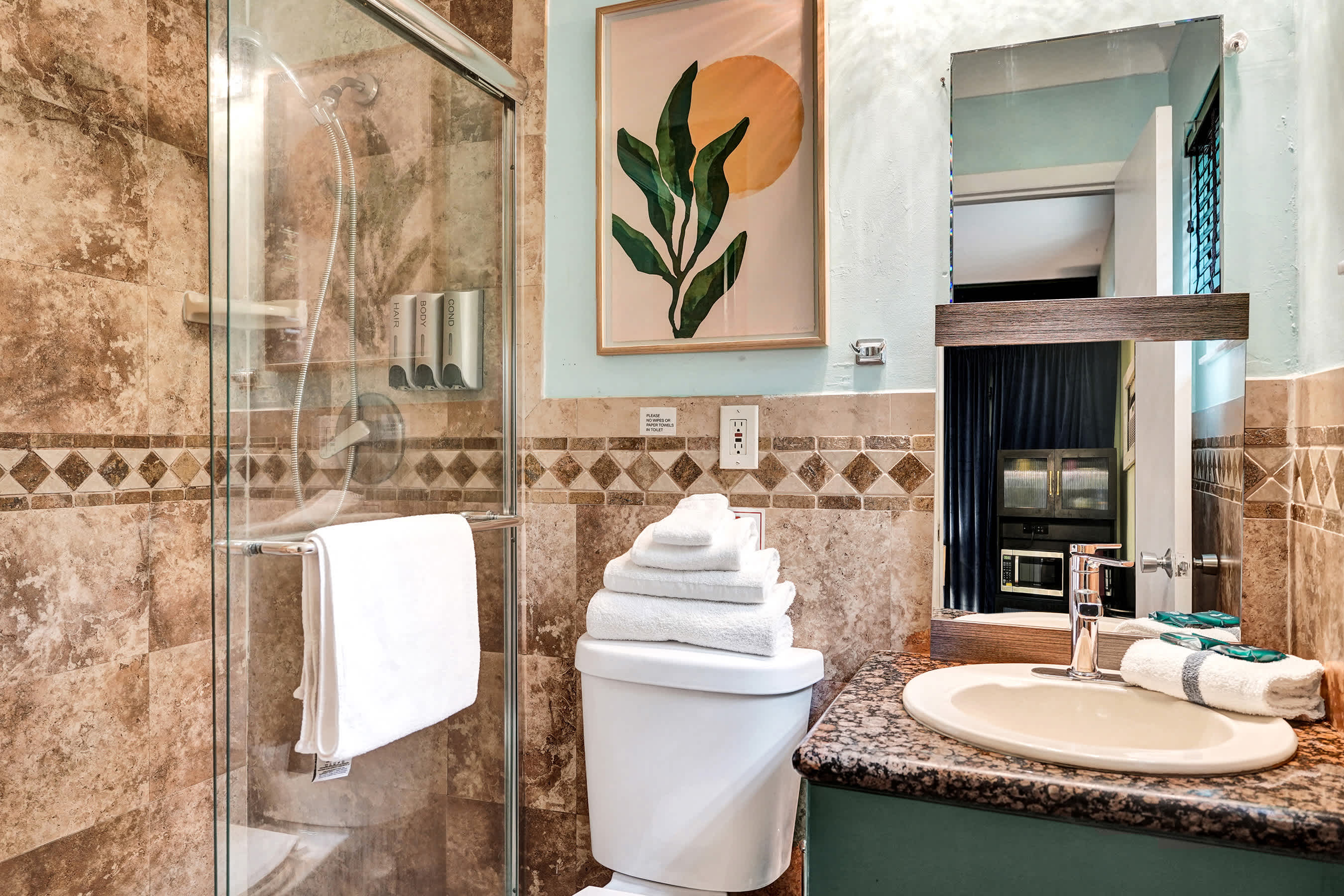 The second unit is a cozy studio designed for simplicity and comfort, making it perfect for couples or guests who appreciate their own private retreat. It features a smart TV for quiet evenings, along with a convenient kitchenette equipped with a mini fridge and Keurig—ideal for easy mornings and light snacks. The third unit offers another welcoming living space with a comfortable couch and smart TV, plus a kitchenette set up for simple meals and coffee, complete with a Keurig and dining table for two. Bedrooms with room-darkening shades ensure everyone enjoys a restful night’s sleep after full days of fun.
