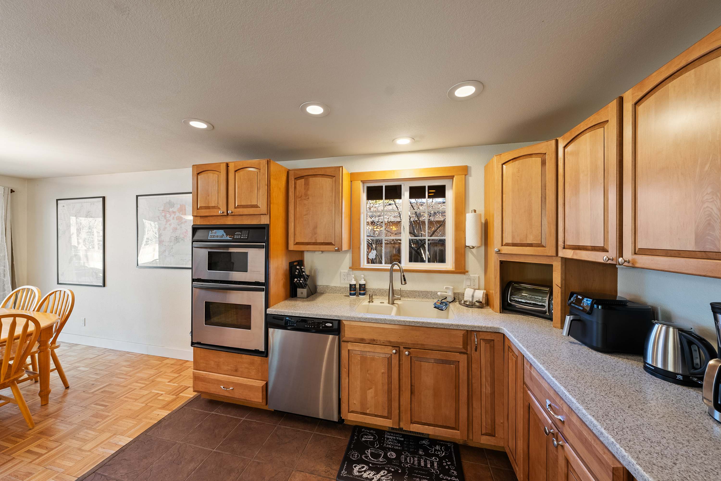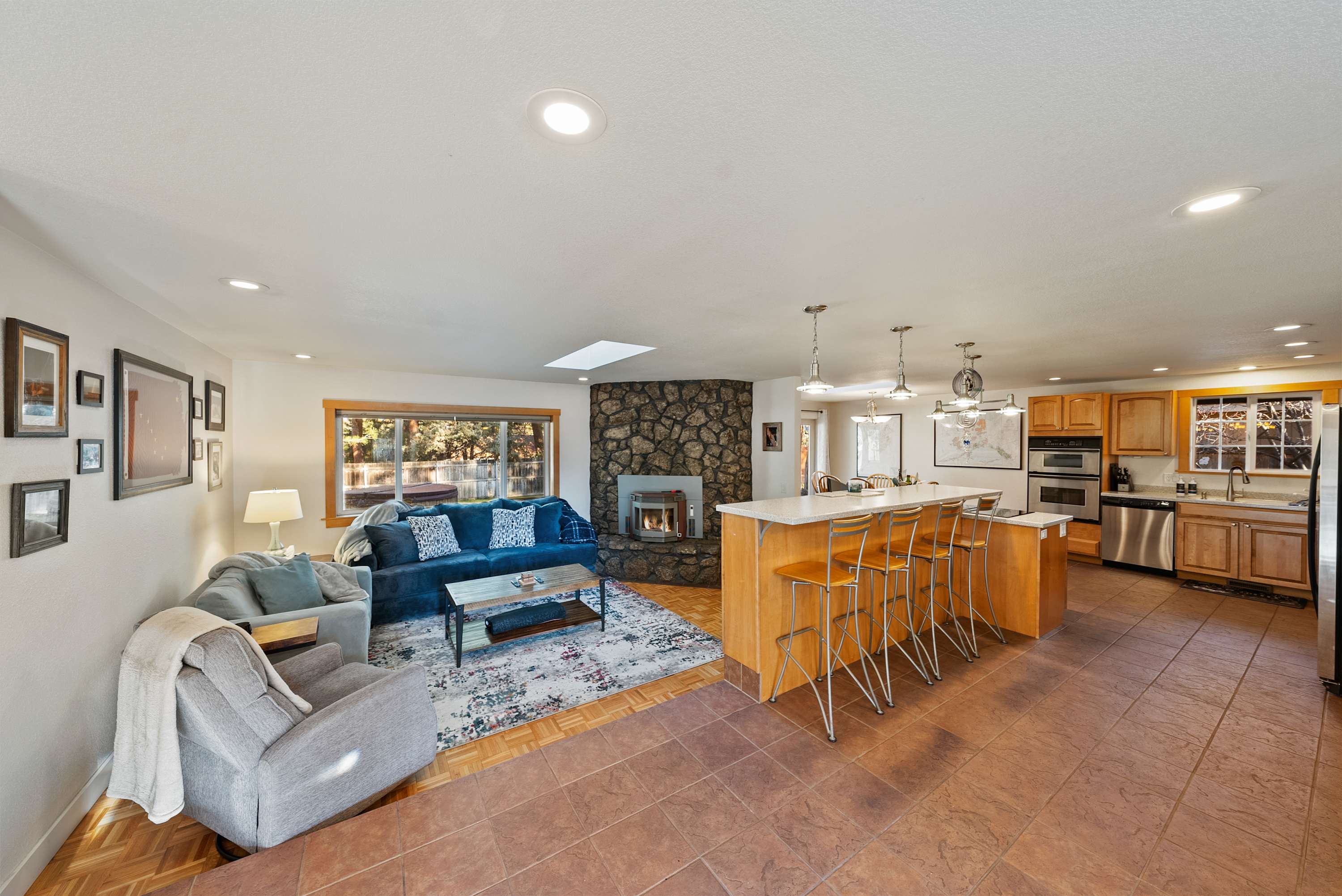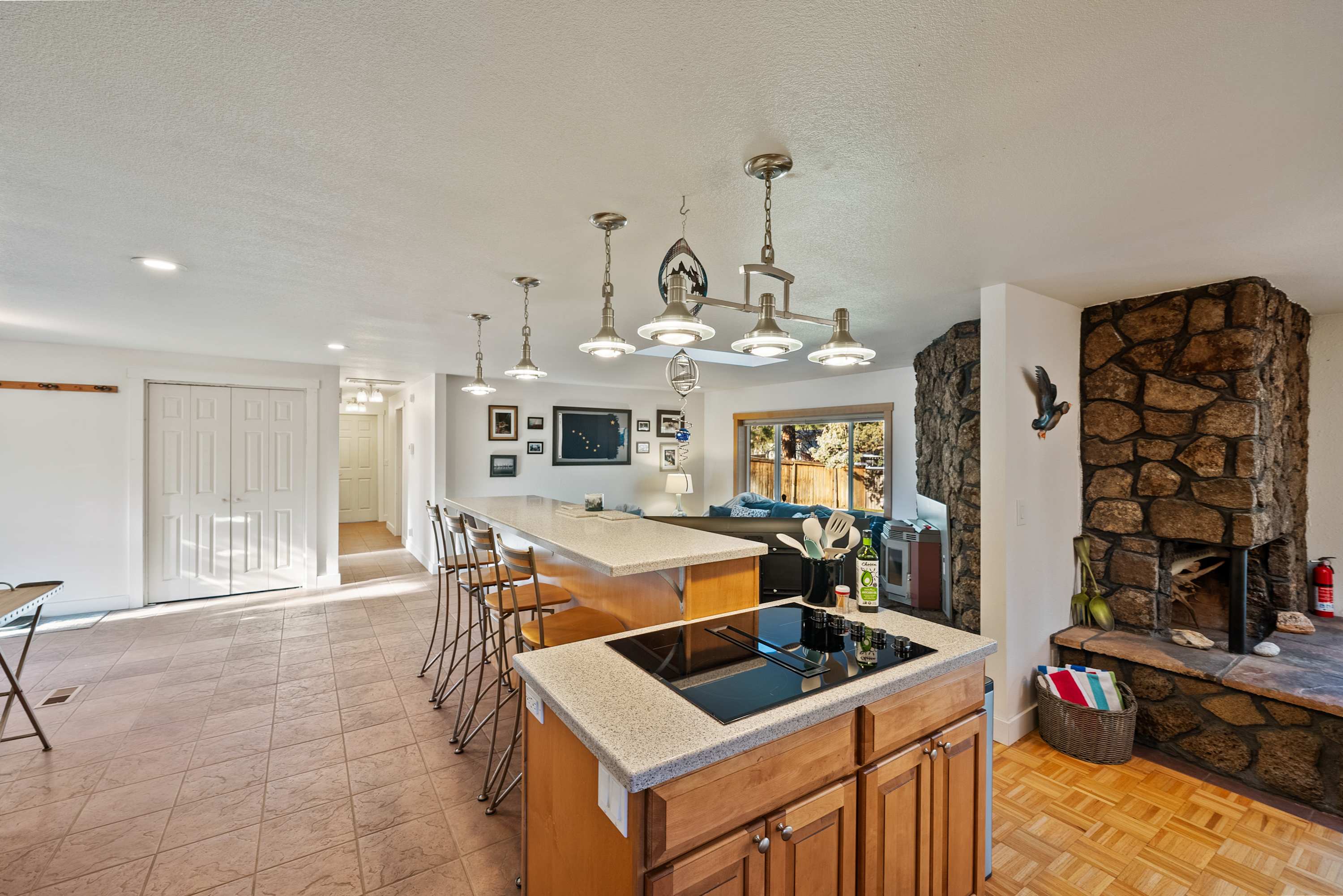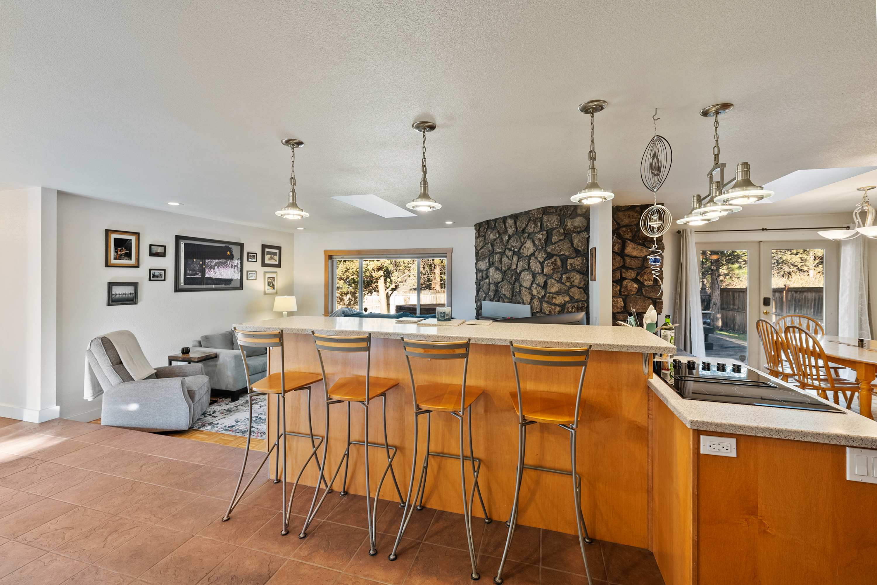 Inside, the home welcomes you with warmth and comfort designed for everyday living. The living room is the heart of the space, featuring plenty of comfortable seating, a smart TV, and an indoor fireplace that’s perfect for cool evenings or relaxed nights in. The kitchen flows seamlessly into the living area, making it easy to cook, entertain, or simply enjoy your daily routine, with warm cabinetry, stainless steel appliances, and counter seating for four. A dining table for six provides plenty of space for shared meals, work-from-home flexibility, or hosting friends. Step outside onto the deck to enjoy your morning coffee or unwind after the day with the grill and firepit surrounded by bench seating—an inviting outdoor extension of the home. Comfortable, well-equipped, and thoughtfully laid out, Kodiak Clubhouse offers everything you need to truly settle in and enjoy Bend for the long haul.