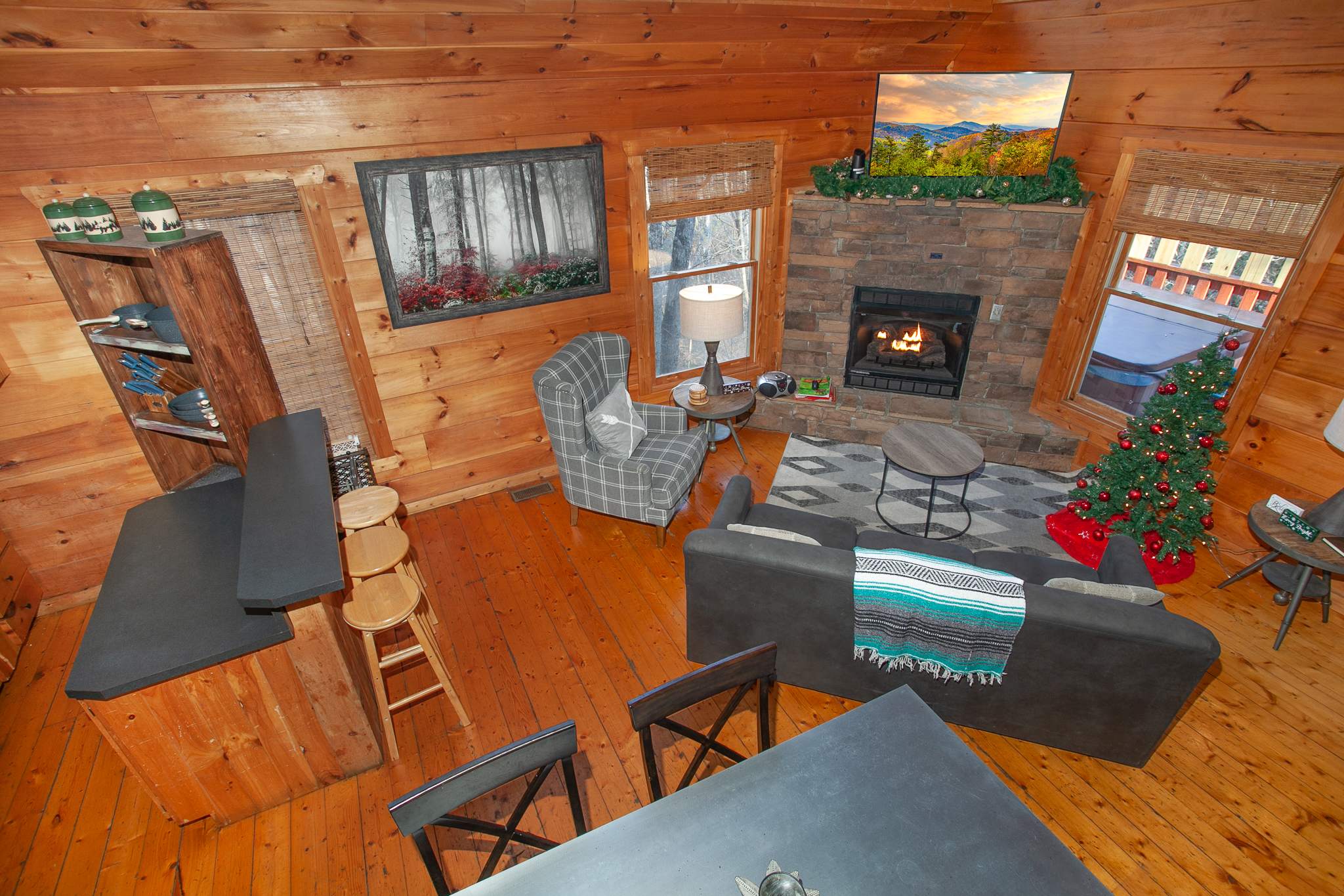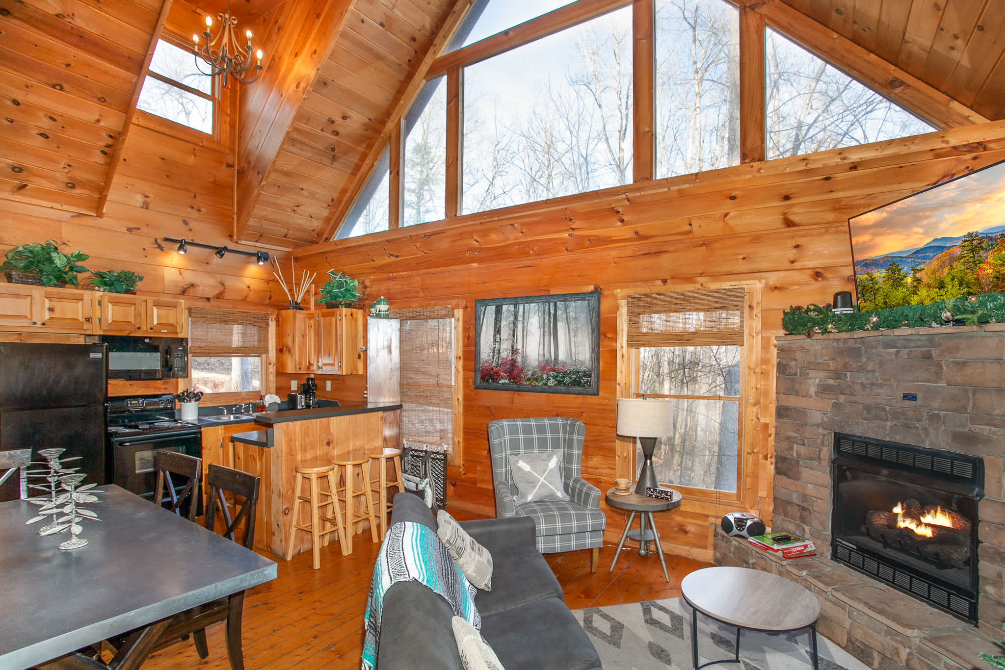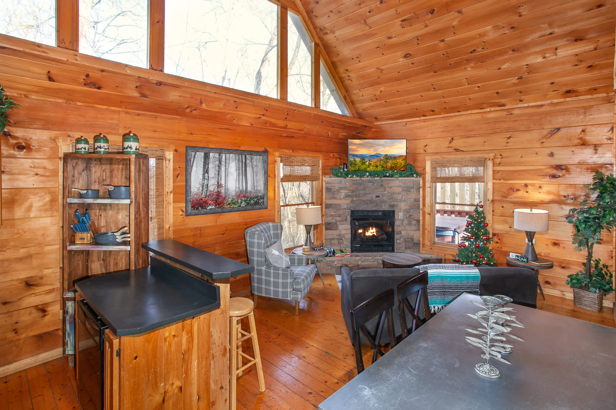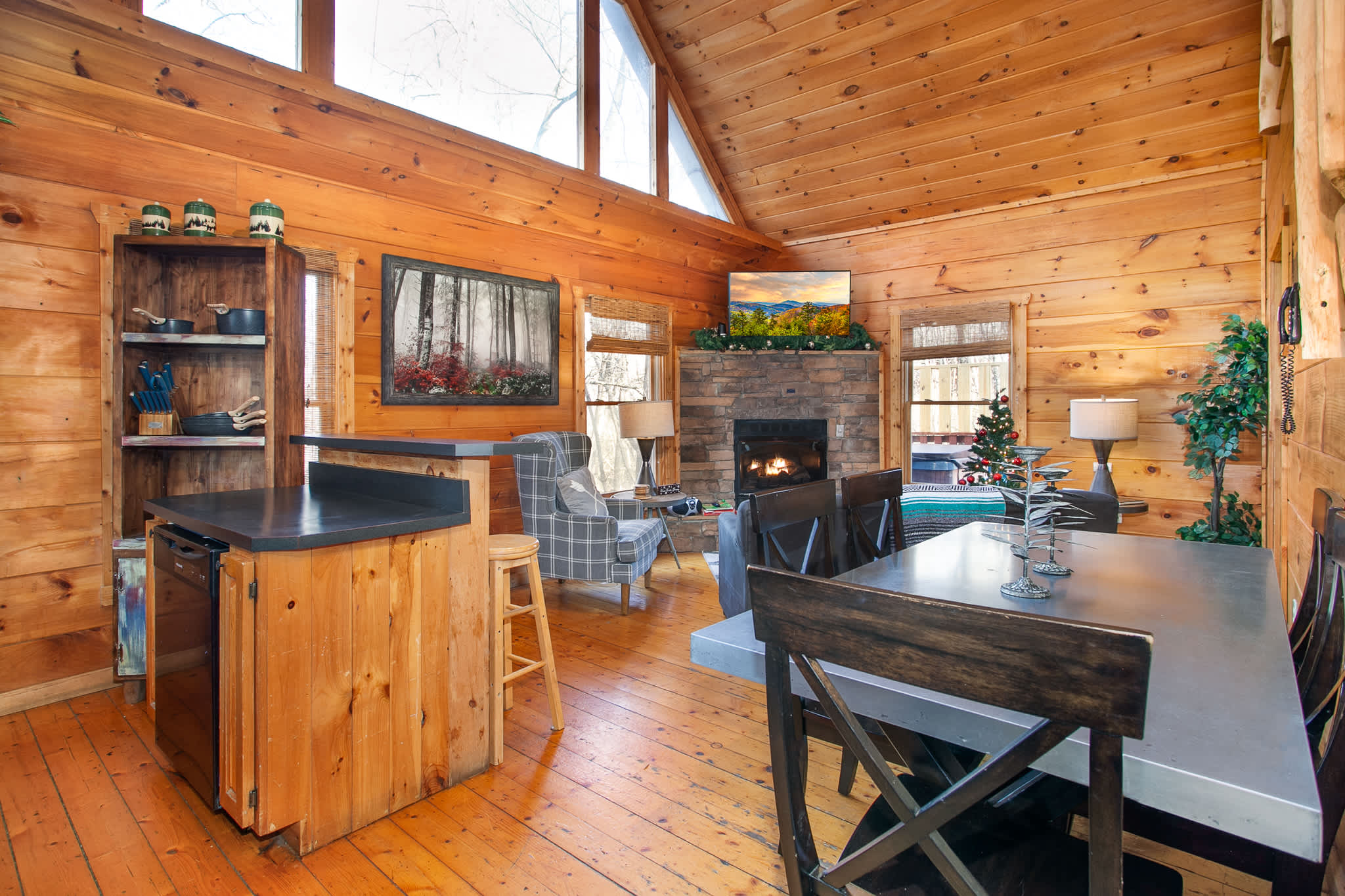The fully equipped kitchen has black appliances, a breakfast bar for 3, and a dining table for 5—great for casual meals or game night. Step outside to the upper deck to soak in the hot tub, take in the mountain scenery, and gather around the picnic table.