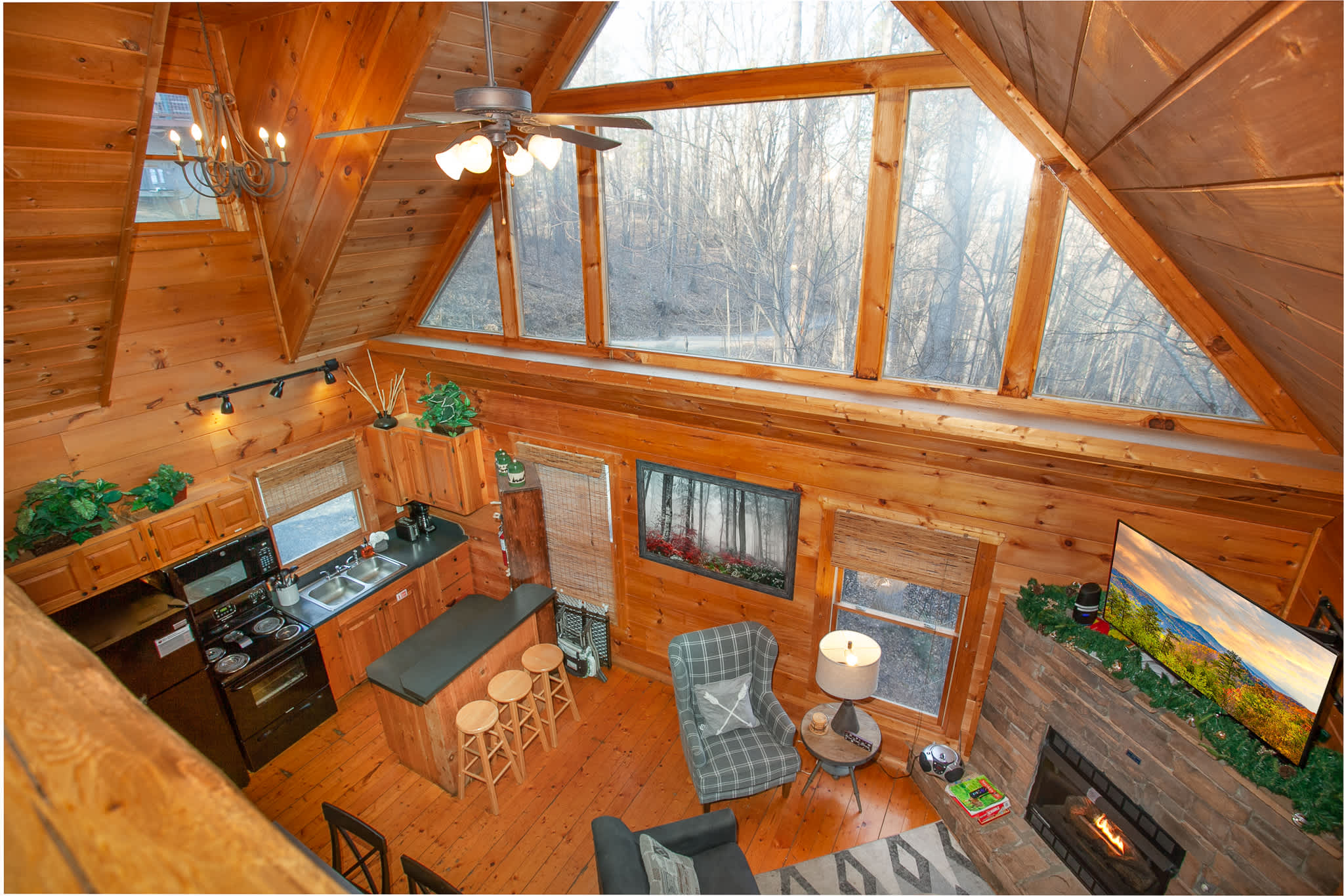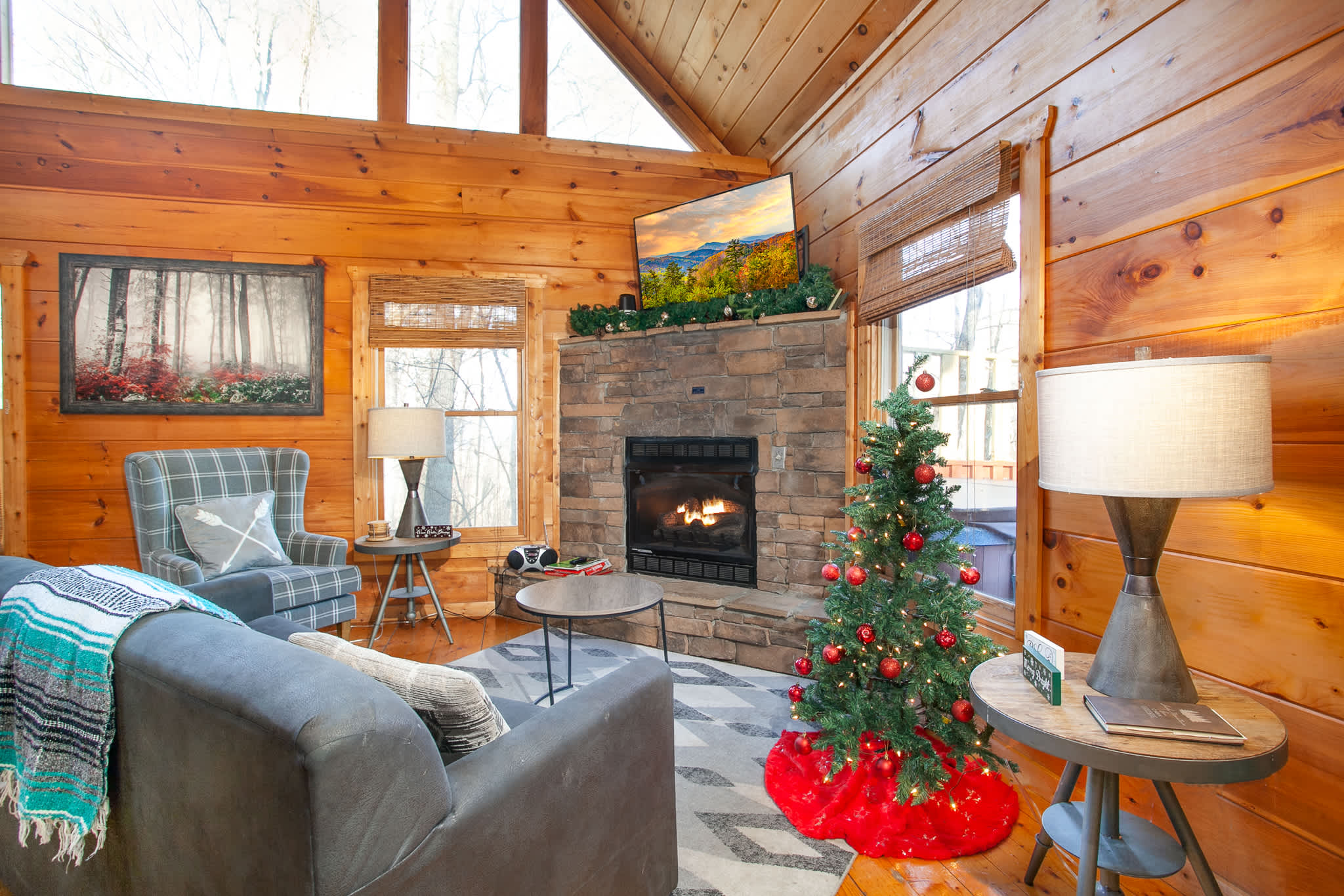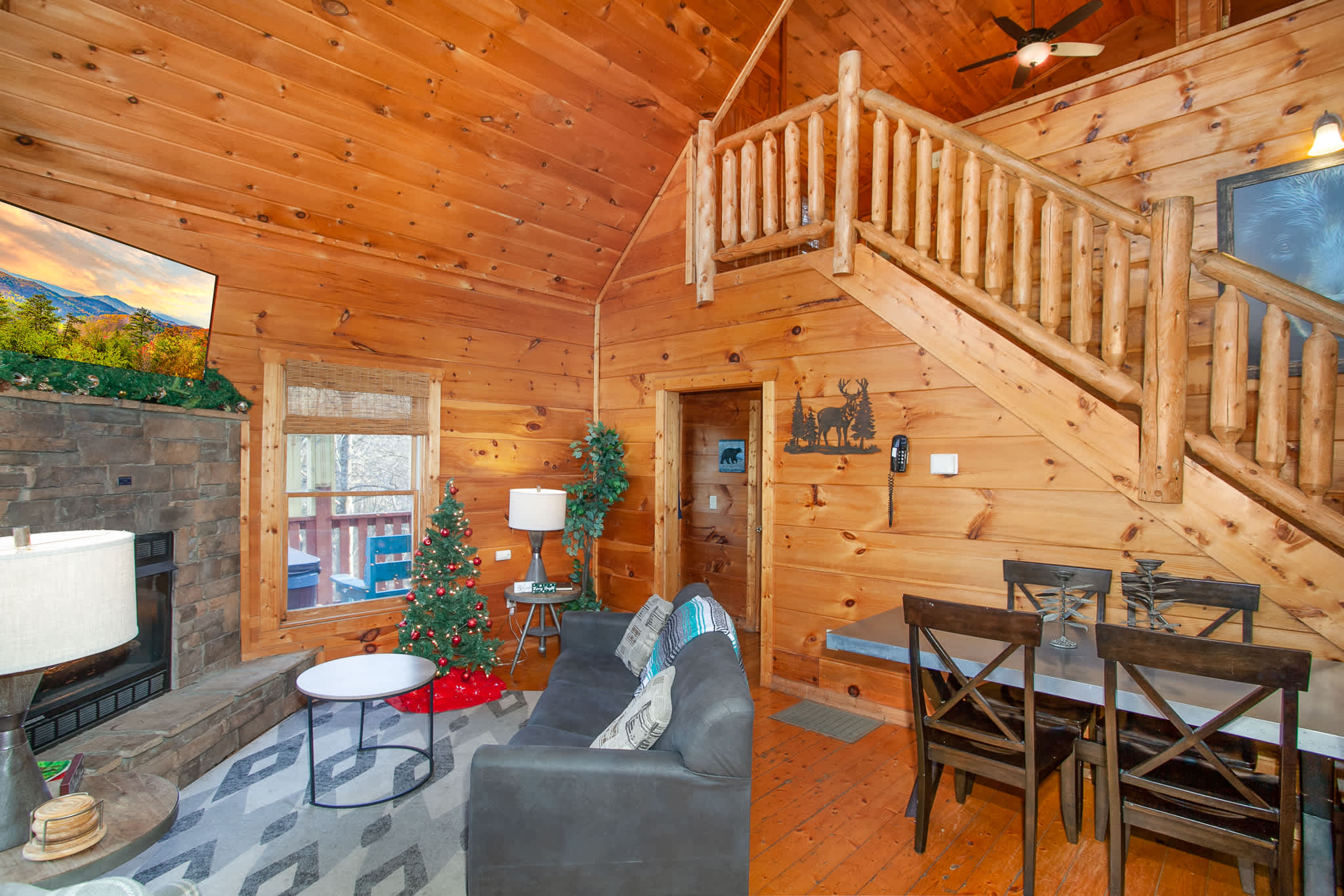This comfortable, family-friendly cabin offers room for up to 12 guests across multiple levels with 2 bathrooms and flexible sleeping options. The open-concept main level features a living room with a smart TV and an electric fireplace, plus a queen sleeper sofa for extra space.