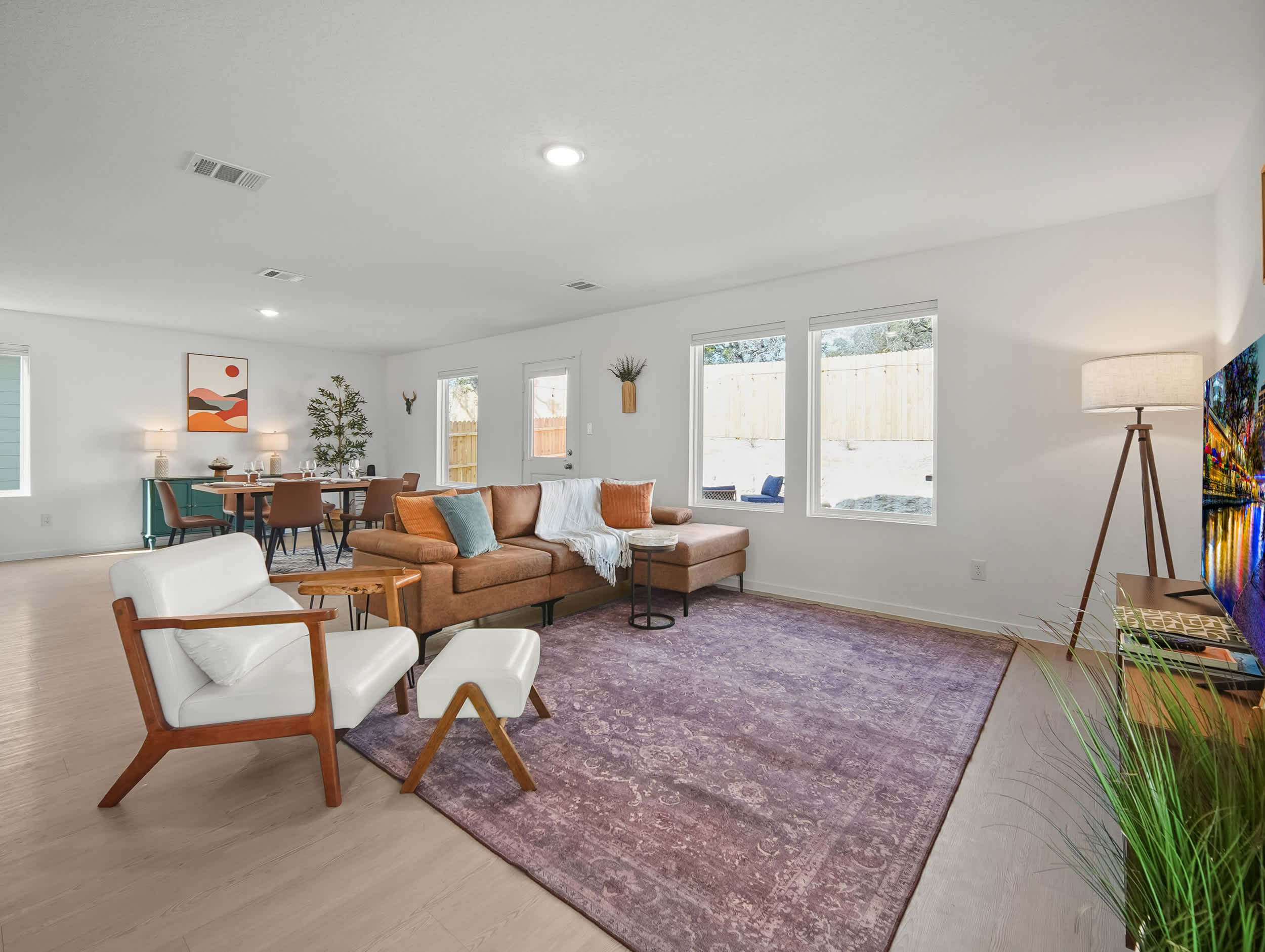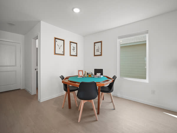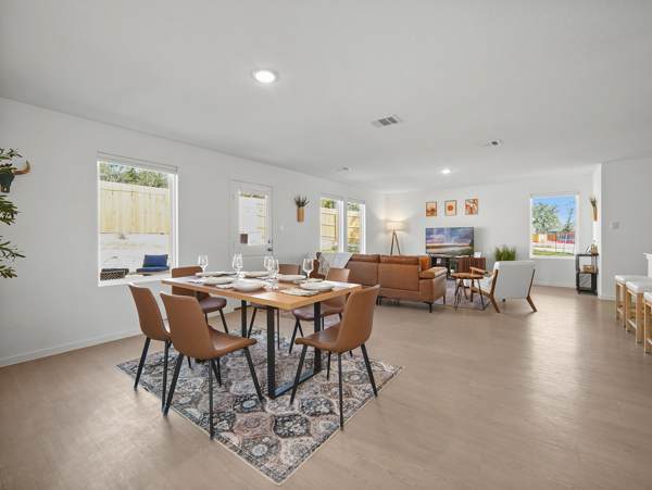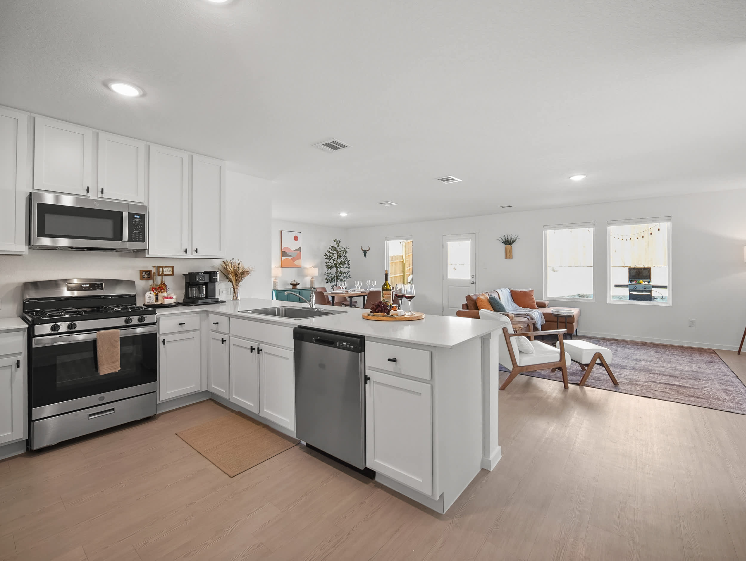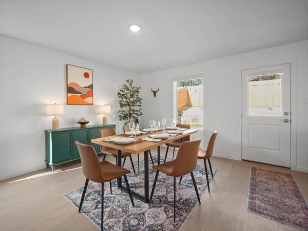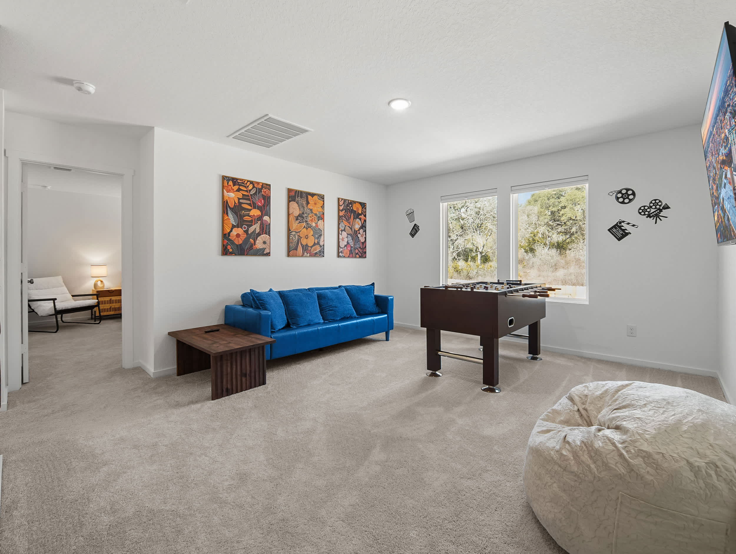 Step inside and feel instantly at home in the bright living and dining combo, thoughtfully laid out with space to gather, unwind, or enjoy a friendly card game at the corner table. The living room invites you to relax with a smart TV, a couch with a chaise lounger, and a cozy armchair, while the dining table for six makes shared meals easy. The kitchen is clean, spacious, and fully stocked with everything you need, featuring stainless steel appliances, all-white cabinetry and counters, a Keurig/drip coffee combo, and counter seating for four. For added fun, the game room is a hit with all ages, offering a smart TV, foosball table, tic-tac-toe wall, sofa, table, and a beanbag seat—perfect for relaxed afternoons or evening entertainment. Outside, the backyard patio becomes your go-to spot to unwind, with comfortable seating and a grill ready for cookouts under the Texas sky. Warm, welcoming, and well-equipped, The Oak Tree House is an ideal choice for memorable San Antonio stays.