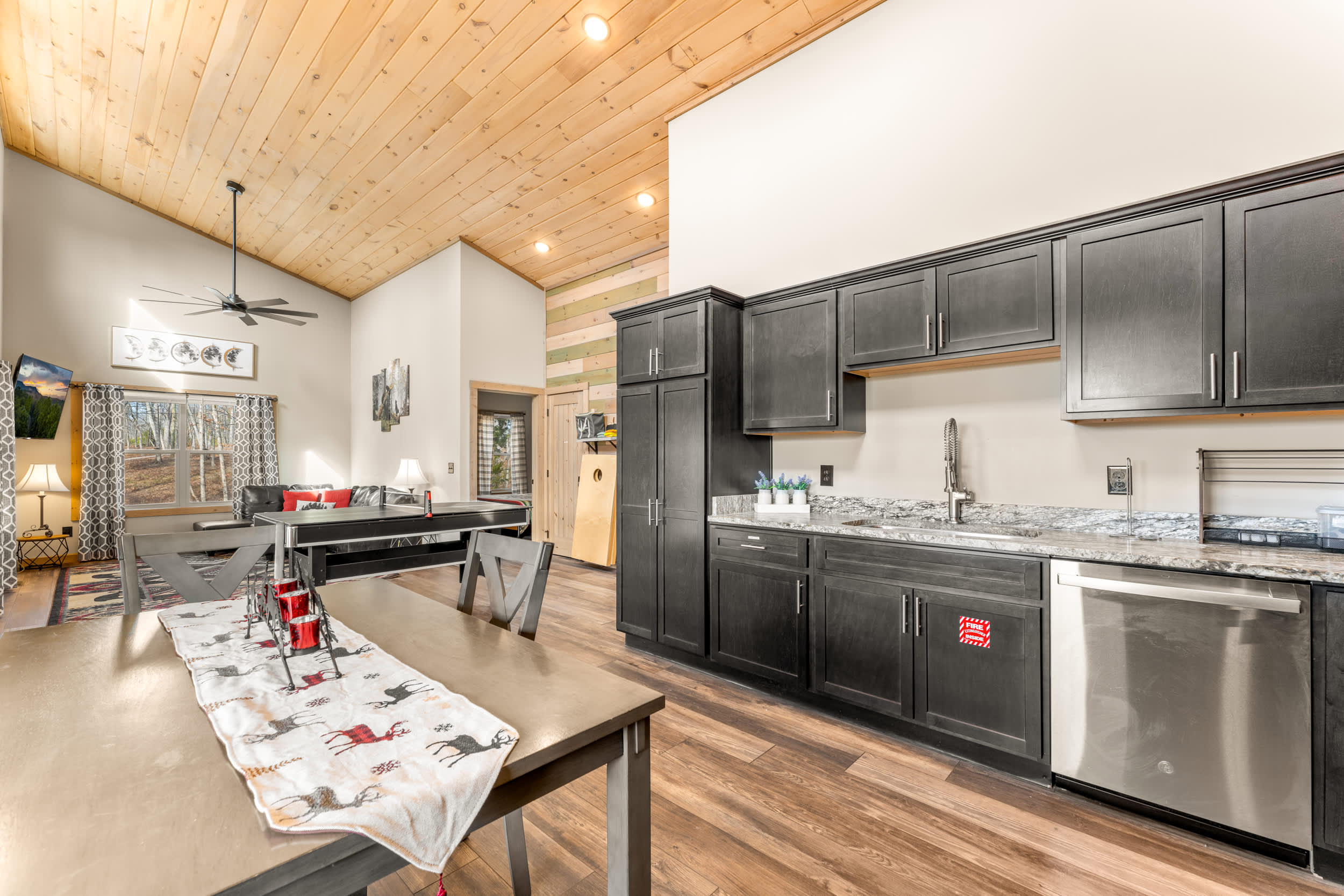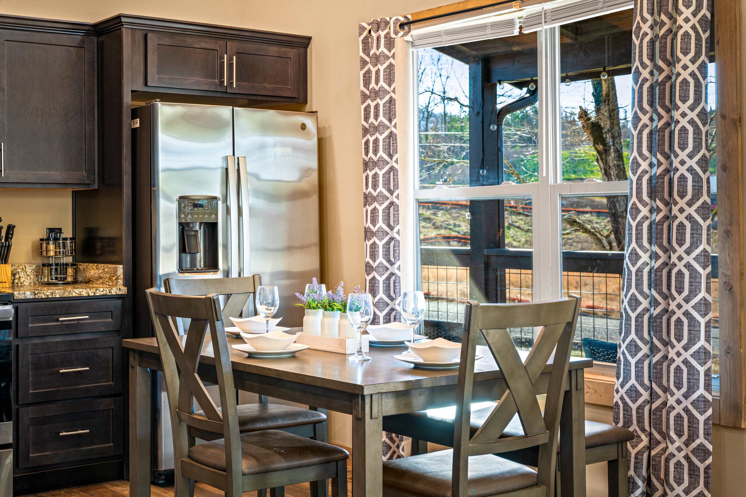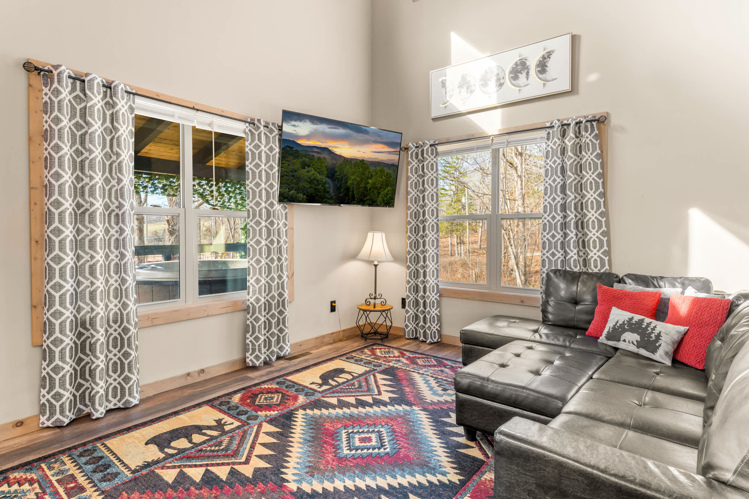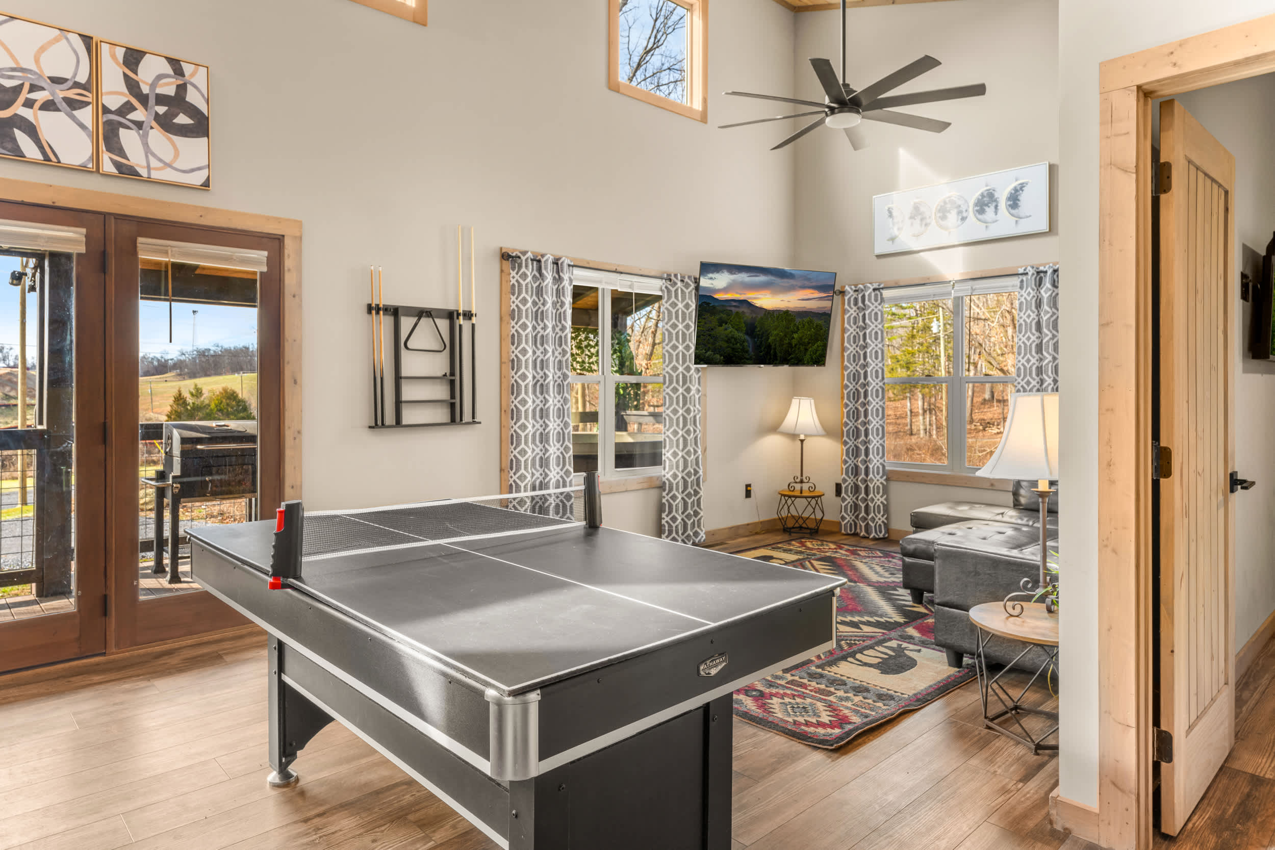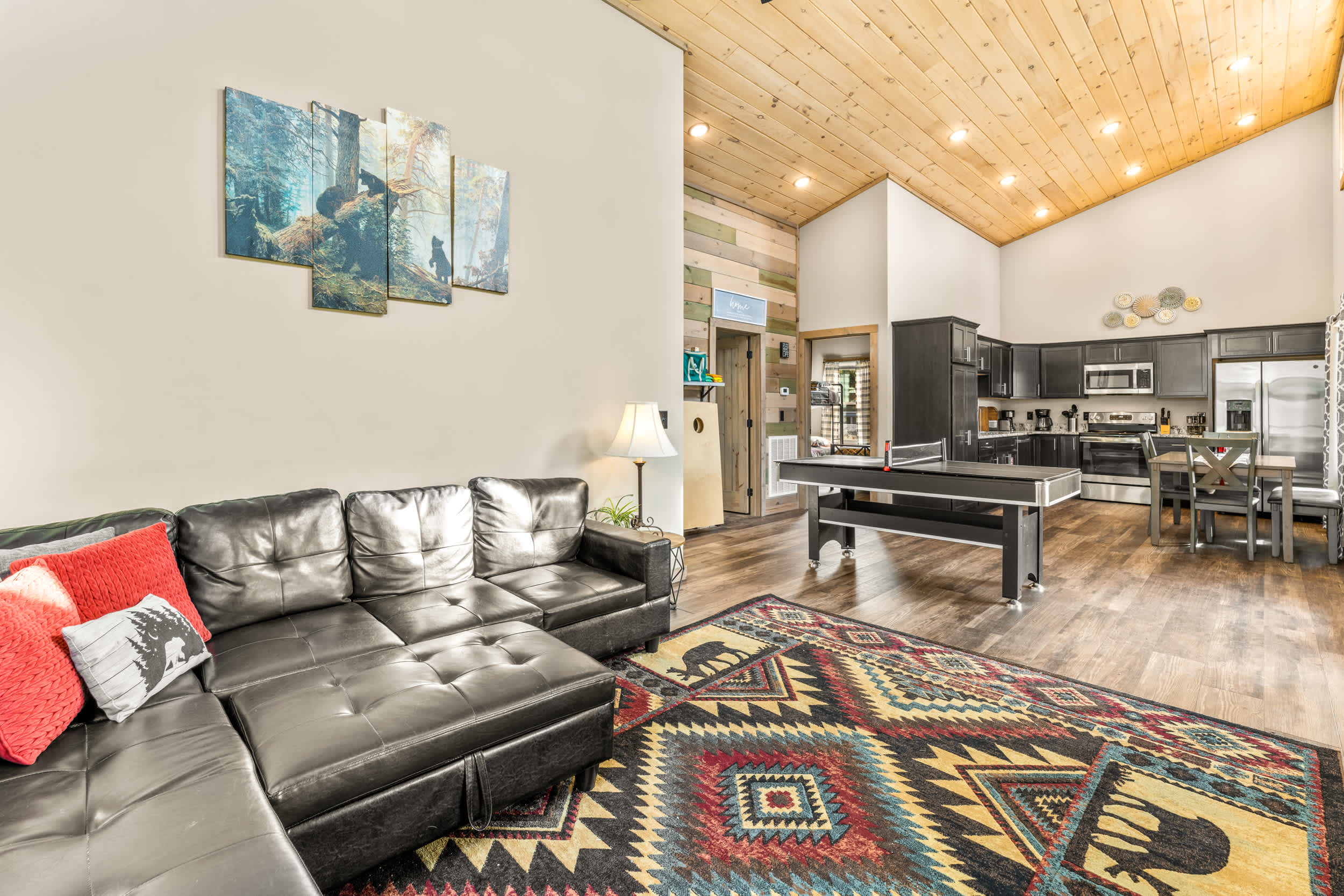 Designed for easygoing getaways, this cozy cabin is designed for easy downtime after days exploring Sevierville, Pigeon Forge, and Gatlinburg and keeps everything on one level for simple flow and comfort. The living room invites you to relax on a chaise sectional for movie night on the smart TV or challenge the crew to friendly matches on the combo ping pong/pool table.