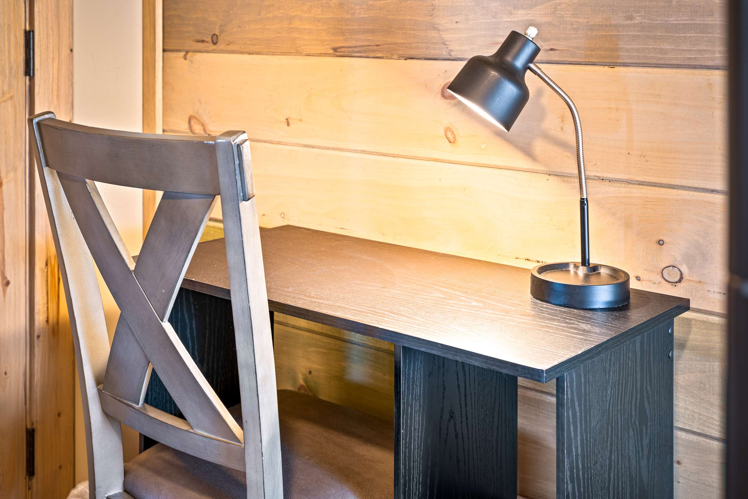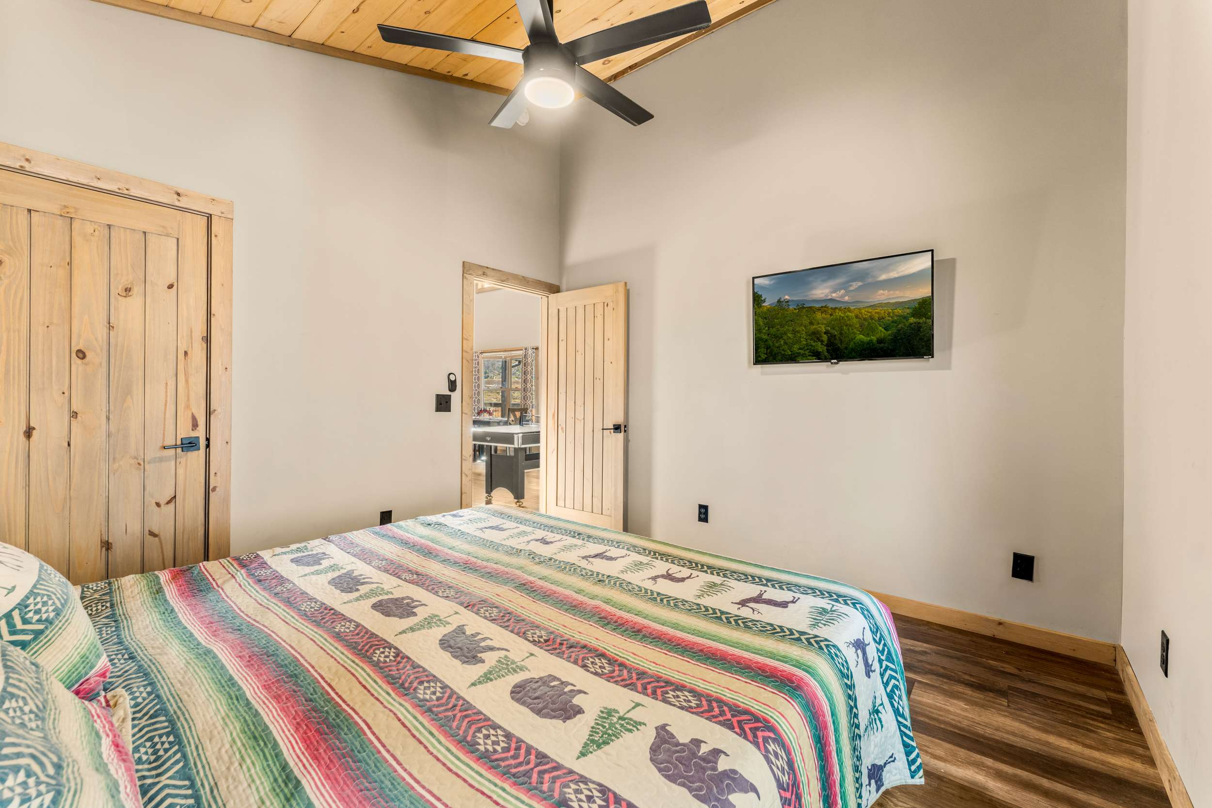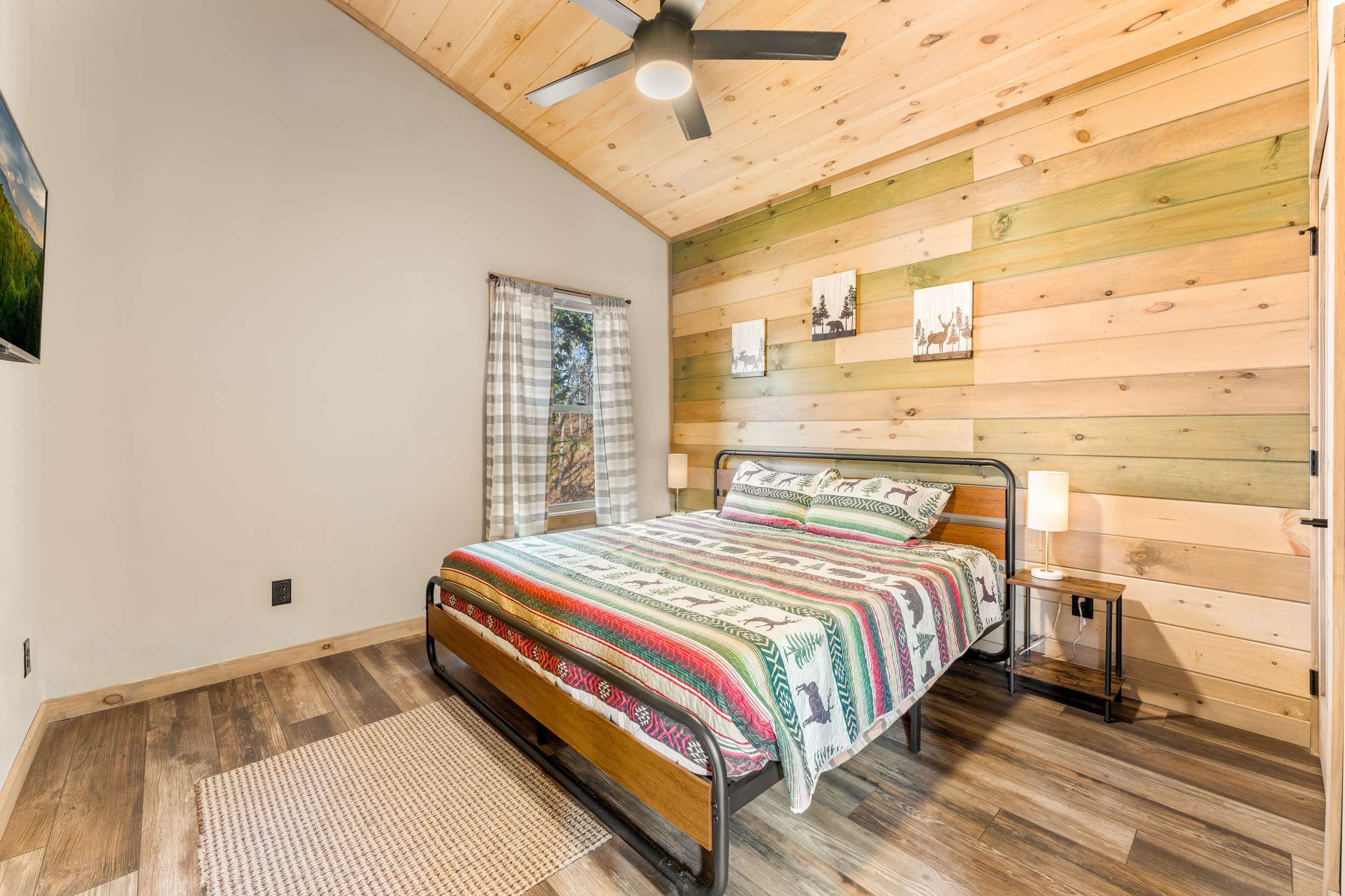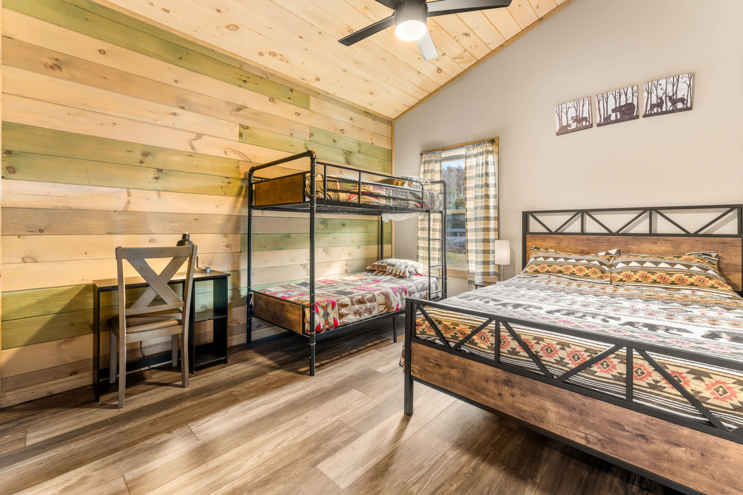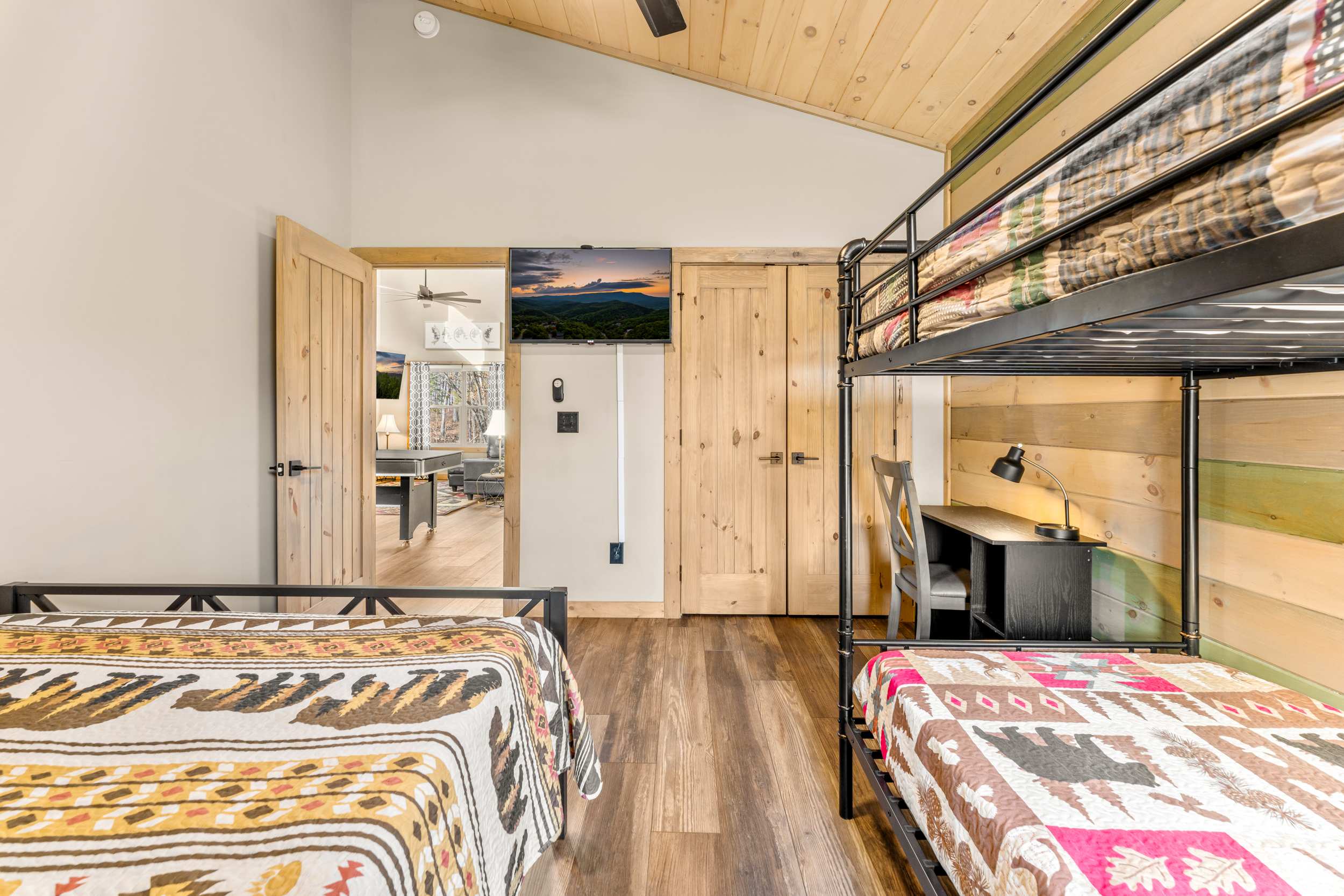 • Bedroom 2: Queen bed + twin-over-twin bunk, smart TV, desk; sleeps 4