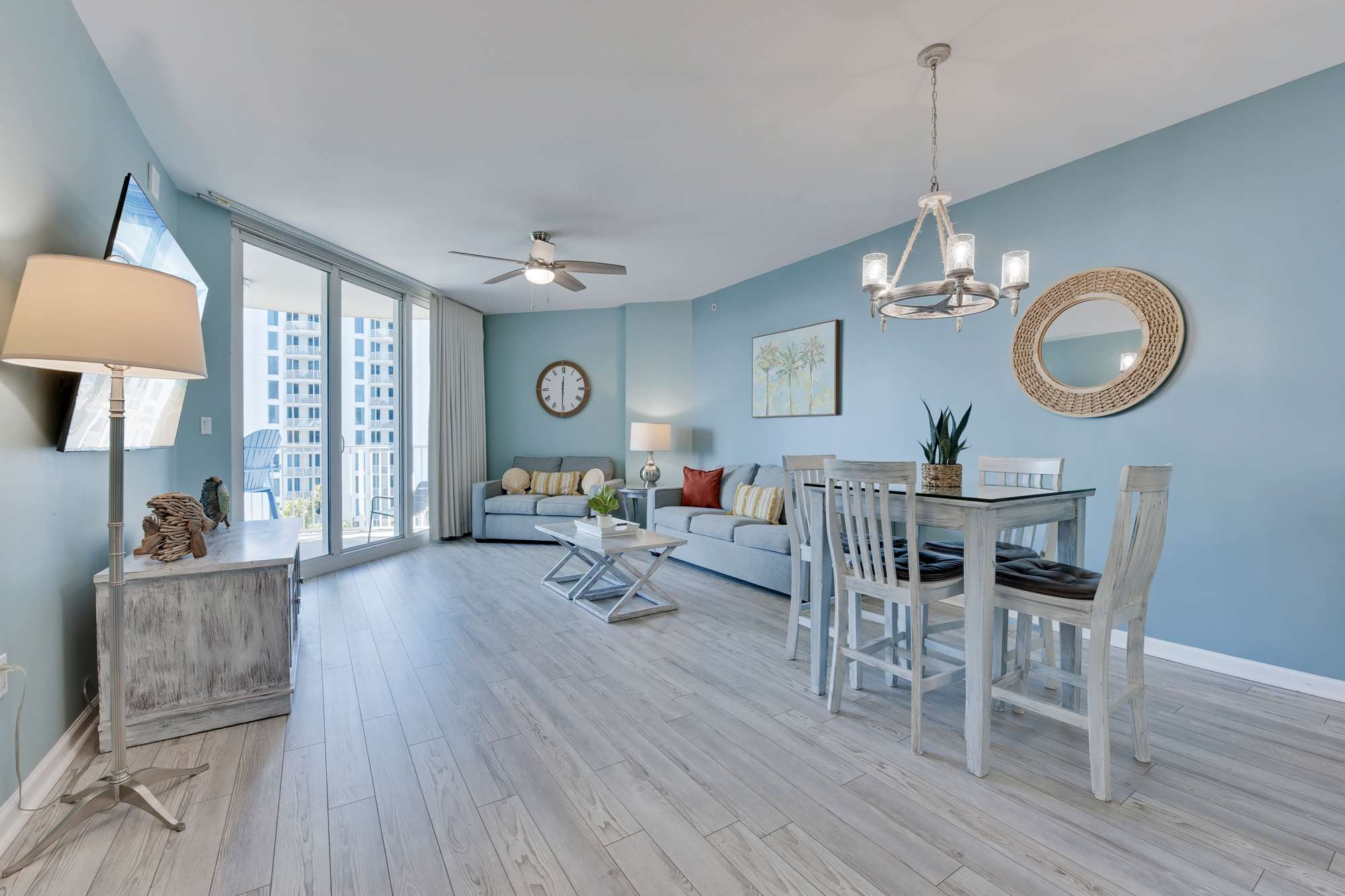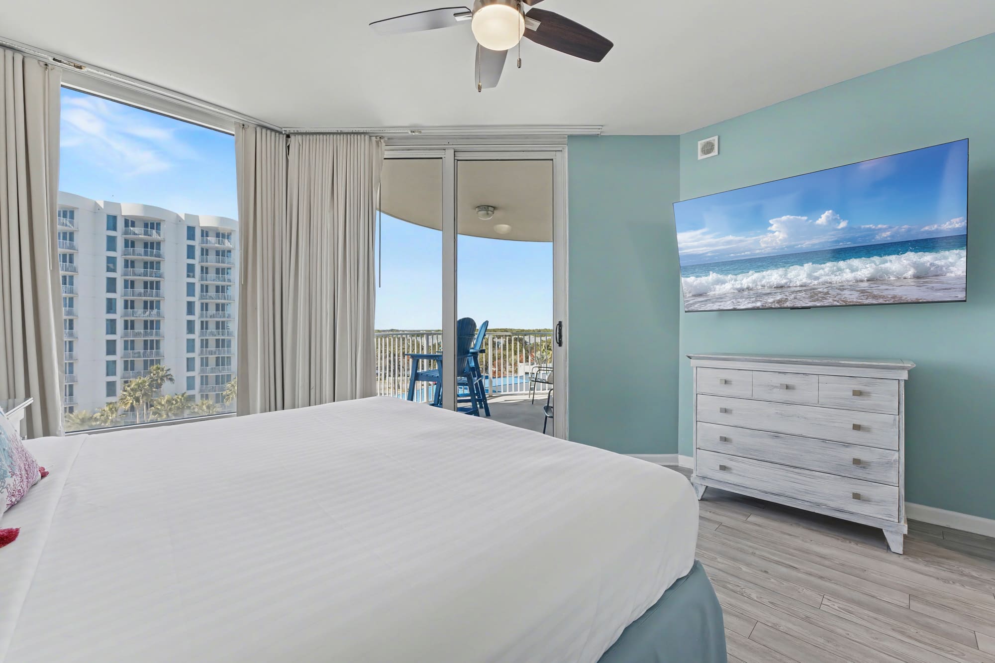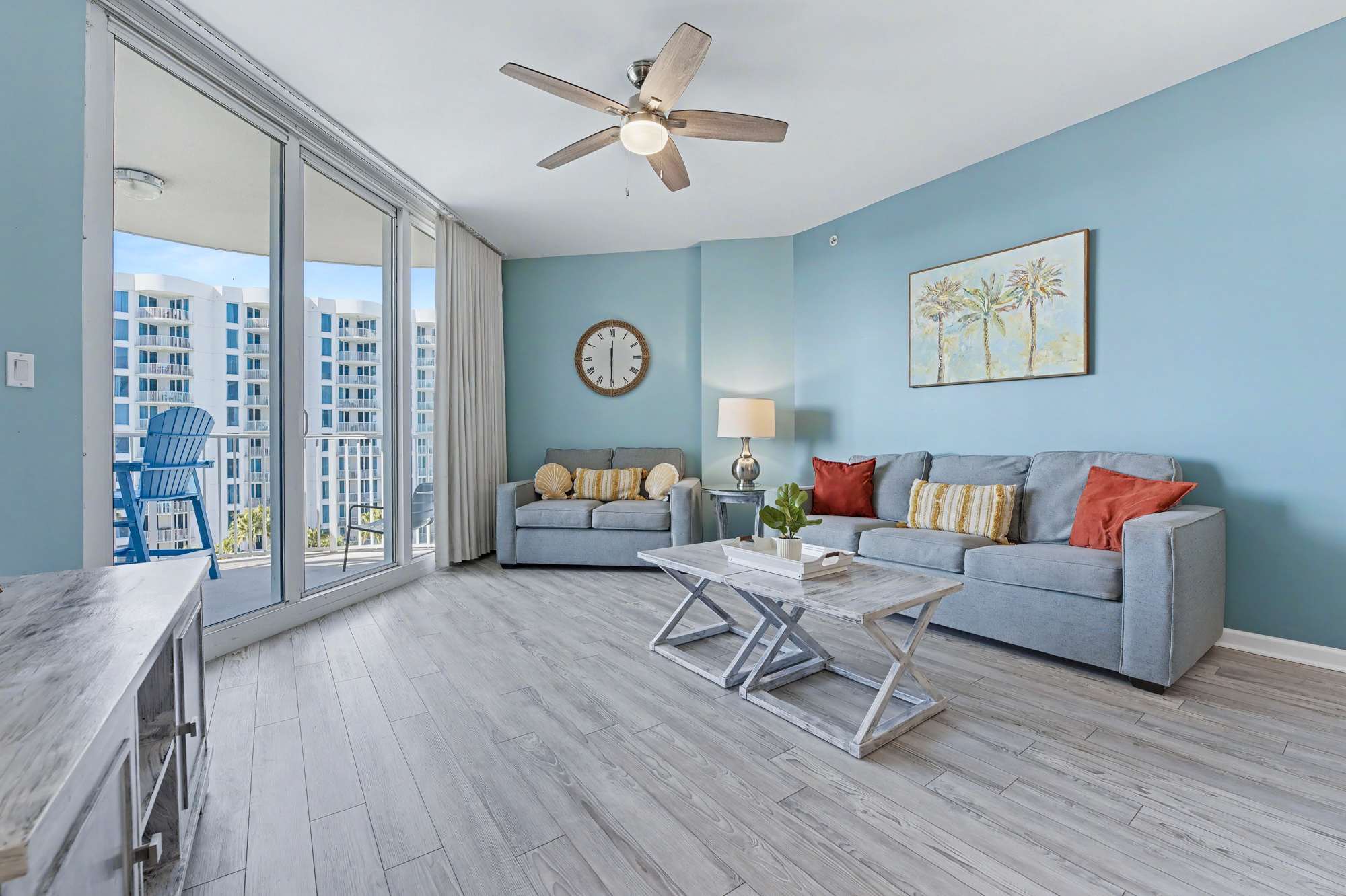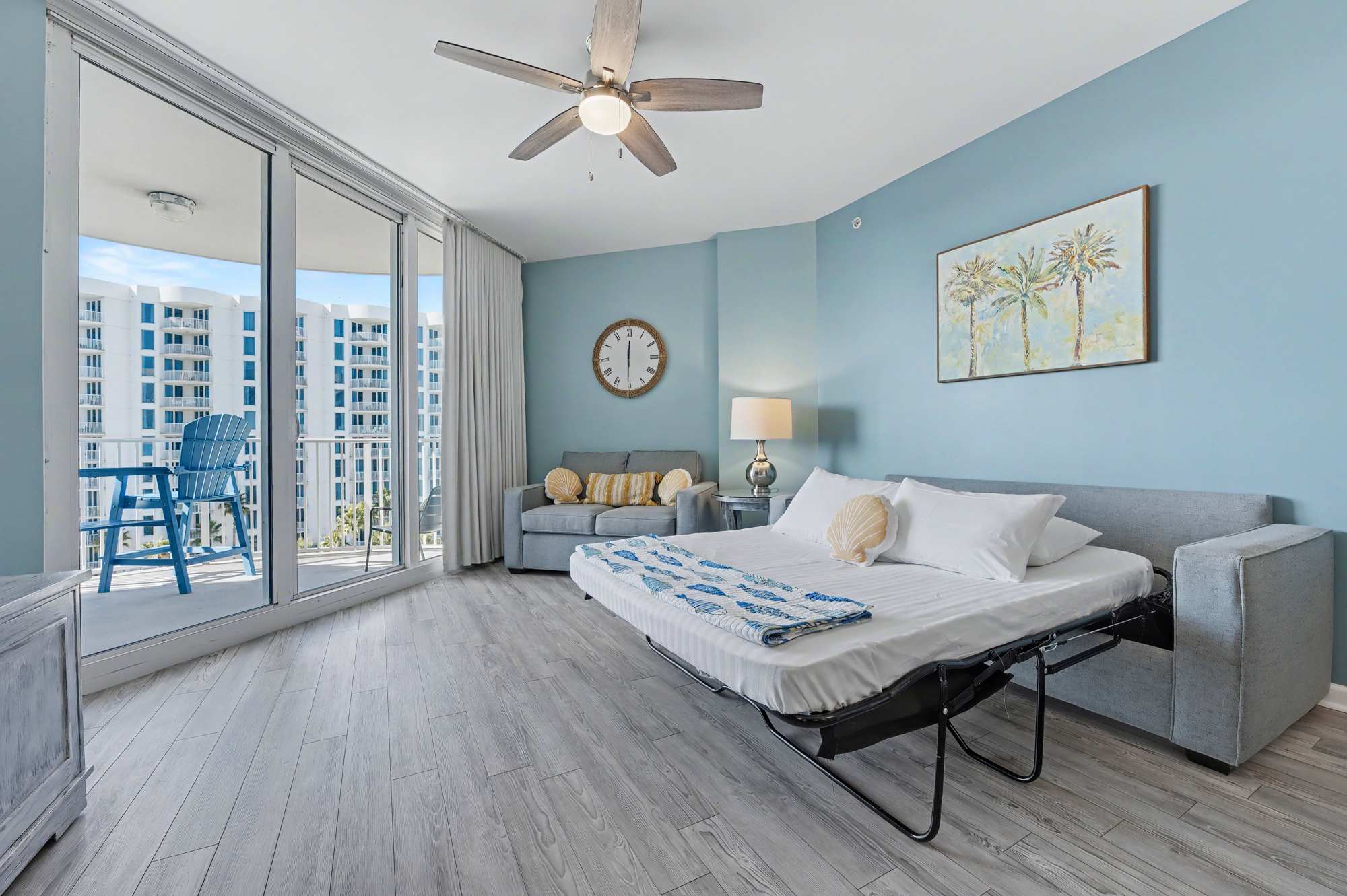 Bright and inviting, this open living area features comfortable seating, including a queen‑size sleeper sofa, love seat, a large smart TV with cable, and a ceiling fan for added comfort. Coastal décor—highlighted by soft blue hues, beach‑inspired artwork, and warm natural accents—creates a relaxed, seaside atmosphere. Sliding glass doors fill the space with natural light and open to the private balcony, enhancing the airy, coastal feel.