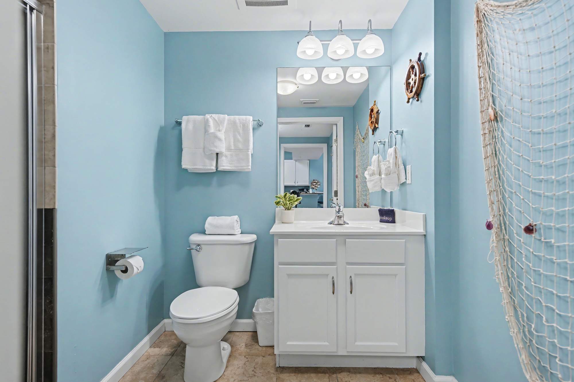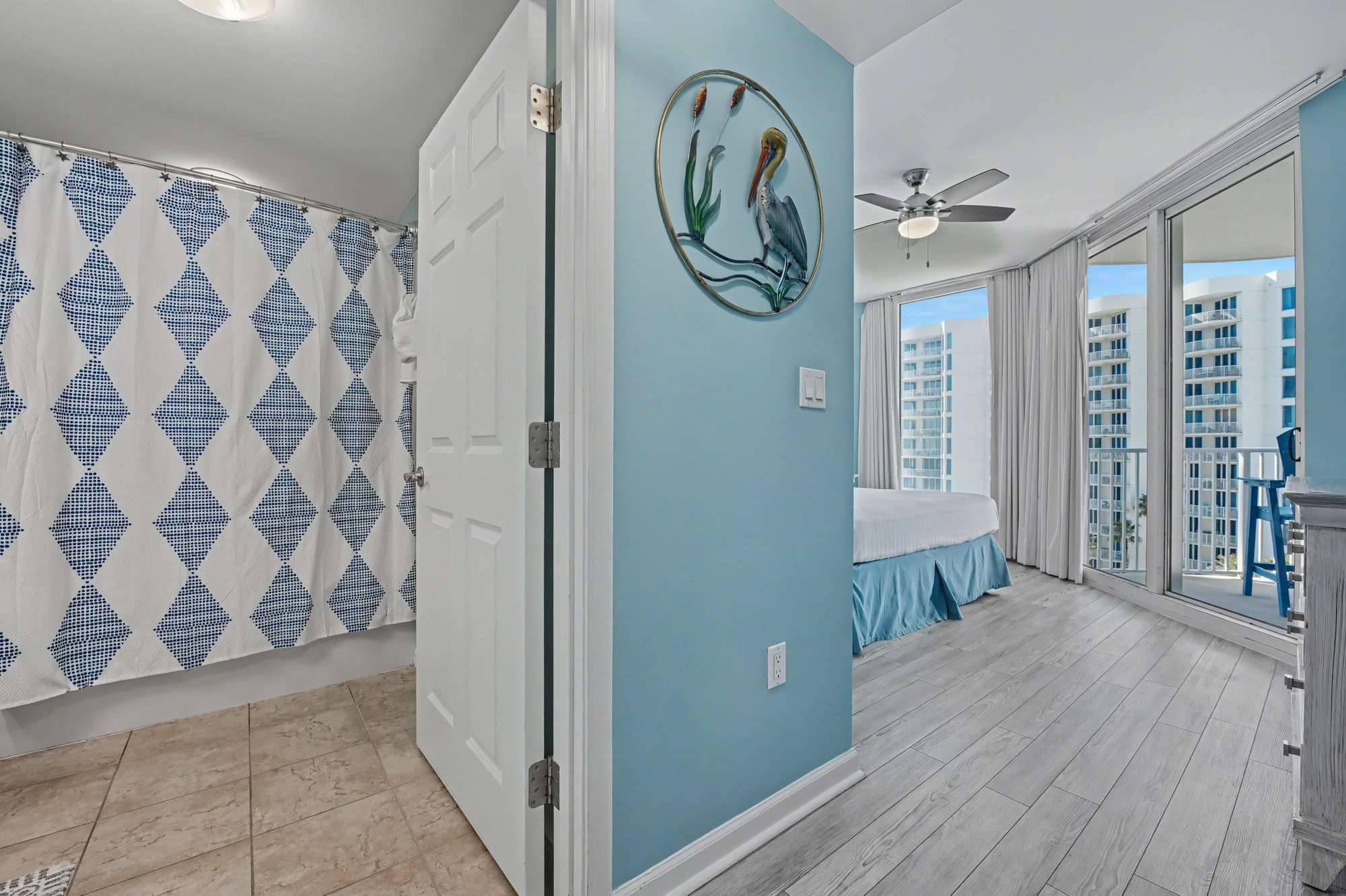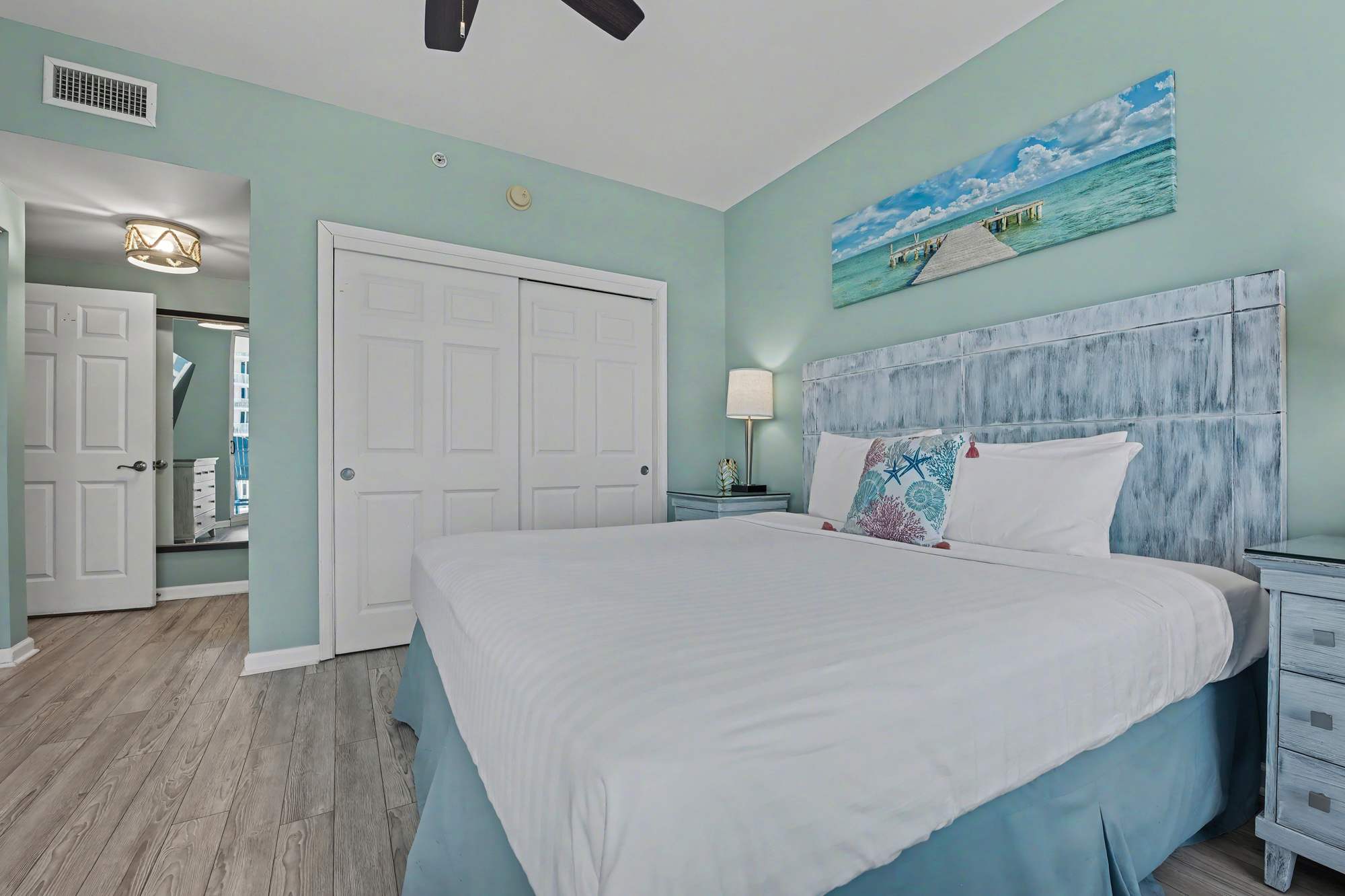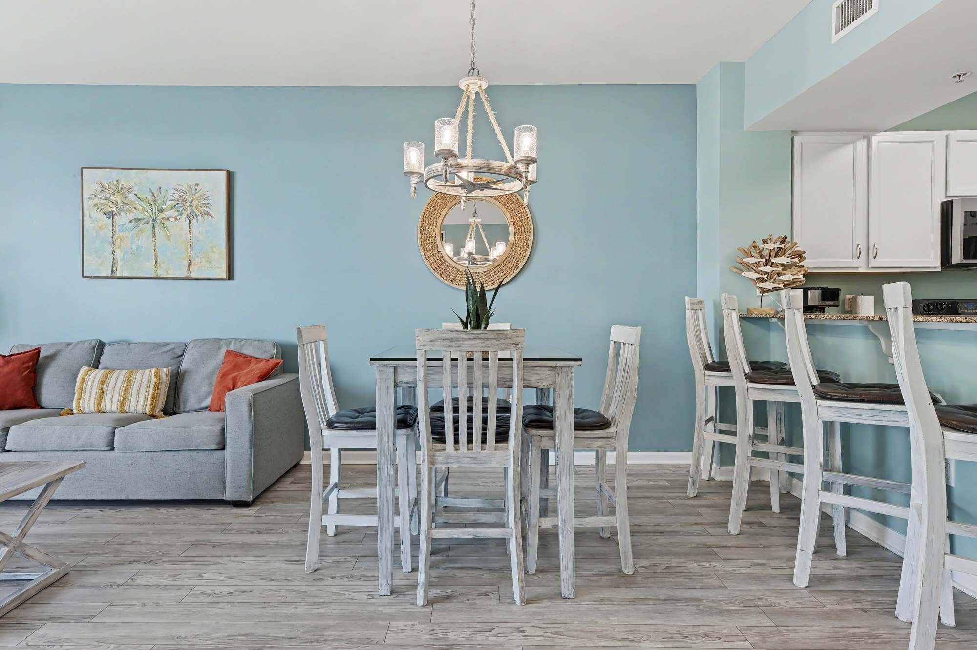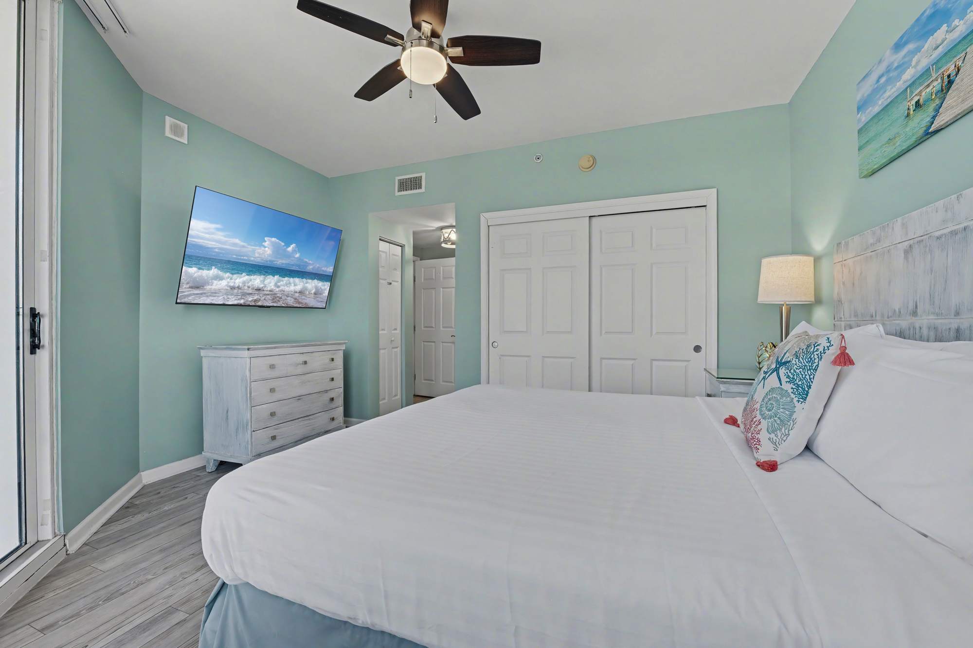 Bright and inviting, this open living area features comfortable seating, including a queen‑size sleeper sofa, love seat, a large smart TV with cable, and a ceiling fan for added comfort. Coastal décor—highlighted by soft blue hues, beach‑inspired artwork, and warm natural accents—creates a relaxed, seaside atmosphere. Sliding glass doors fill the space with natural light and open to the private balcony, enhancing the airy, coastal feel.