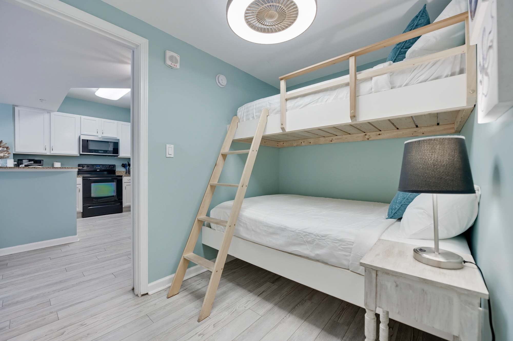 Features twin‑over‑full bunk beds, making it an ideal space for kids, along with a ceiling fan for added comfort. The room also includes an ensuite bathroom with a single vanity and a walk‑in shower. For added convenience, the in‑unit washer and dryer are located here, making laundry during your stay quick and easy.