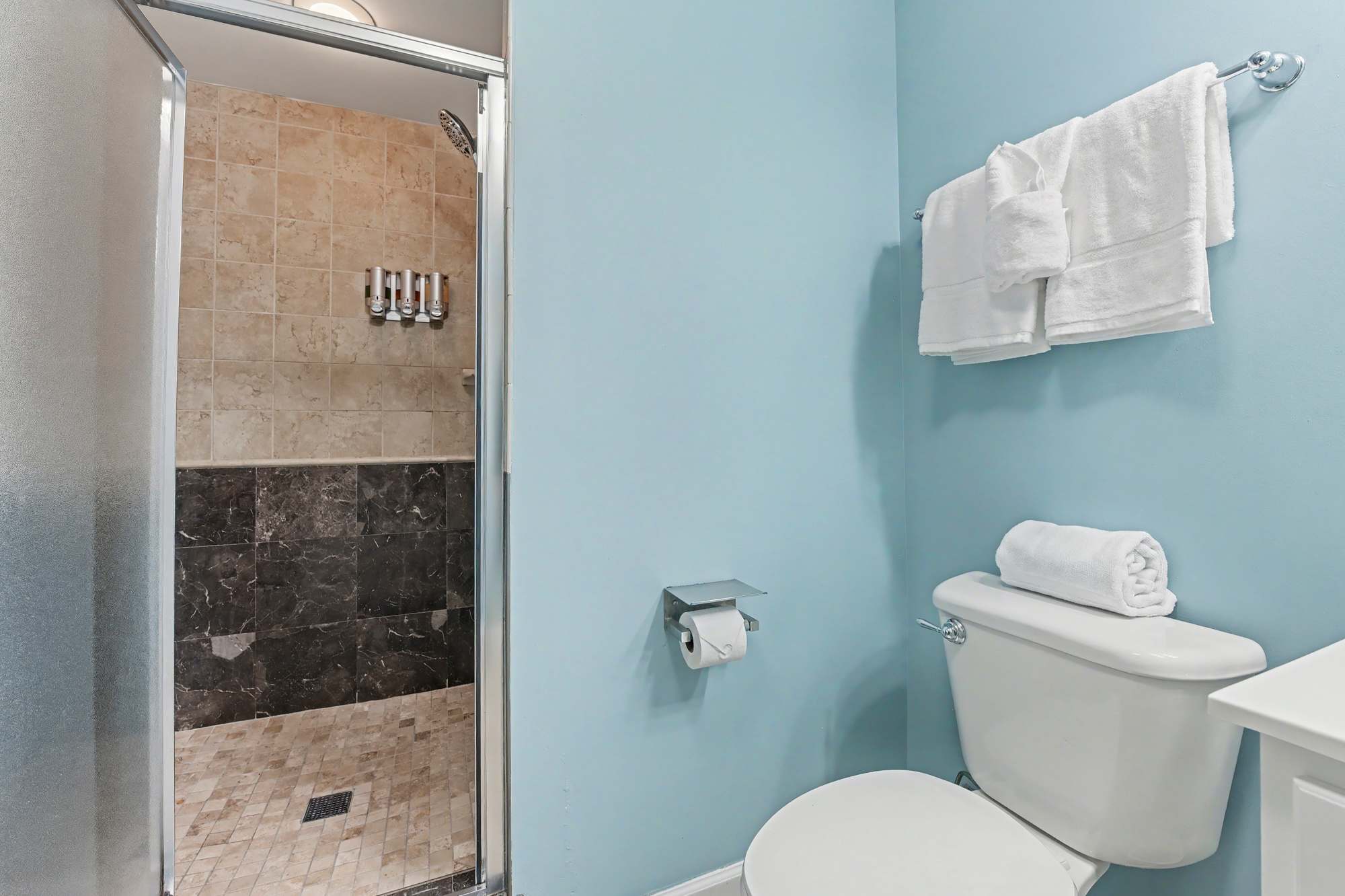 We provide a starter supply of essentials to help you settle in comfortably. In each bathroom, you’ll find travel-size body wash, body bar, shampoo, conditioner, lotion, and two rolls of toilet paper. In the kitchen, we include one sponge, one roll of paper towels, travel-size liquid dish detergent, one packet of dishwasher detergent, and two trash bags per trash can.