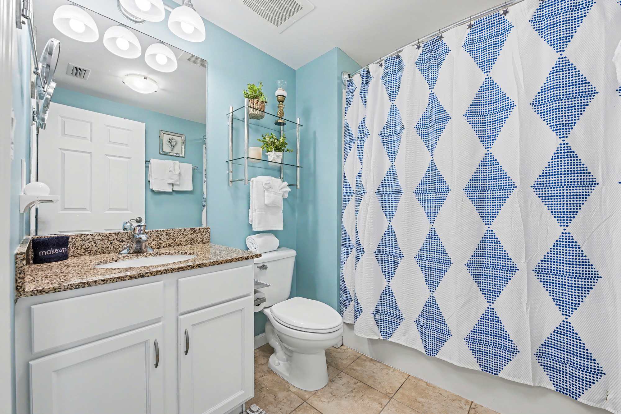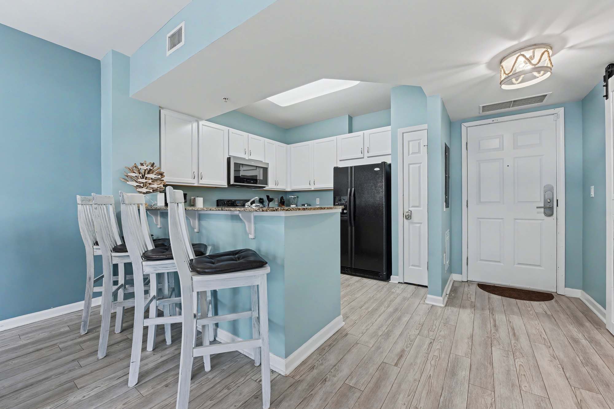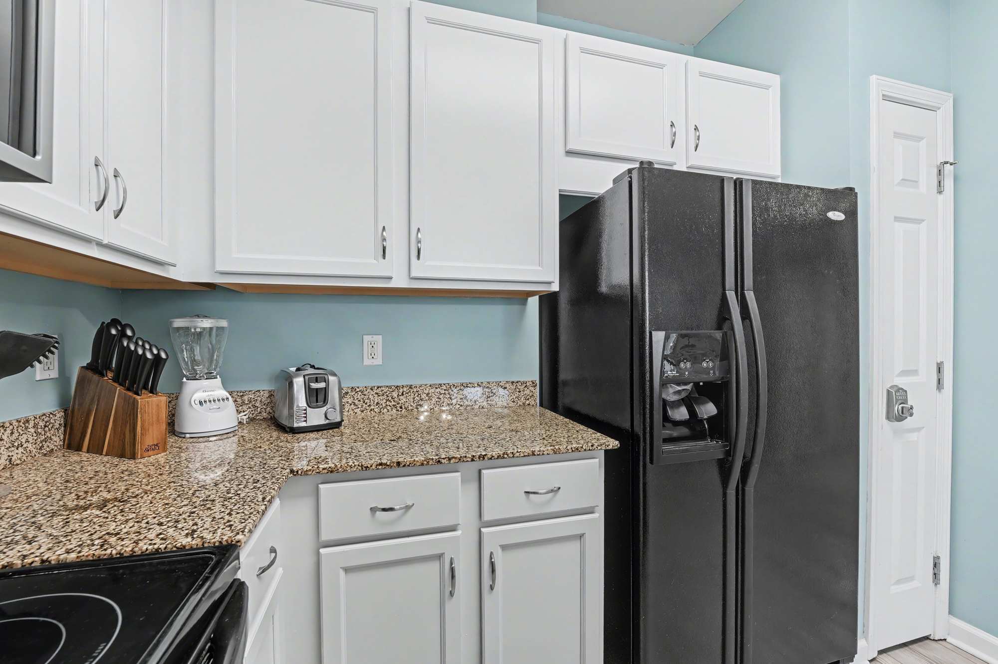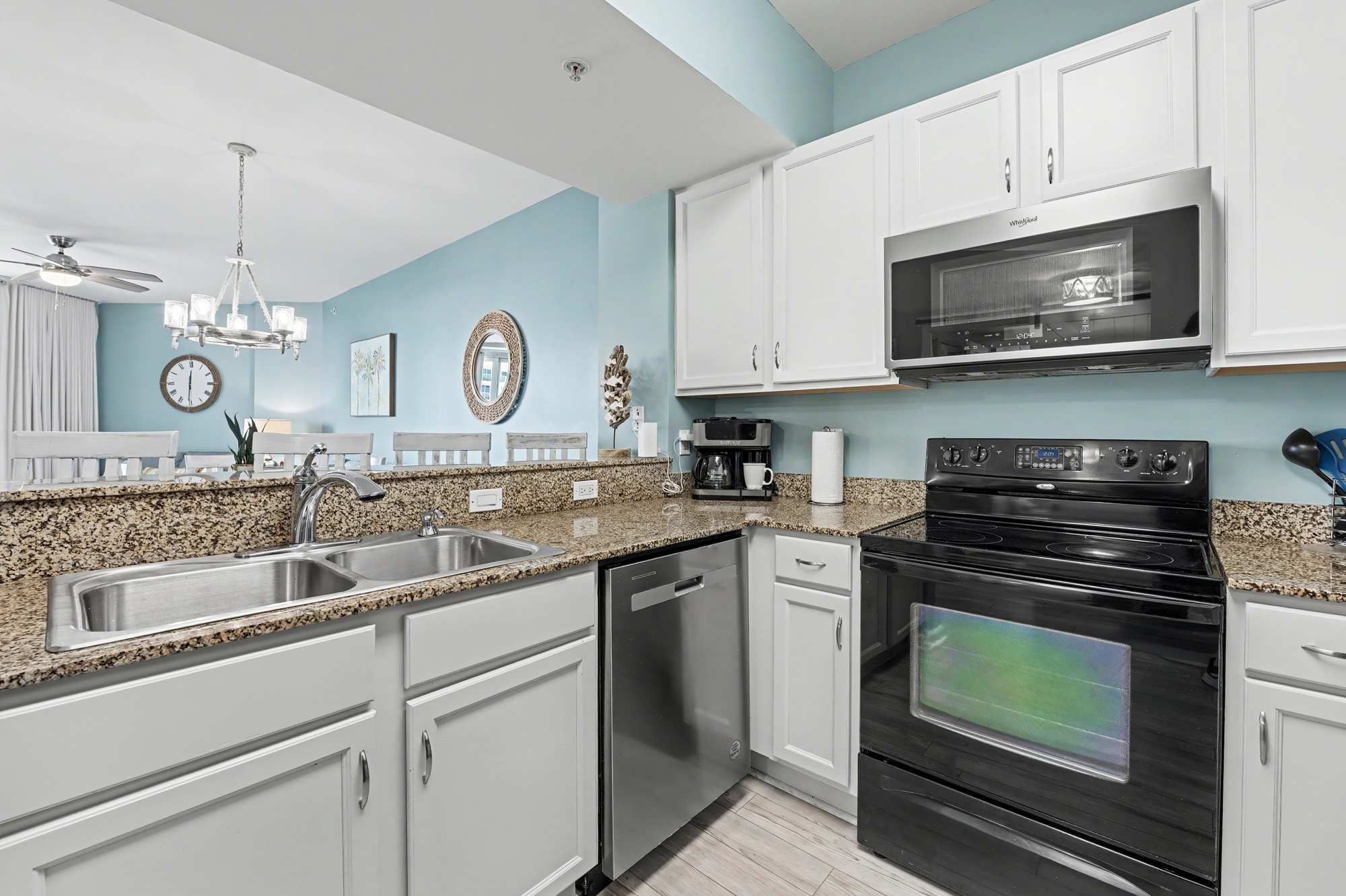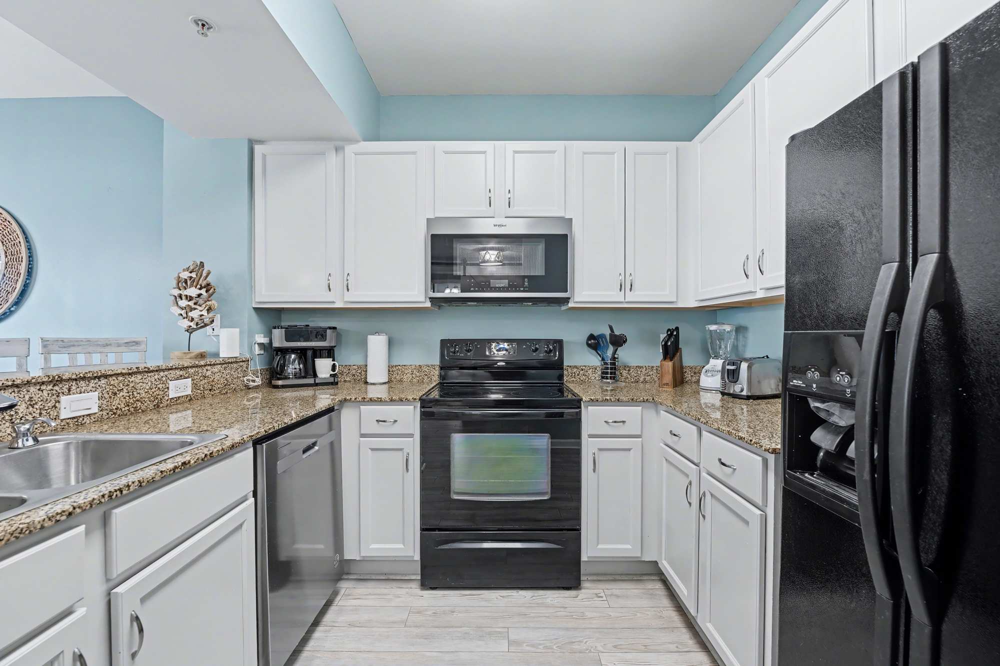 As you step into the unit, you’re welcomed by a bright, fully equipped kitchen designed for both convenience and style. Crisp white cabinetry, granite countertops and modern black appliances include a full‑size refrigerator, stove, microwave, and dishwasher. The kitchen is stocked with essential cookware and utensils, features both drip and single‑serve coffee options, and offers ample counter space—making it easy to prepare meals or snacks during your stay.