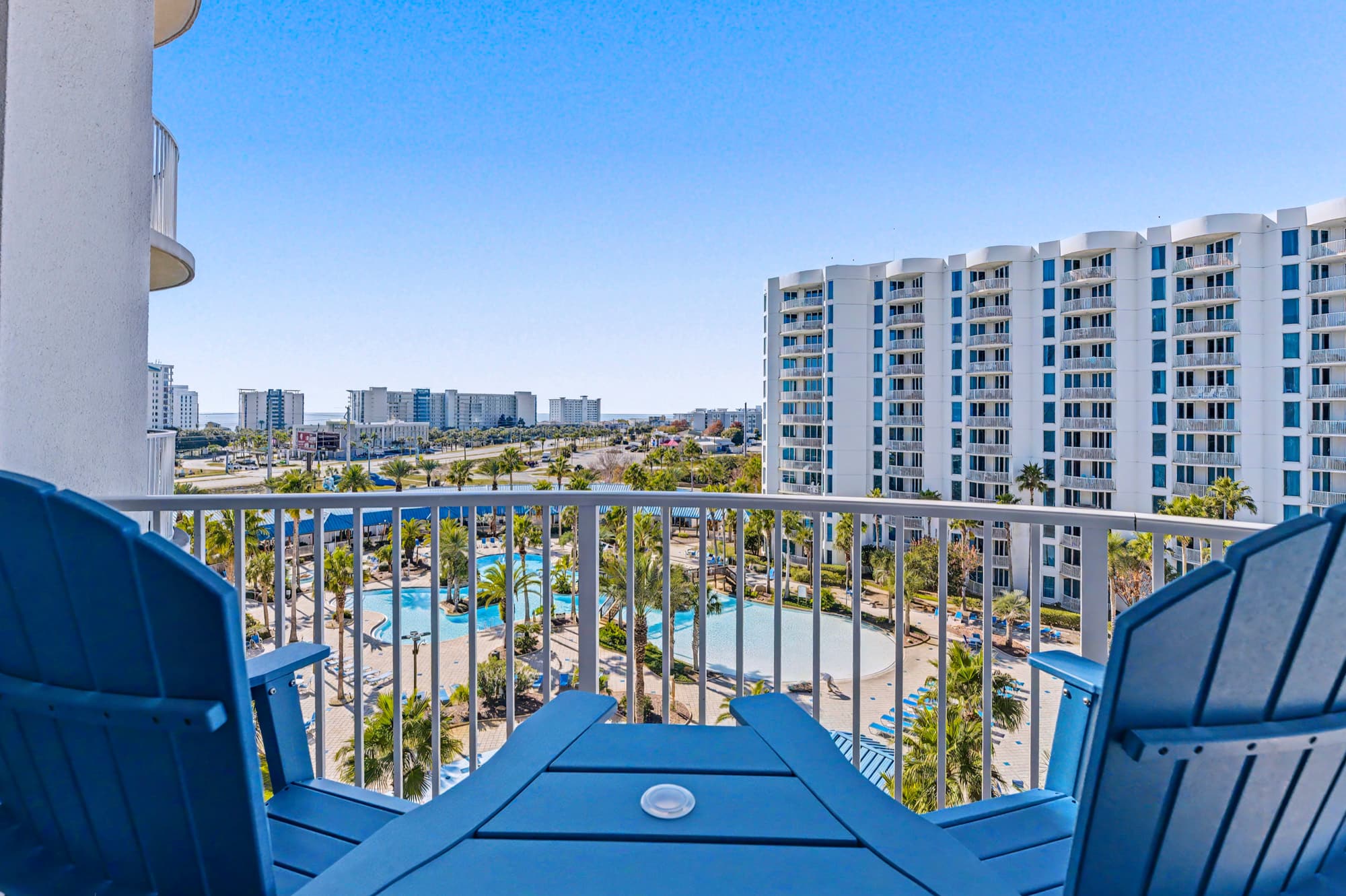 Just off the living area, sliding glass doors lead directly onto a private balcony with a high‑top table for two. It’s the perfect spot to enjoy your morning coffee while taking in views of the water and the lagoon‑style resort pool, with partial Gulf views in the distance.