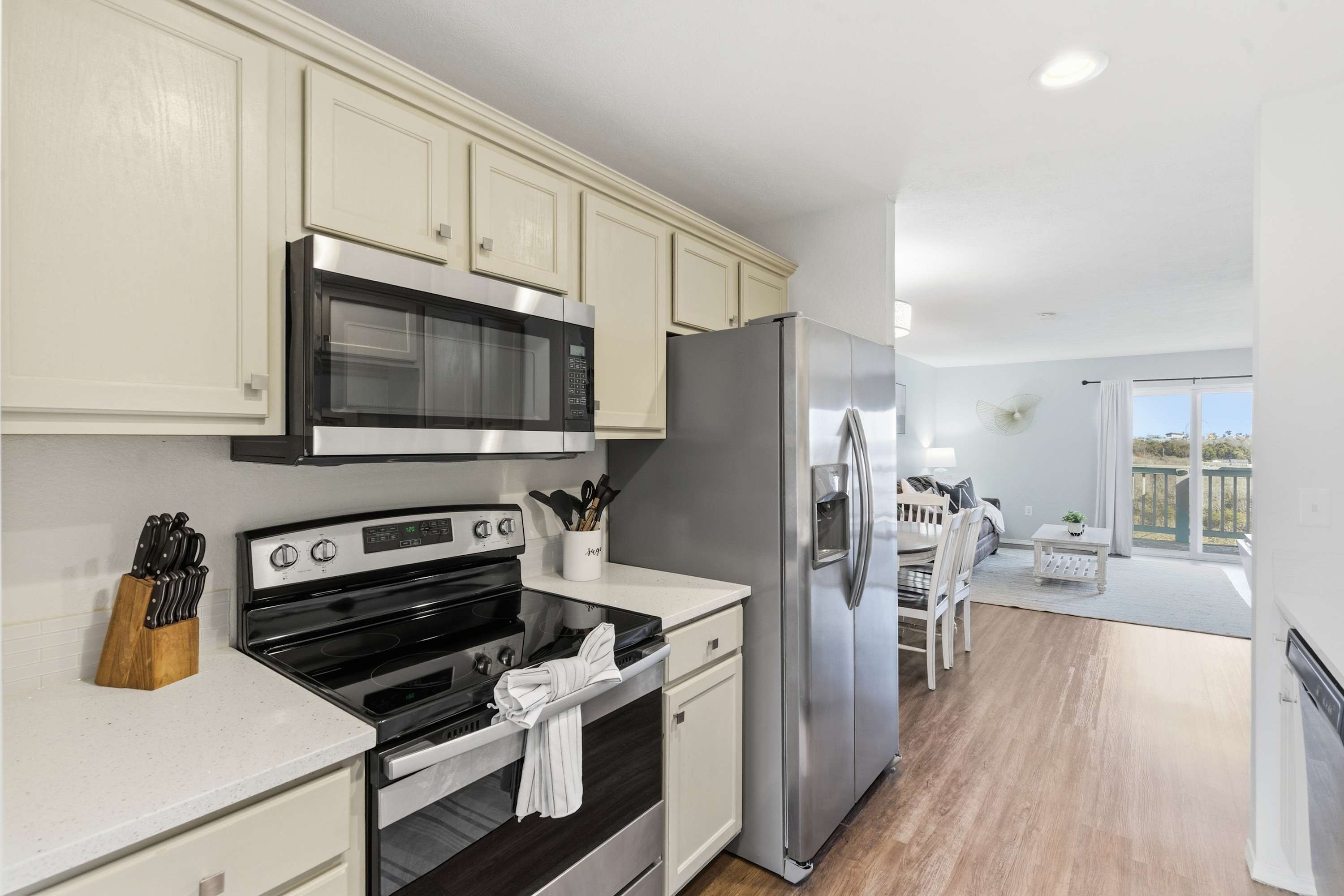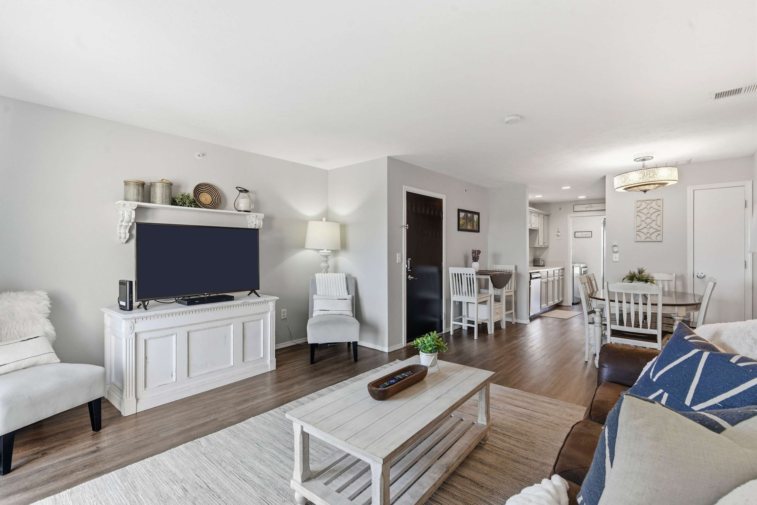 Step inside to a warm, welcoming living space designed for comfort after a day of exploring. The living room features a cozy couch and chair arranged around a smart TV, creating an inviting spot for movie nights or casual downtime. The bright kitchen is both stylish and functional, showcasing crisp white counters and cabinetry paired with stainless steel appliances—perfect for preparing everything from quick breakfasts to full family meals. Gather around the main dining table for six or enjoy more intimate meals at the additional table for two. Step out onto the private balcony, where comfortable seating and peaceful treetop views create the perfect backdrop for morning coffee or unwinding in the evening. With its spacious layout, serene setting, and unbeatable location, Ozark Viewpoint Retreat for 8 is a Branson getaway you’ll be excited to call home.