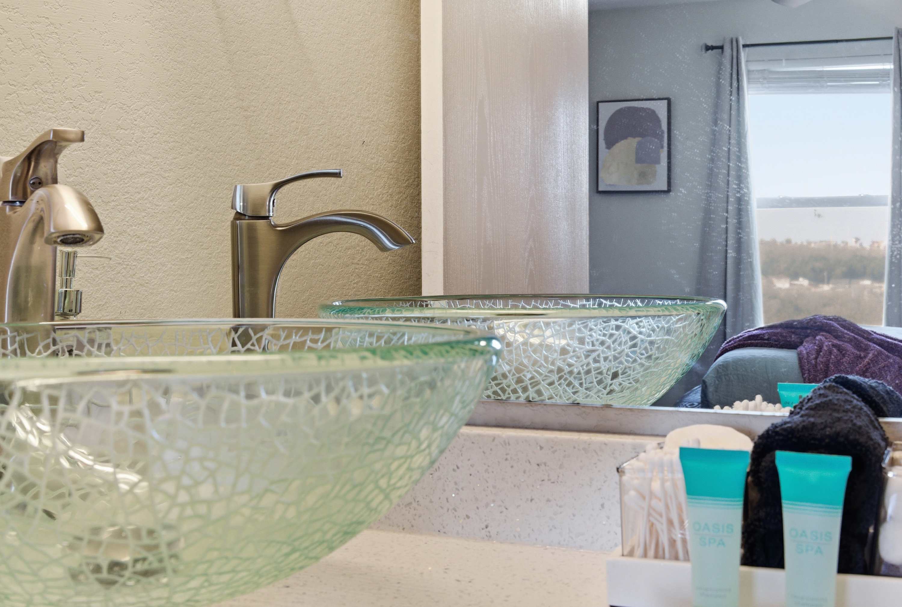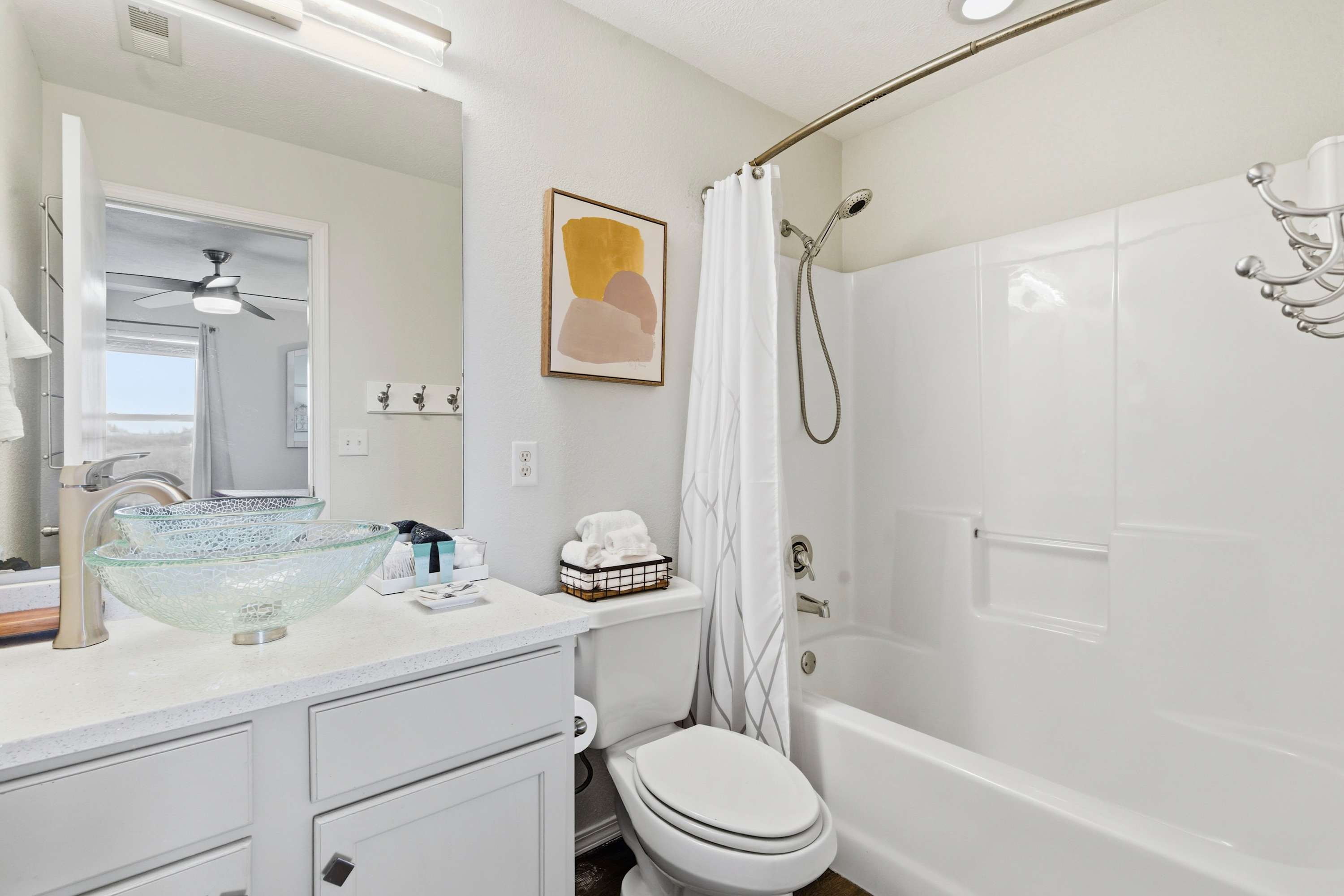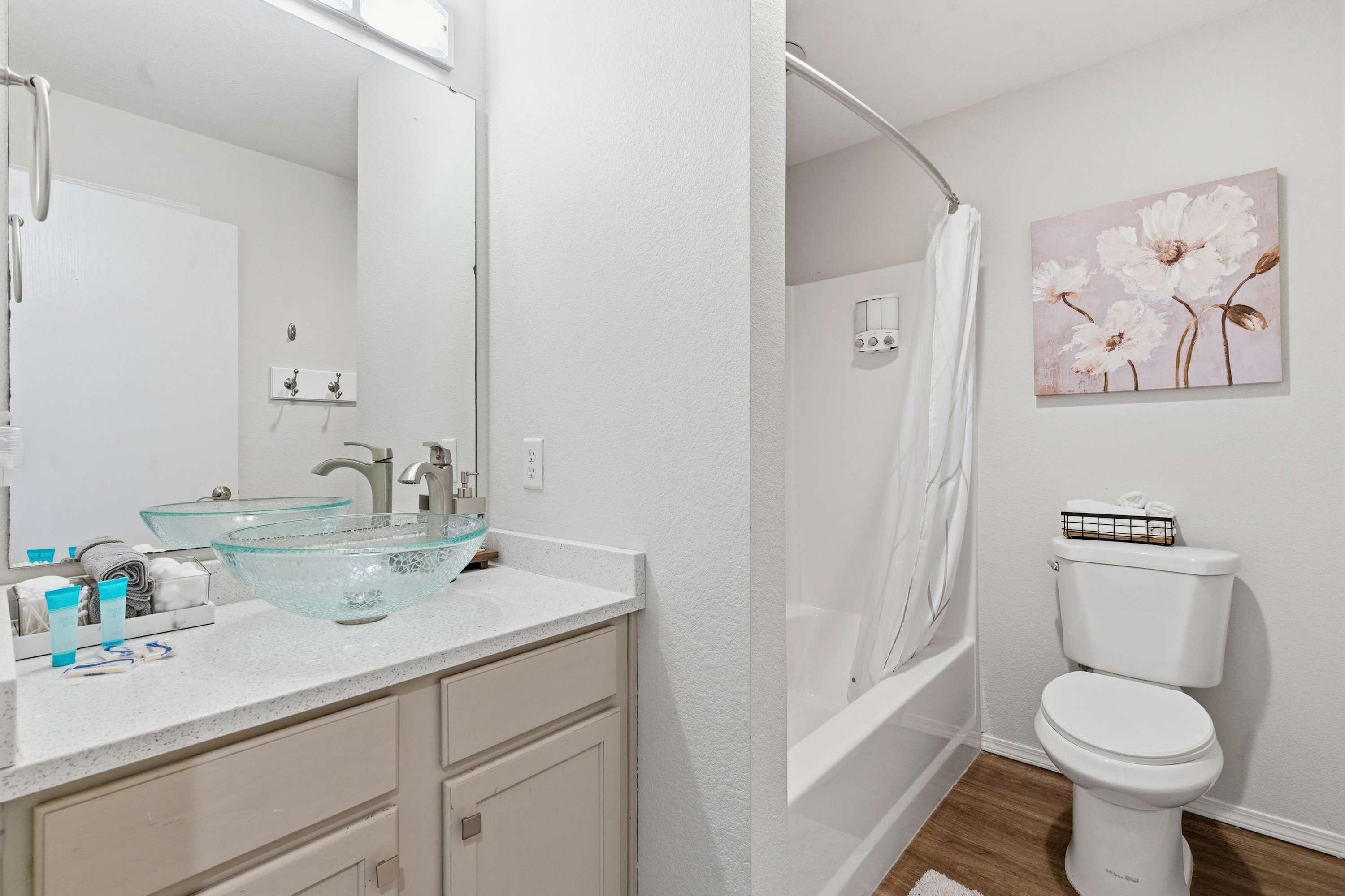 This home also includes a full guest bathroom with a single vanity and a shower/tub combo.
