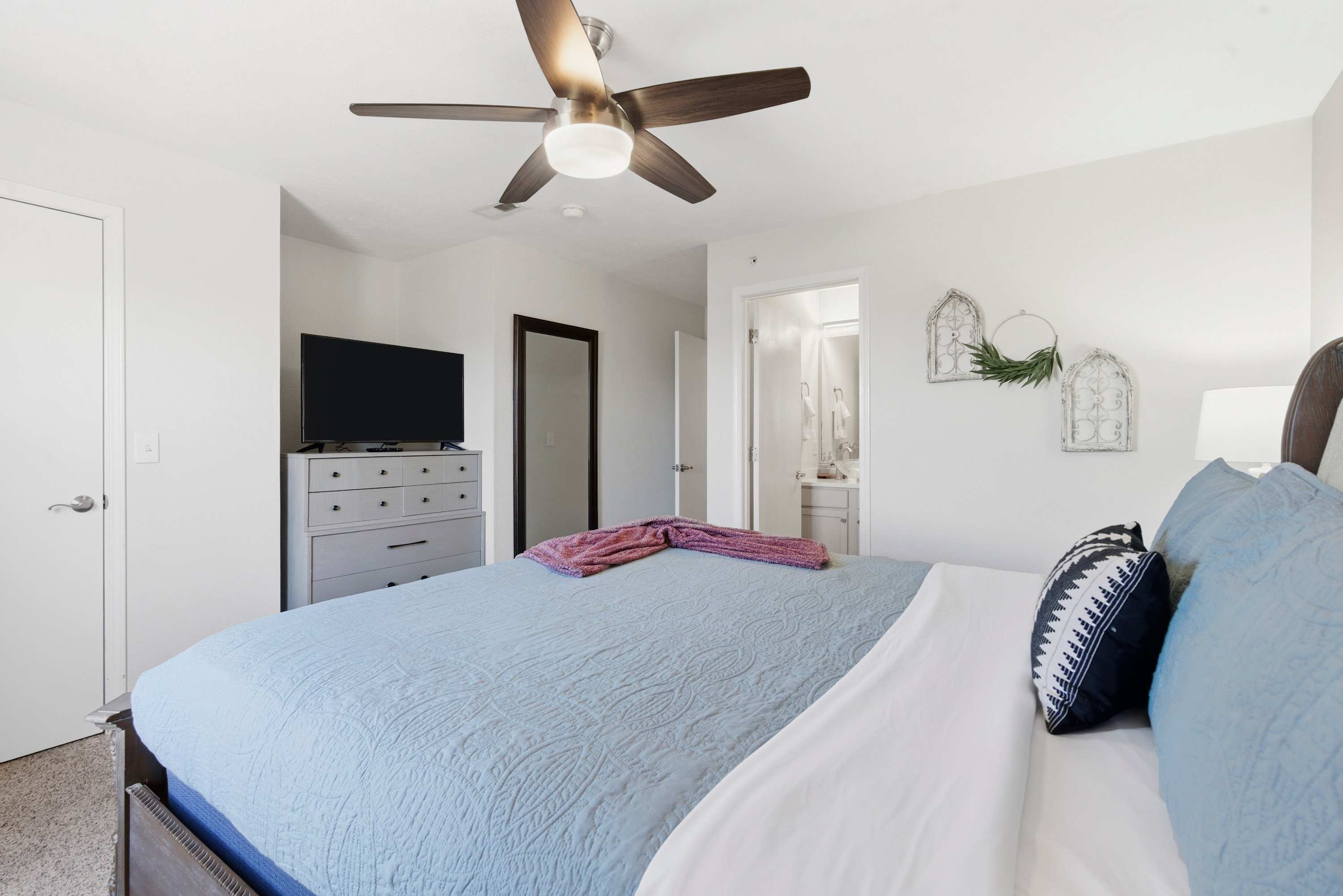 Bedroom #3 includes a king size bed, a smart TV, and an ensuite bathroom with a single vanity and a shower/tub combo.